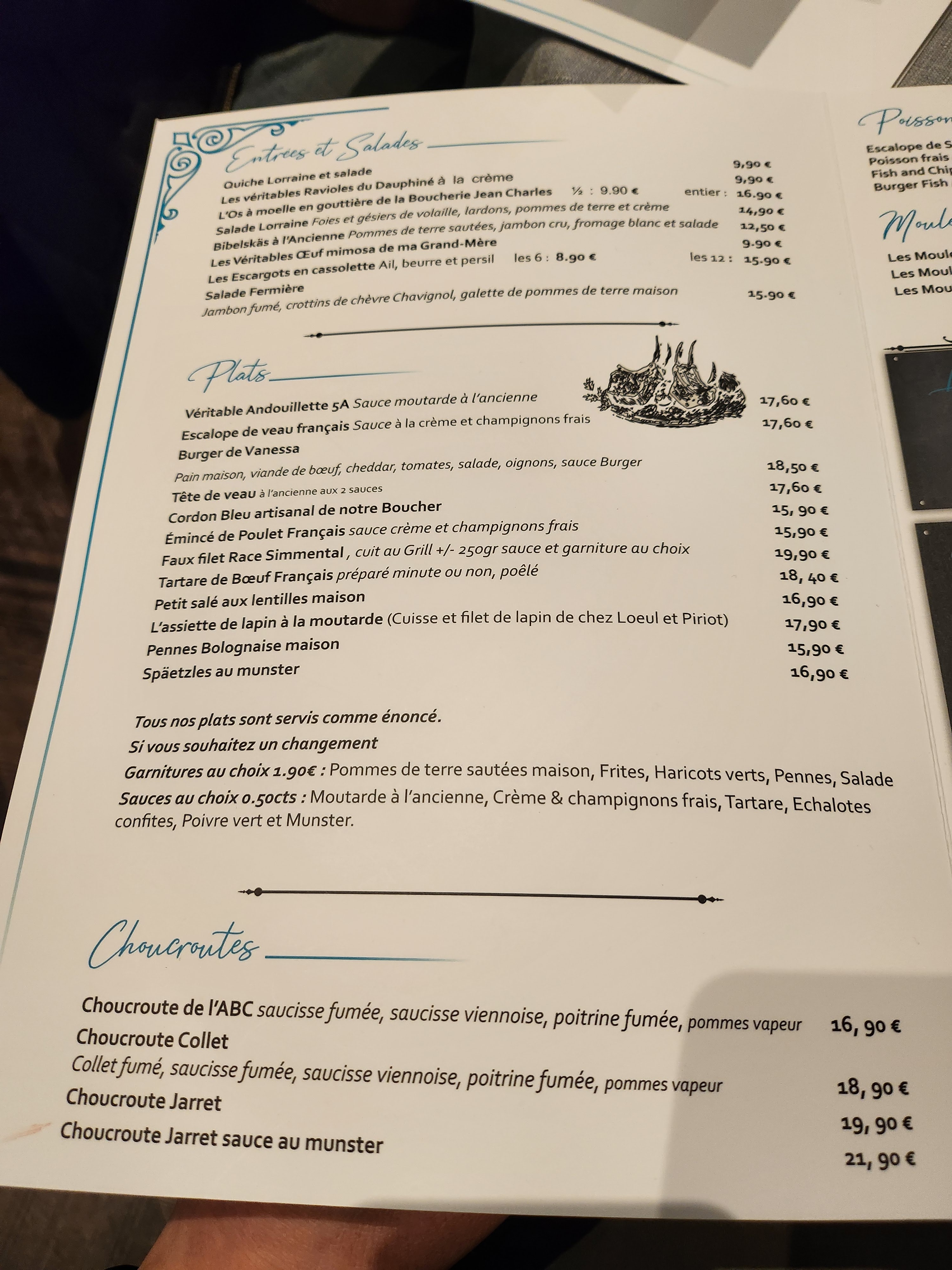 Bon lĂ c'est pas foufou, la choucroute collet avec un quart de saucisse Ă 19,90 ⏠et peu de choux. Ćuf mimosa Ă 9,90. Le pain servi est coupĂ© trop en avance et donc sec. Dommage ça fait cher pour ce que c'est