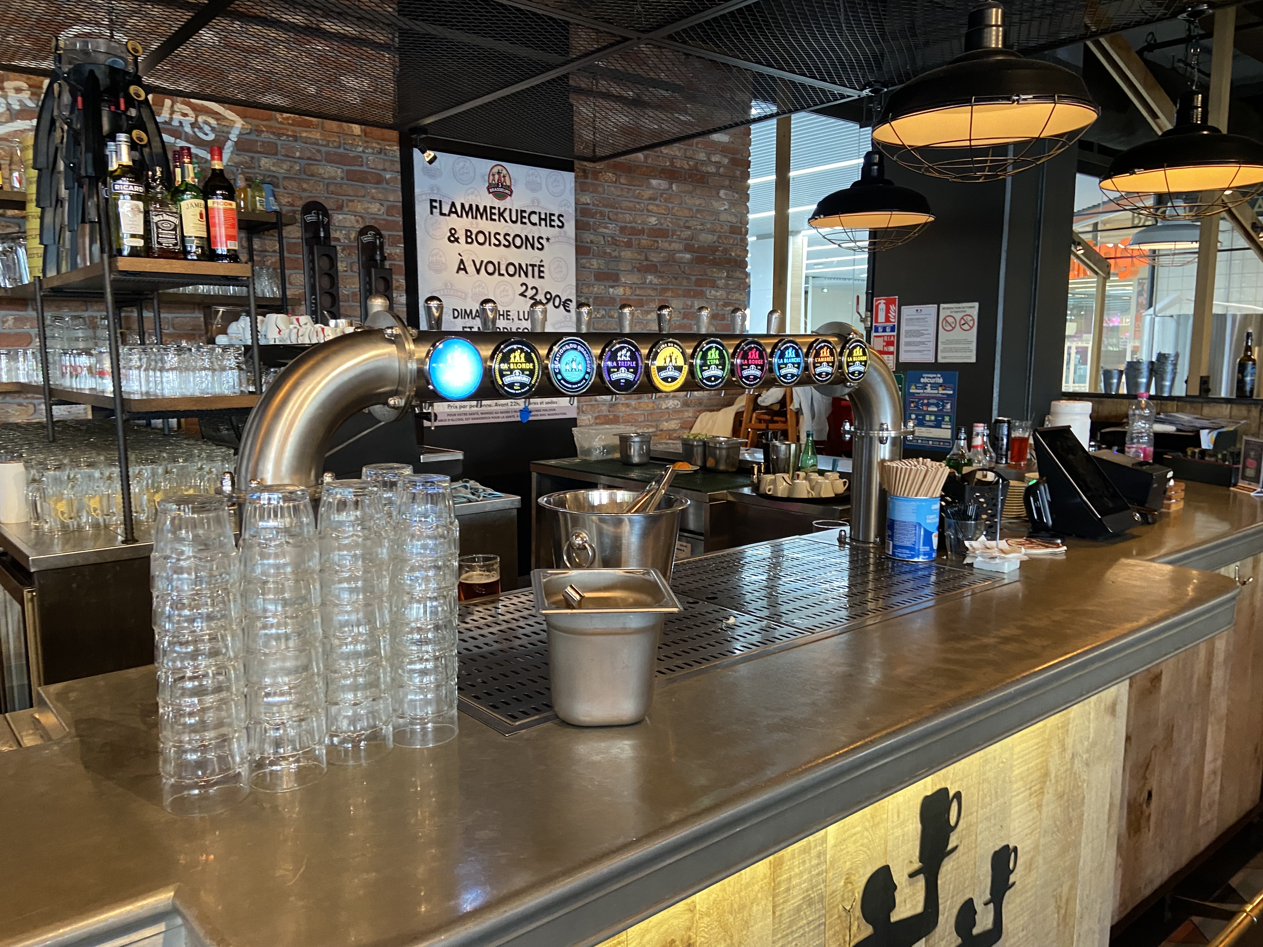 Soirée boissons et flammenkuche à volonté. Cette formule est intéressante car pour 23€, on peut boire (hors cocktails) et manger à volonté. Les plats étaient bons par contre nous avons attendu assez longtemps pour être servi et pour recommander. Il y a beaucoup de monde et c'est assez bruyant. Nous vous conseillons de réserver et de prévoir que tous les adultes vont devoir prendre la même formule autour de la table.