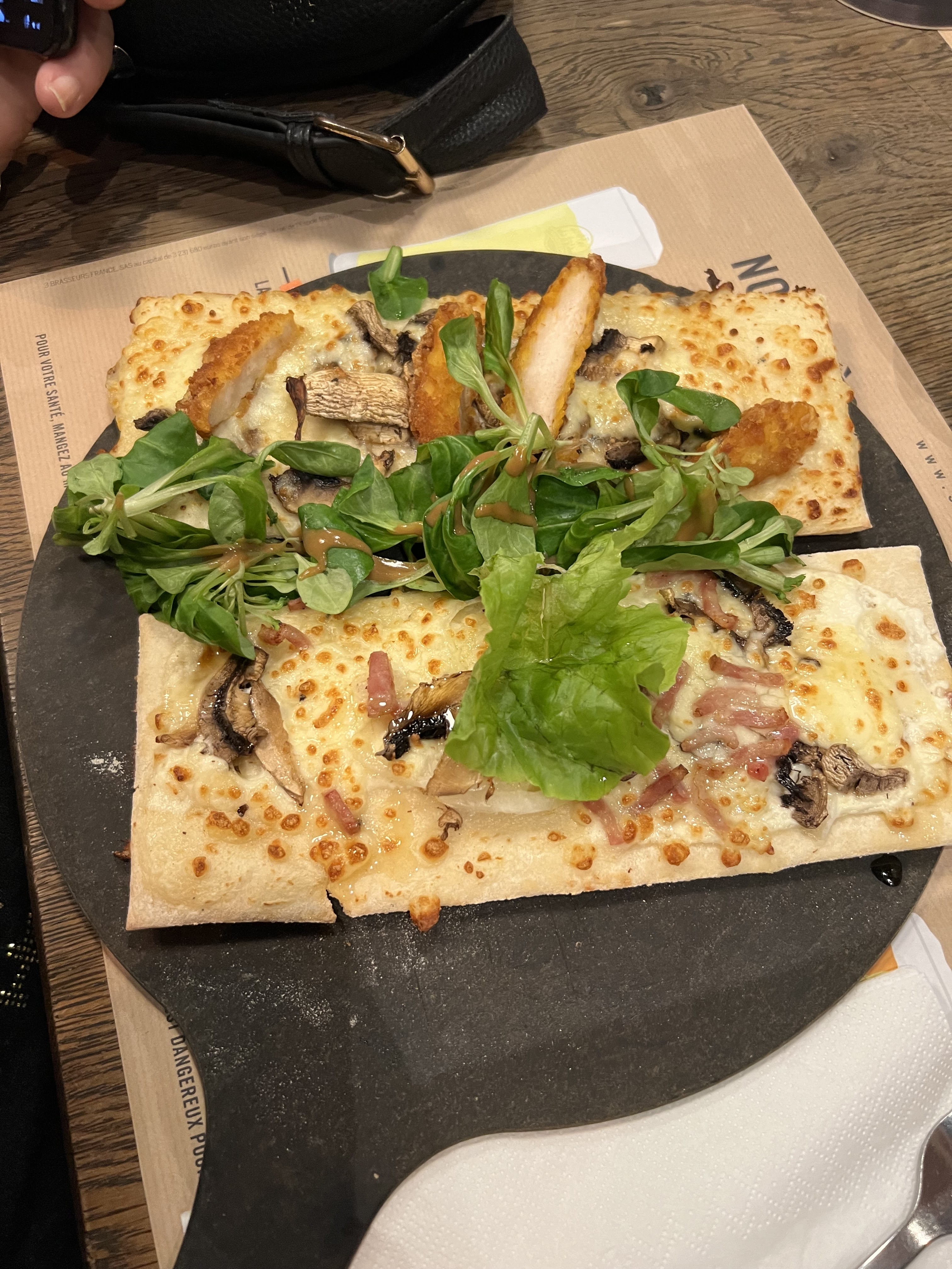 Déçu par le repas, on a partagé 2 flammekuech, le poulet pané avait des morceaux de cartilage, le chèvre n'avait pas de goût, le miel n'était carrément pas bon et la mâche n'était pas rincé, elle croquait..... Une amie avait pris un burger mais la sauce qui le recouvrait était froide du coup retour en cuisine. Le service était cependant très bien.