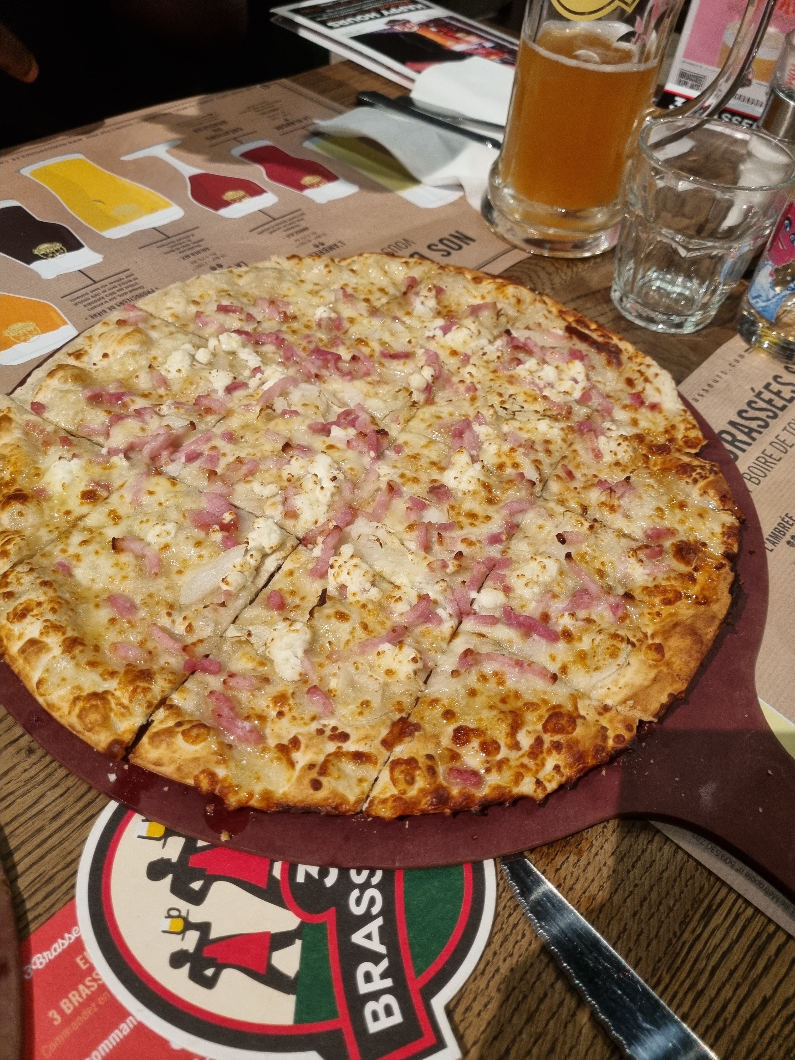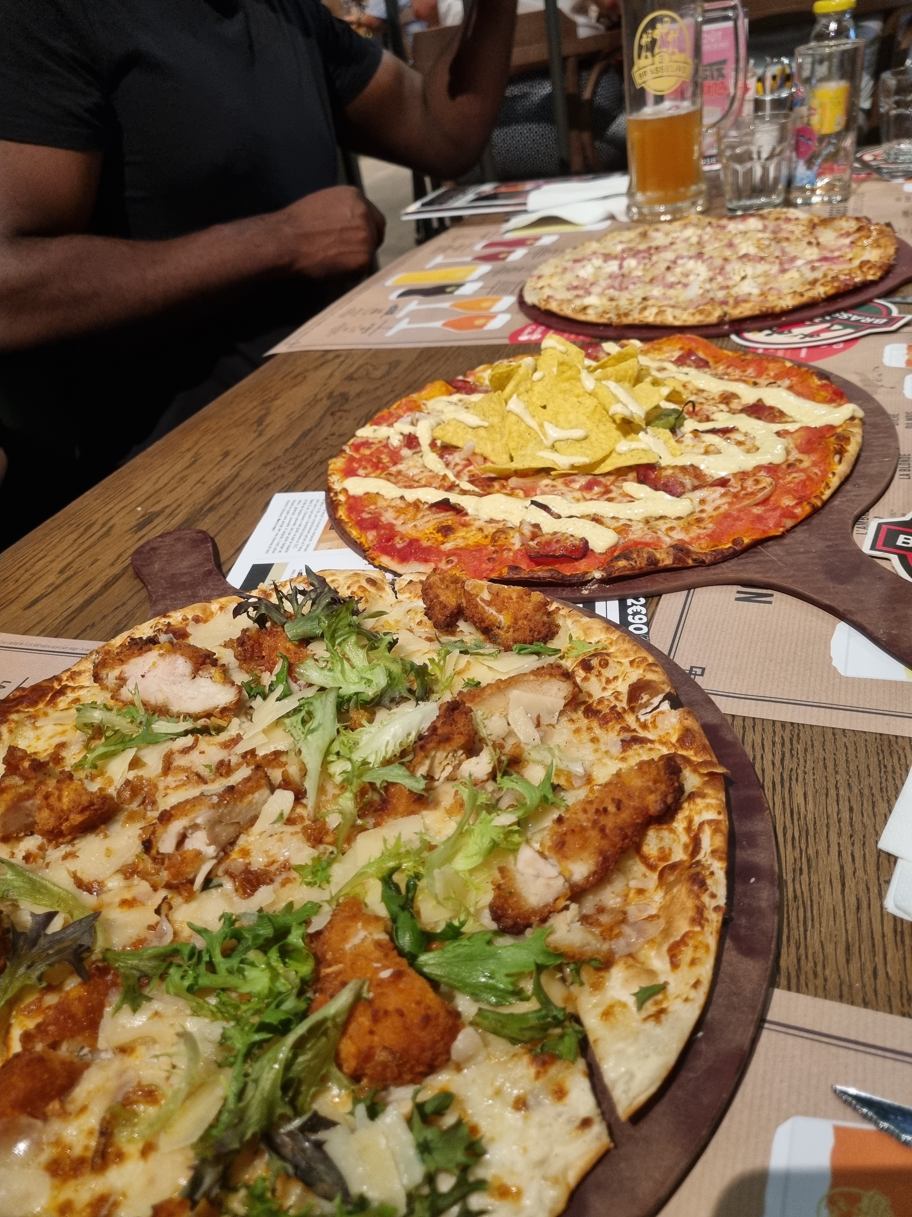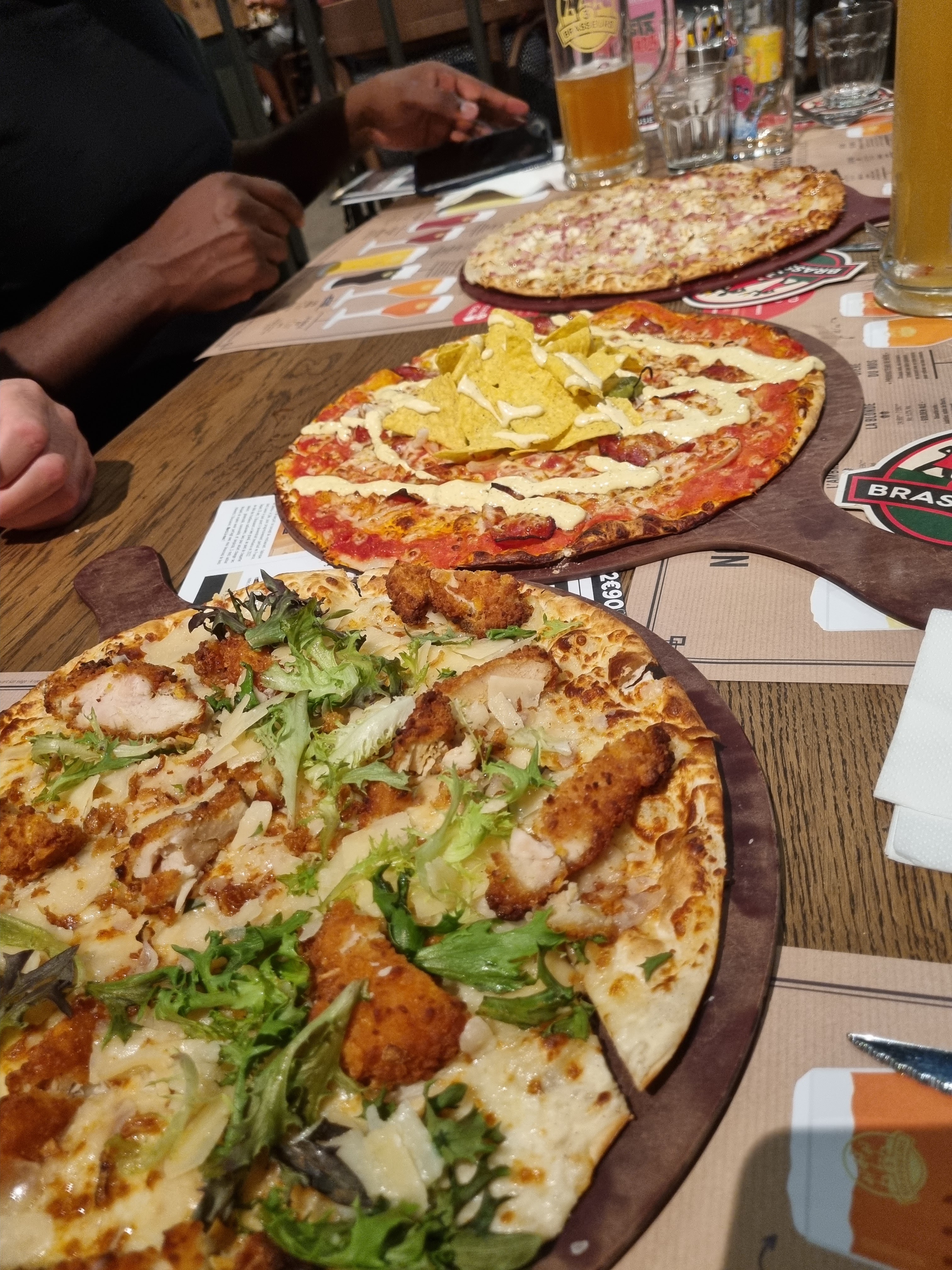 Nous avons manger le midi aux 3 brasseurs, nous avons pris une flam brie et une TARTI FLAMME CAESAR ET SALADE 15,90€ le plat et franchement cetais ridicule… rien à manger encore faim après. En suite nous allons payer, le serveur, récupérerais sur les tables des clients parti les pains non consommé et les remettais dans la panière a pain pour les servir a d’autre clients… vive l’hygiène !!!!!