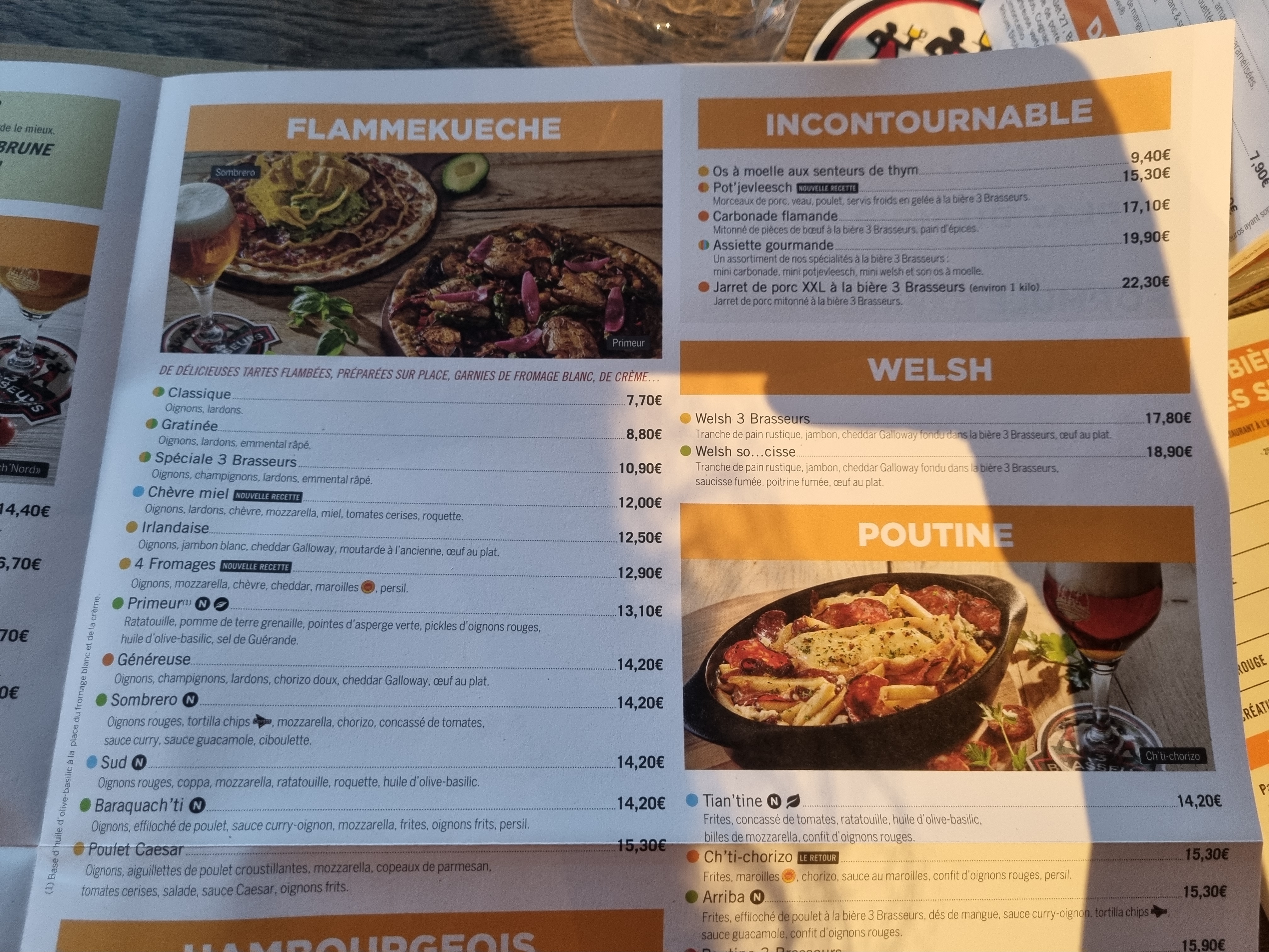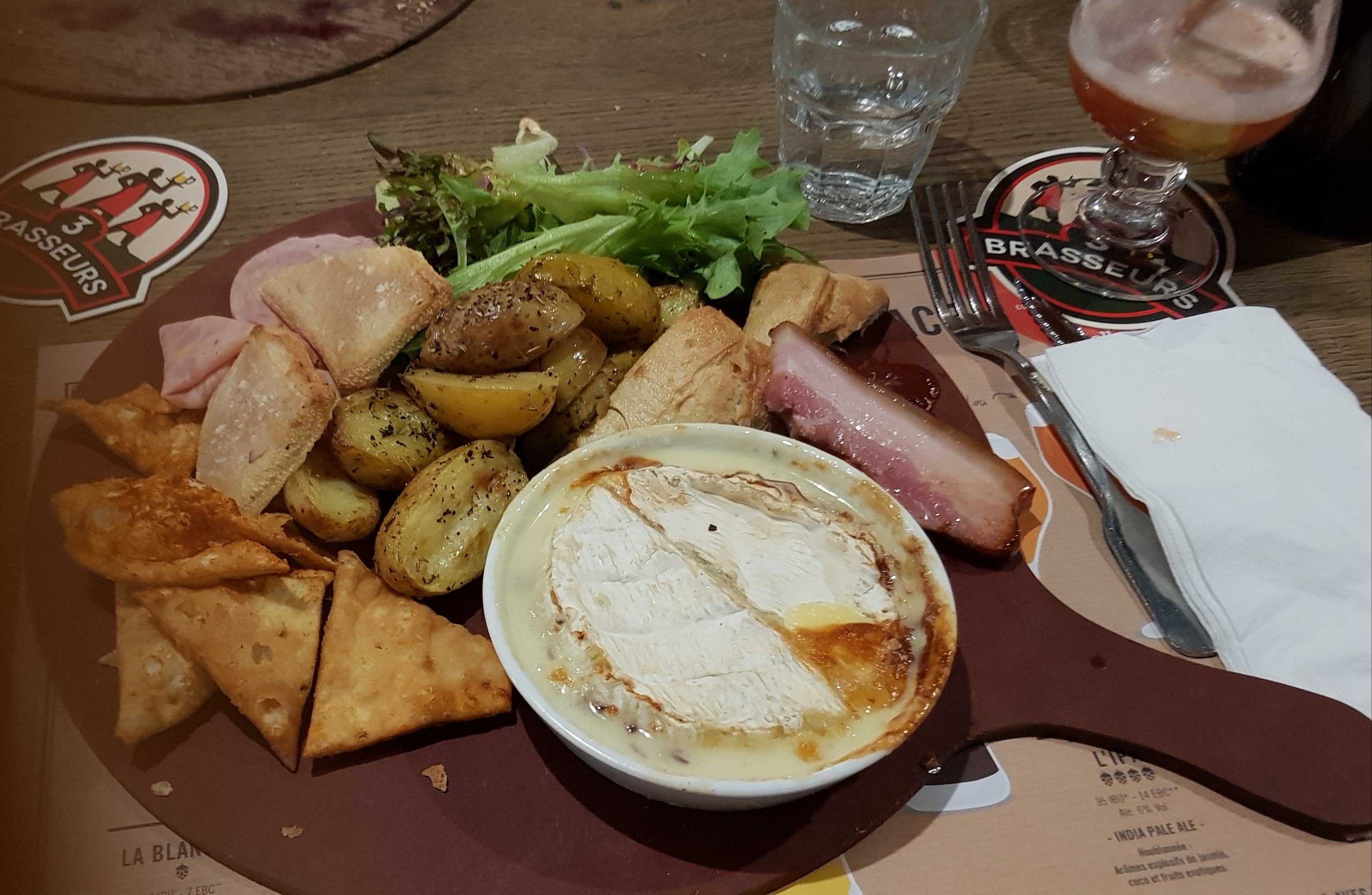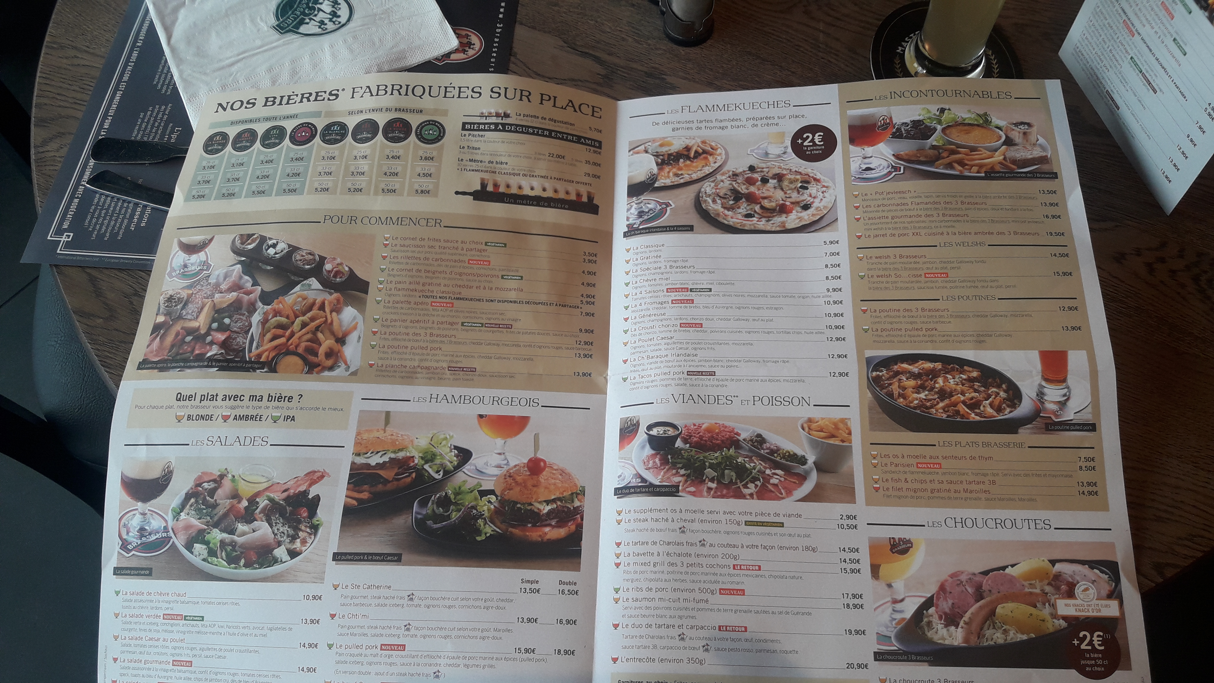 Nous avons manger le midi aux 3 brasseurs, nous avons pris une flam brie et une TARTI FLAMME CAESAR ET SALADE 15,90€ le plat et franchement cetais ridicule… rien à manger encore faim après. En suite nous allons payer, le serveur, récupérerais sur les tables des clients parti les pains non consommé et les remettais dans la panière a pain pour les servir a d’autre clients… vive l’hygiène !!!!!