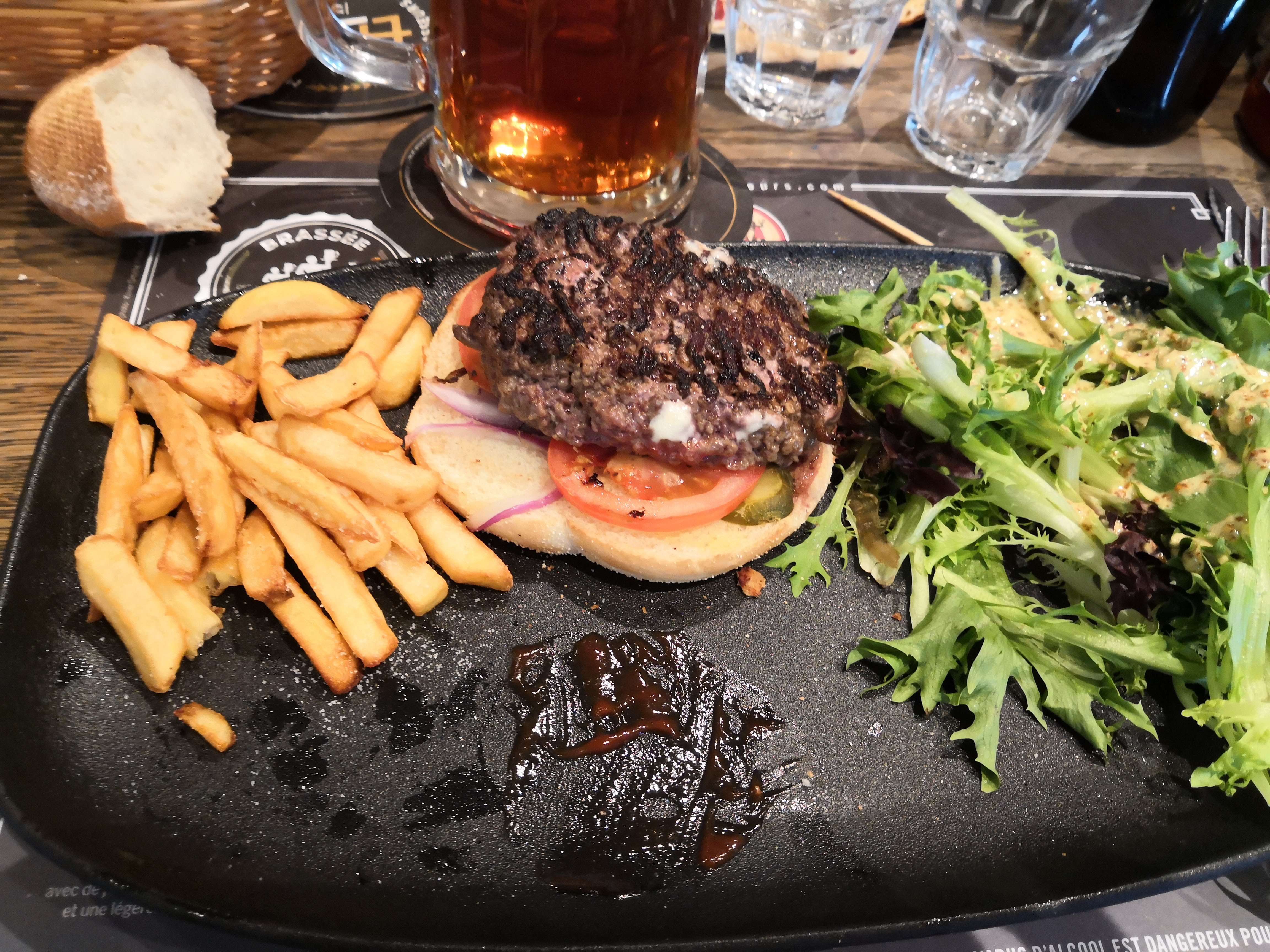 Notre serveur avait de l'humour. Nous avons pris un burger chacun. J'ai aimé le mien il était au chèvre. Le chou au Riesling était très bon. La cuisson du steak demandée était respectée. J'ai choisi une flammekuche à la pomme avec une glace vanille. J'ai aimé l'originalité de ce dessert.