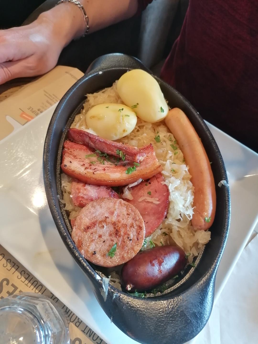 Voila un Établissement qui a su évoluer dans le bon sens et qui mérite un Bon commentaire.... Service d'un lundi soir avec pas mal de monde mais une équipe Dynamique, accueillante, dévouée et je tiens à les Féliciter (Merci Aubin en particulier). Pour mon ami, Jarret de Cochon : portion énorme et délicieuse, pour moi Choucroute à la Saucisse Excellente et copieuse, tellement bonne que j'ai tout mangé !! Un bonne gaufre Bruxelloise en dessert. Bravo et encore Merci. Paroles de Restaurateurs de la Ville Voisine !!