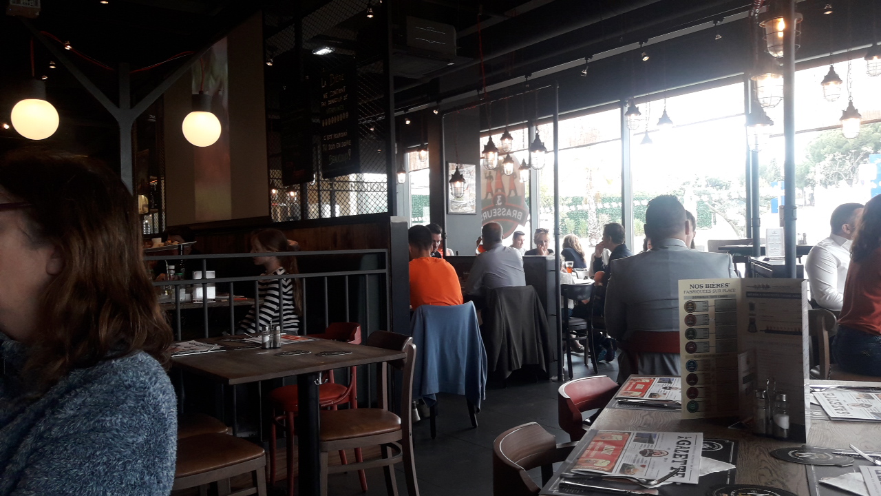 Restaurant très sympa. Sale assez grande. Parking en sous-sol gratuit pendant trois heures. Les bières sont bonnes et pas trop chères Un menu pour le déjeuner comprenant boisson plus plat plus café gourmand pour 12,50 €. Rapport qualité /prix plus que raisonnable.....dommage que l'attente soit un peu longue.
