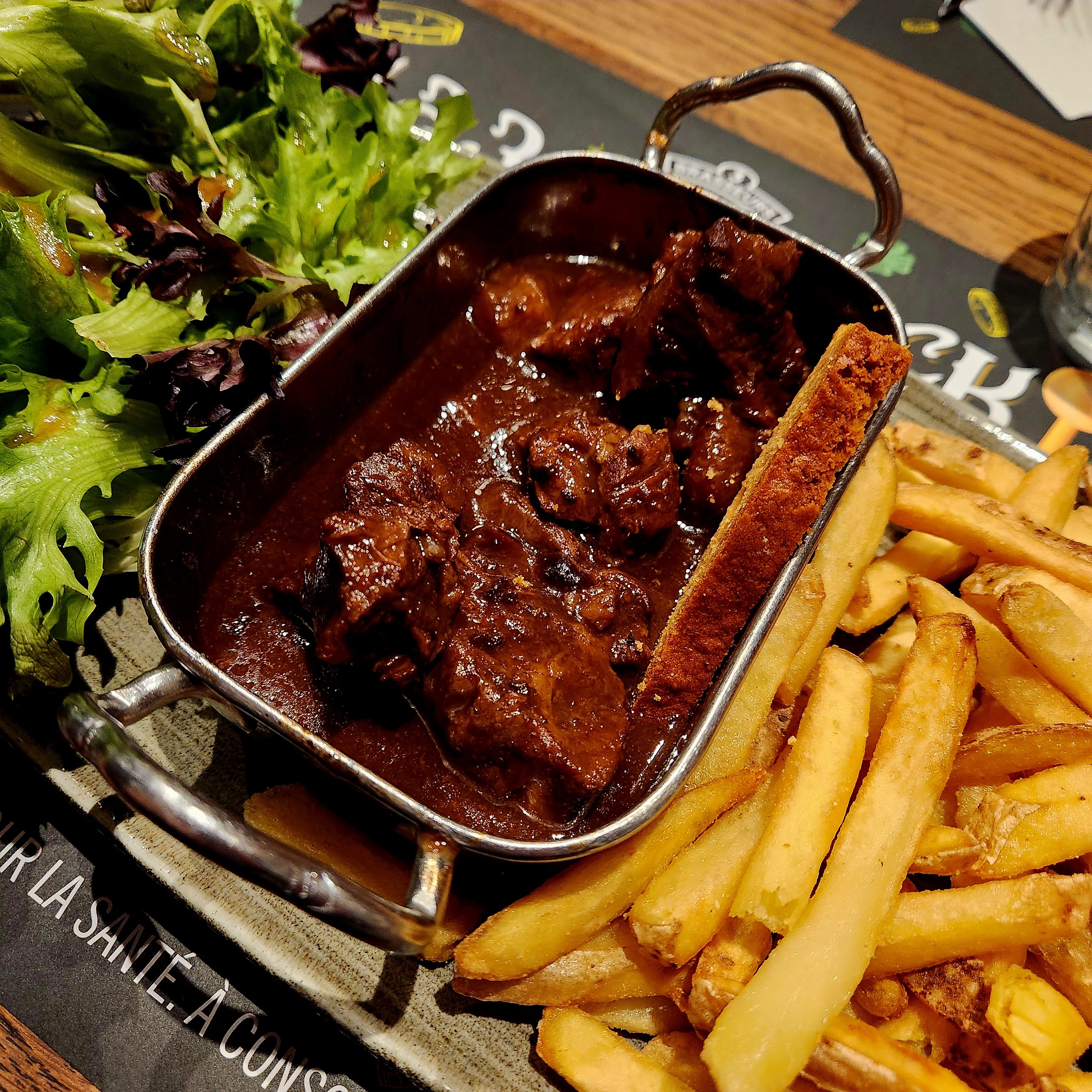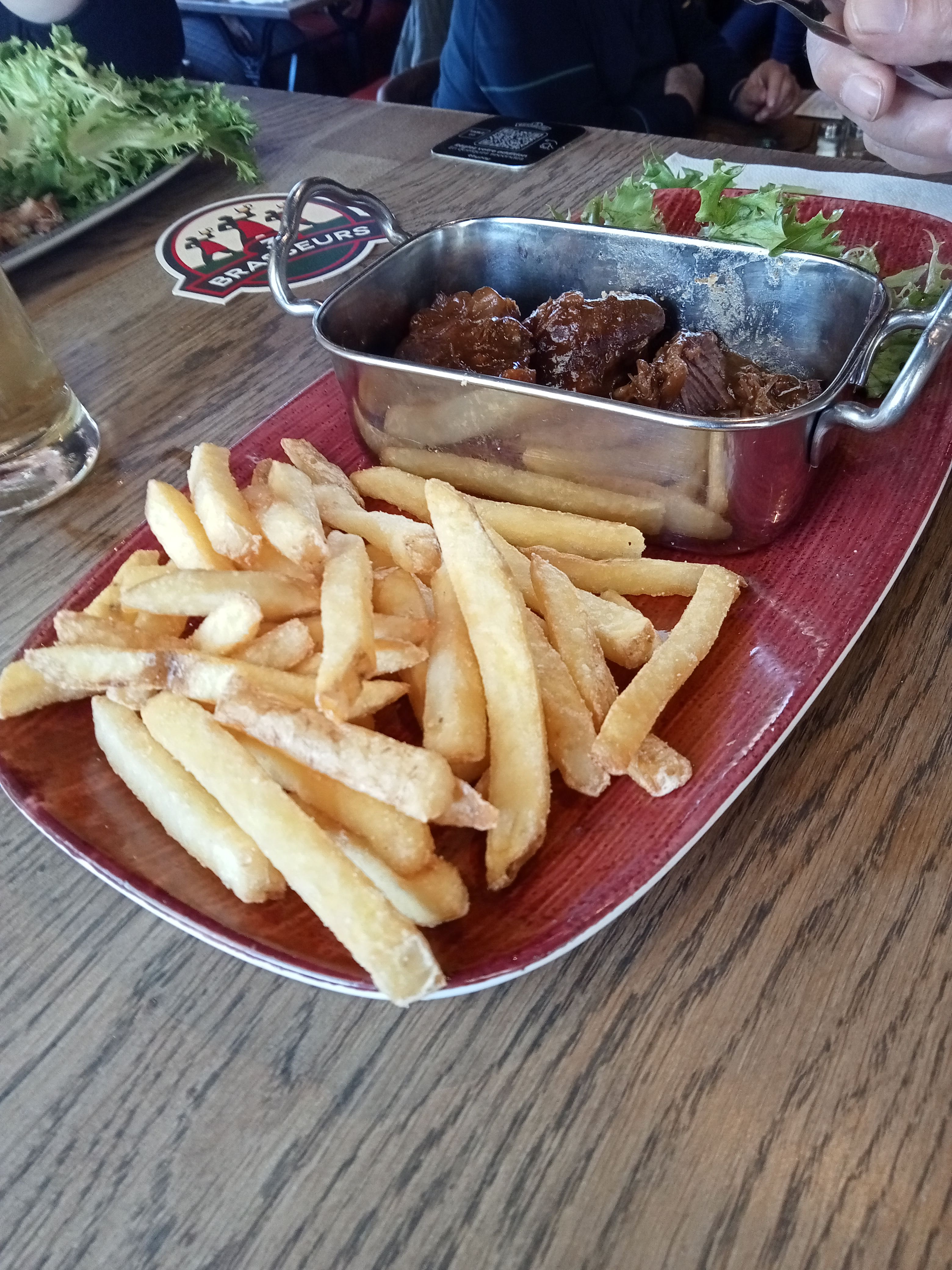 Un bon accueil et des serveurs agréables En revanche une cuisine décevante assiette découverte : une carbonnade ultra sucrée, un welch sec et un os à moelle en long énorme, la salade non assaisonnée même pas une once d'huile d'olive... Aucun intérêt