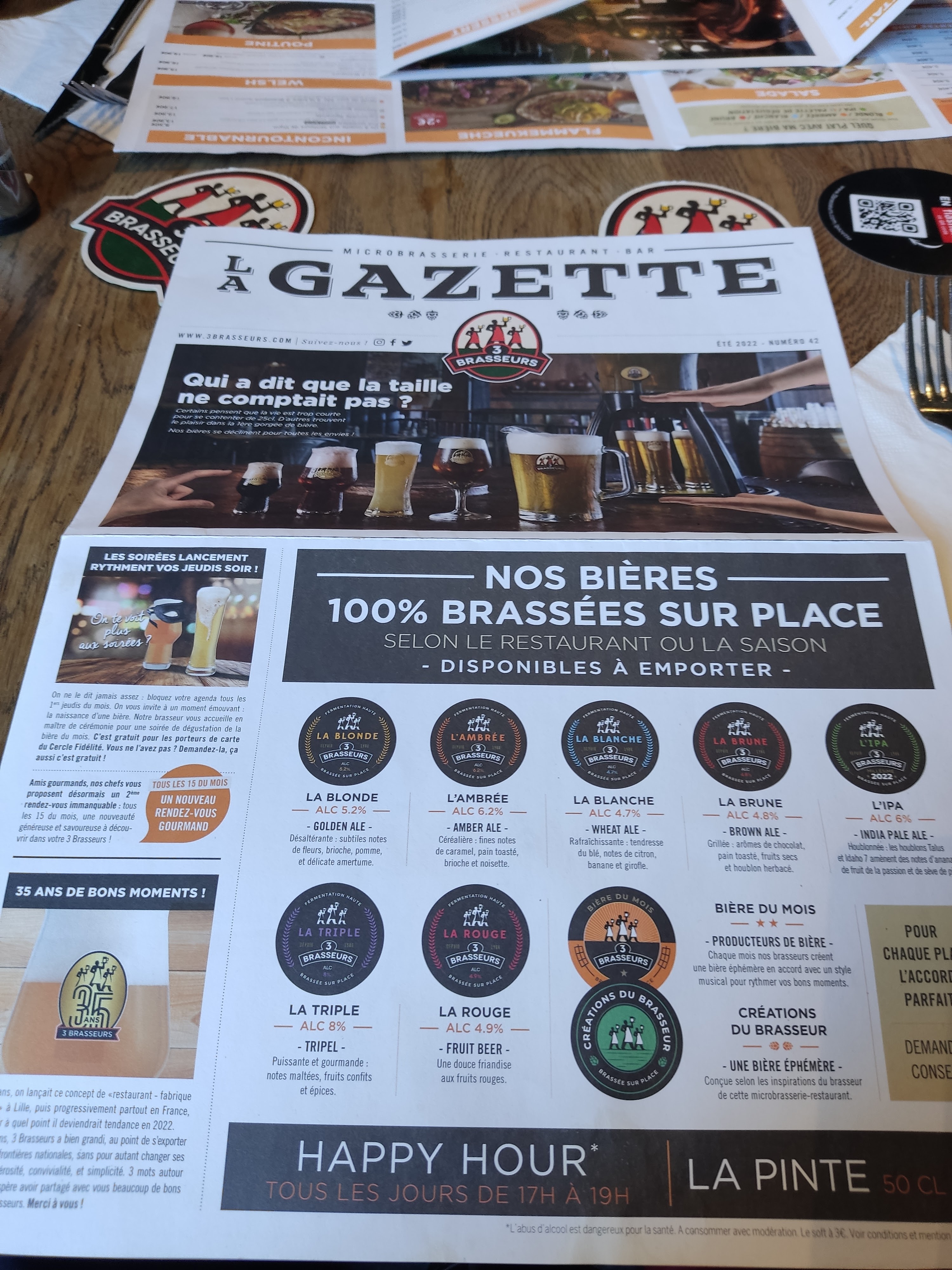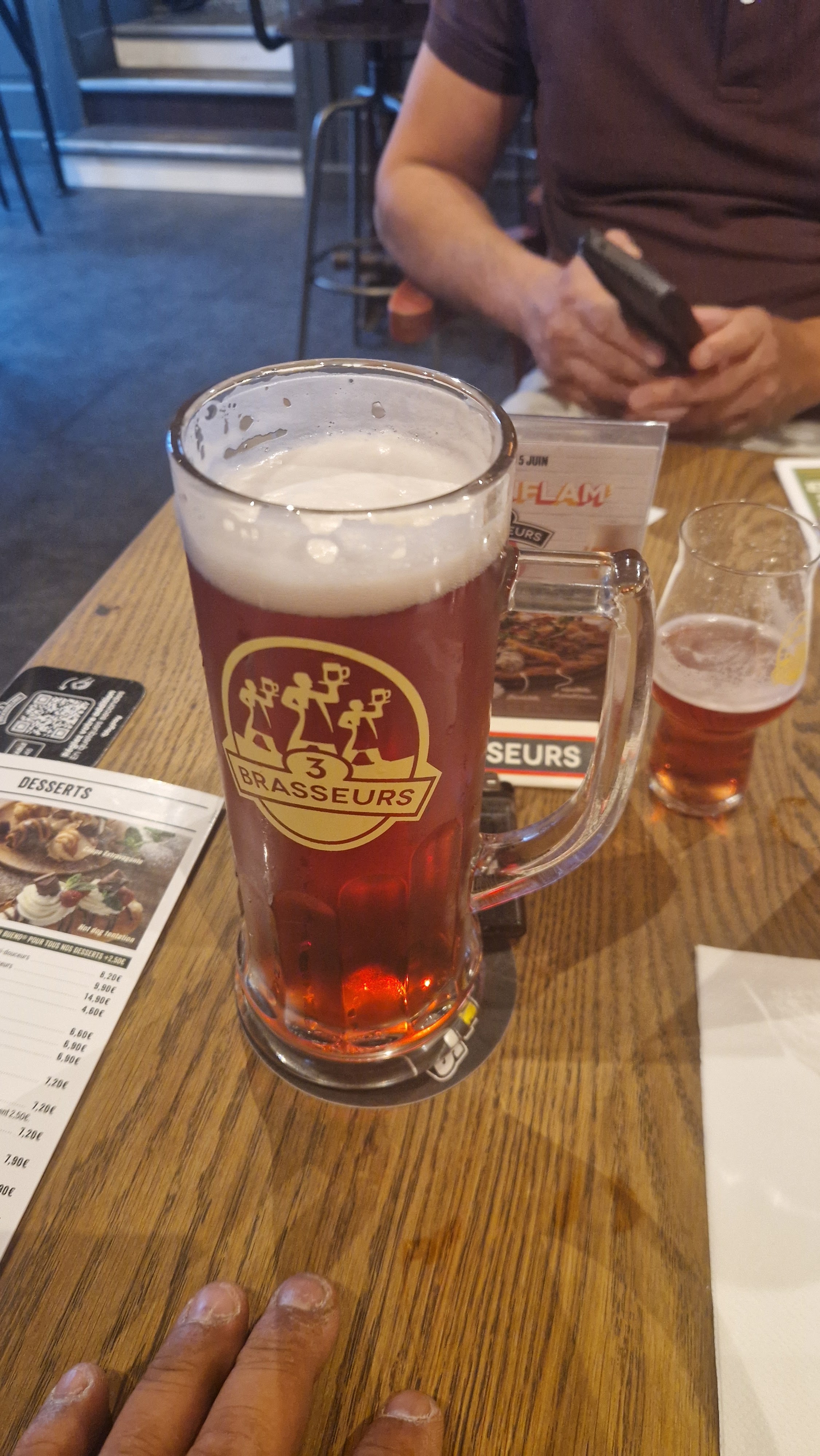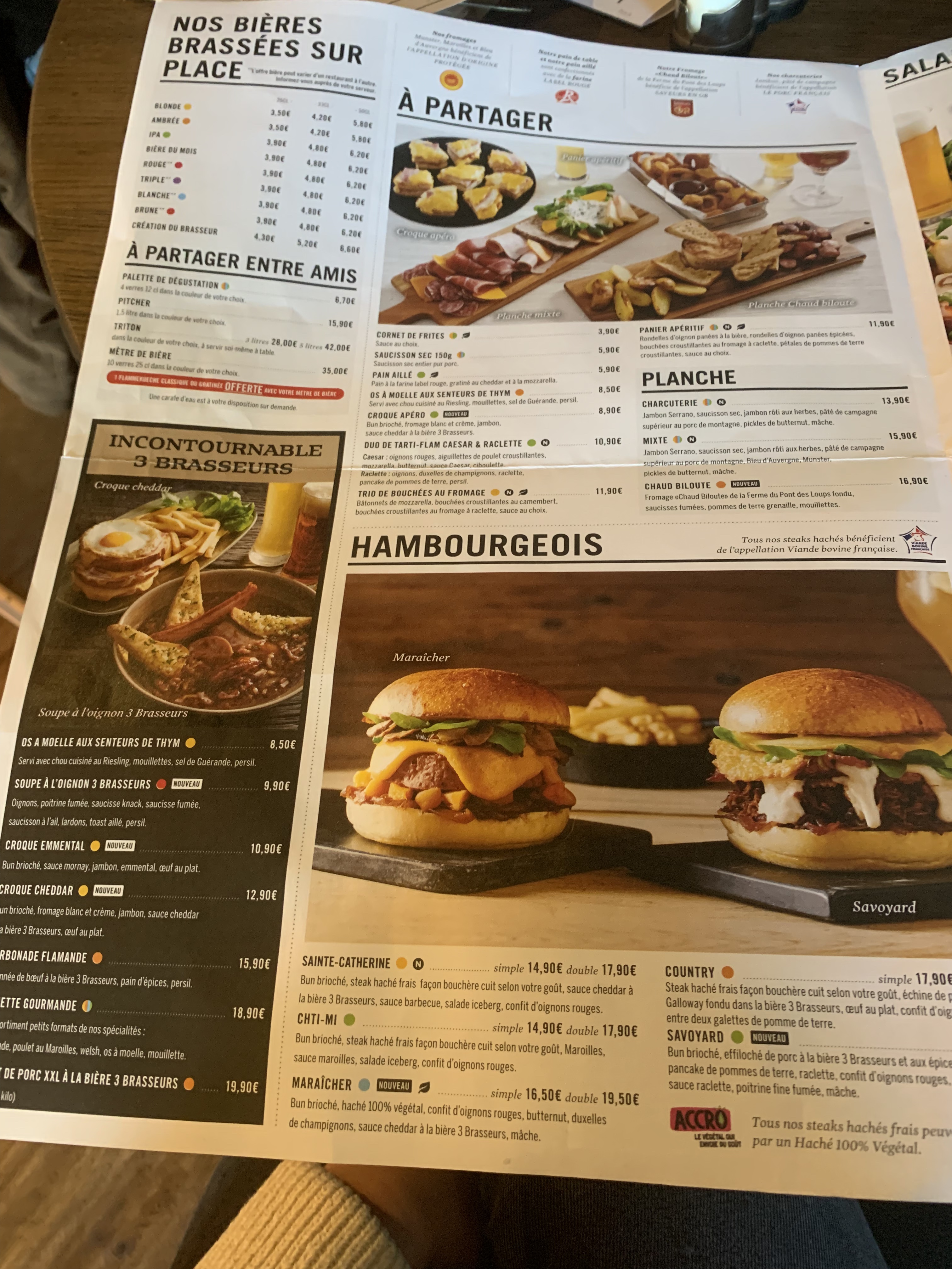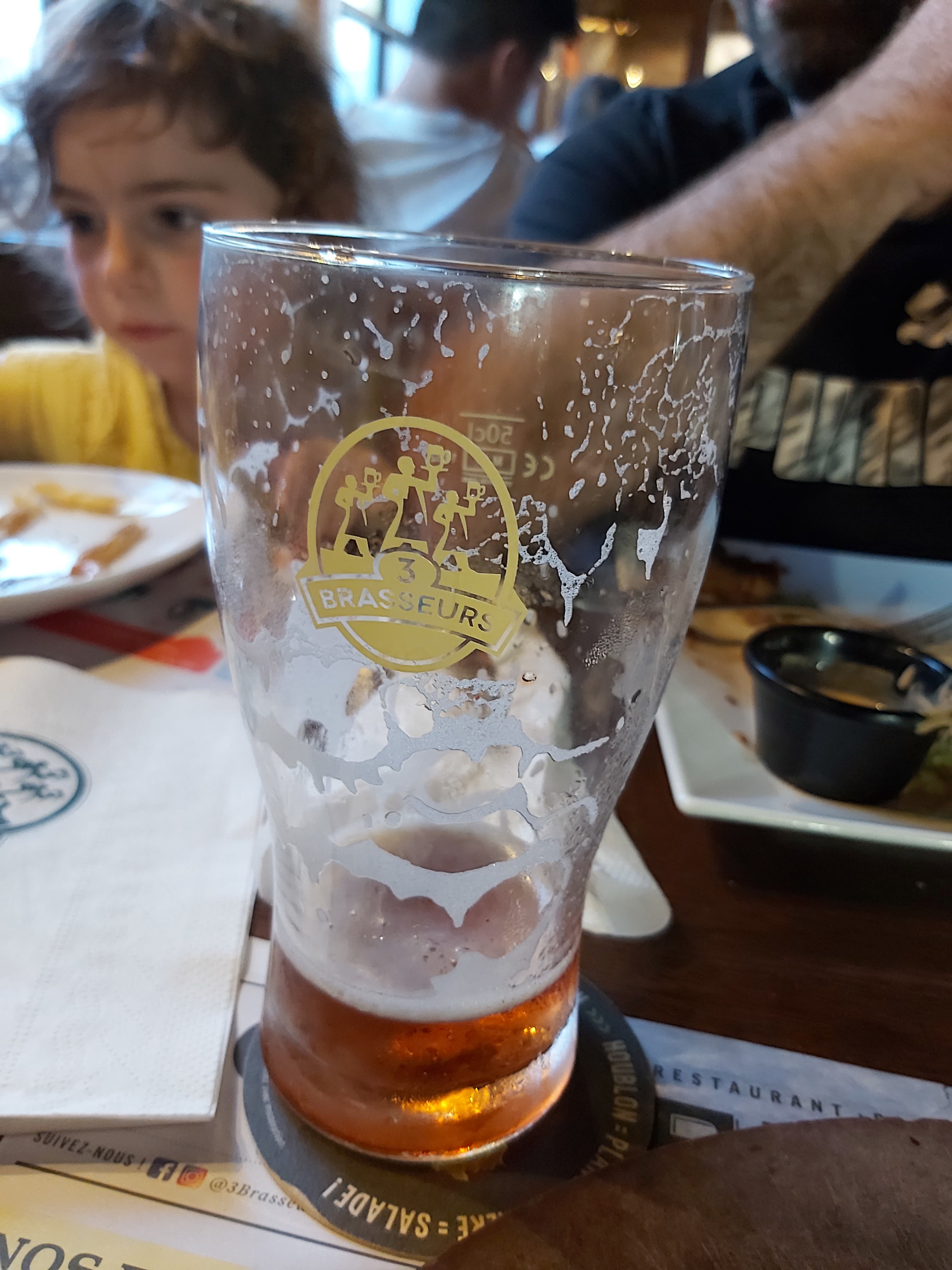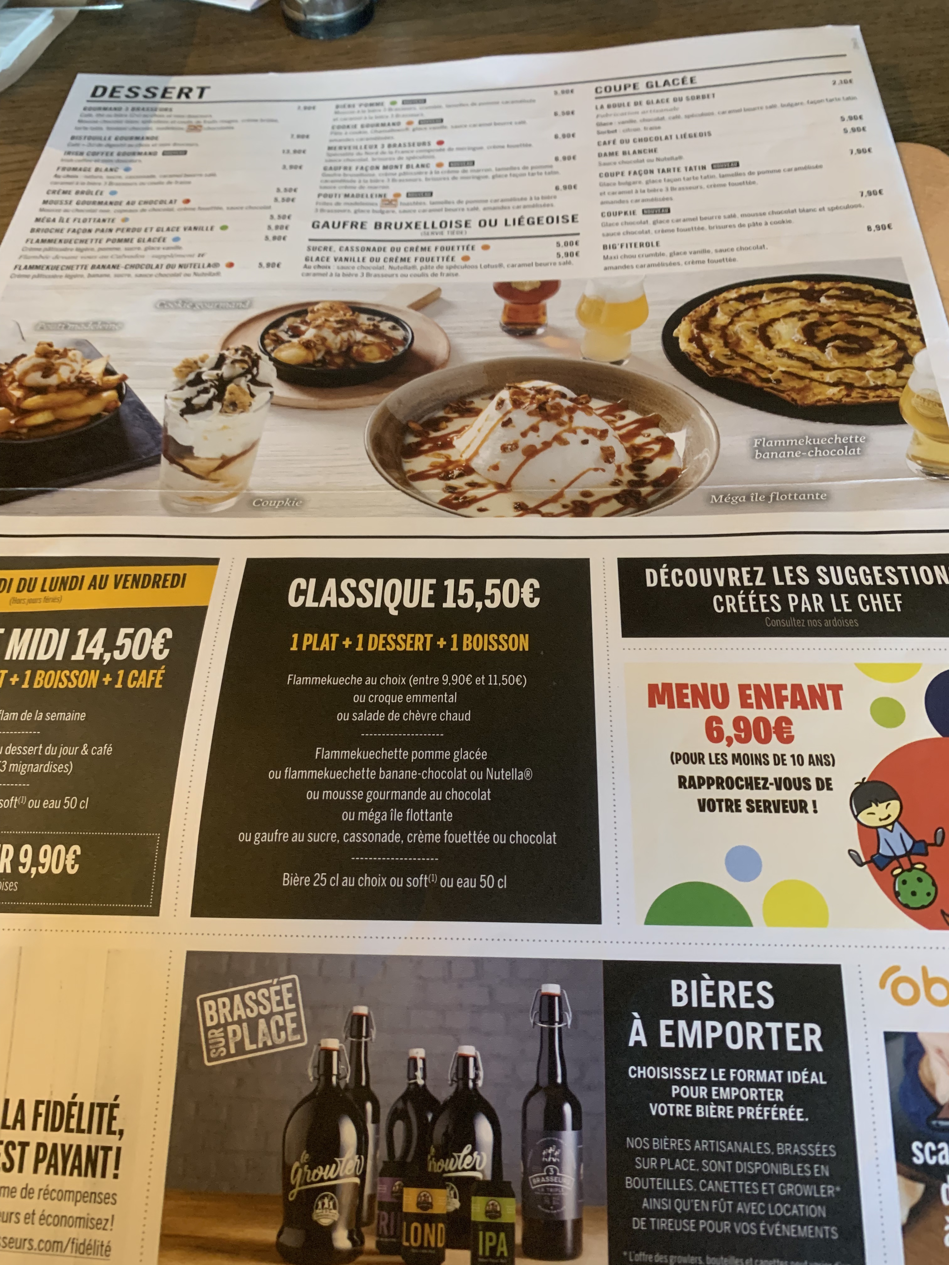 Quoi penser .... Entre un rafraichissement de la terrasse sans trop de sécu niveau client et pas d indications Une cuisine qui n'a rien a voir avec les autres 3 brasseurs que j'ai pu faire dans le monde Pas assez généreux sur la viande, j'ai pris une carbonade flamande, la honteux 4 morceaux qui se battaient en duel Ma femme a pris une entrecôte ou une bavette mais ça ressemble pas à ça dans une boucherie Le menu enfant avec l hamburger était mieux que nos 2 plats !!!! Un hamburger alors oui c'était pas mauvais mais quand on va au 3 brasseurs c'est pour mieux que ça Déçu Bière sans bulle ... Mouais Point positif, j'ai eu un nouveau serveur Medhi qui débute super gentil malgres plein d erreur mais il a fait du mieux qu'il pouvait et ça , c'est appréciable Merci a lui