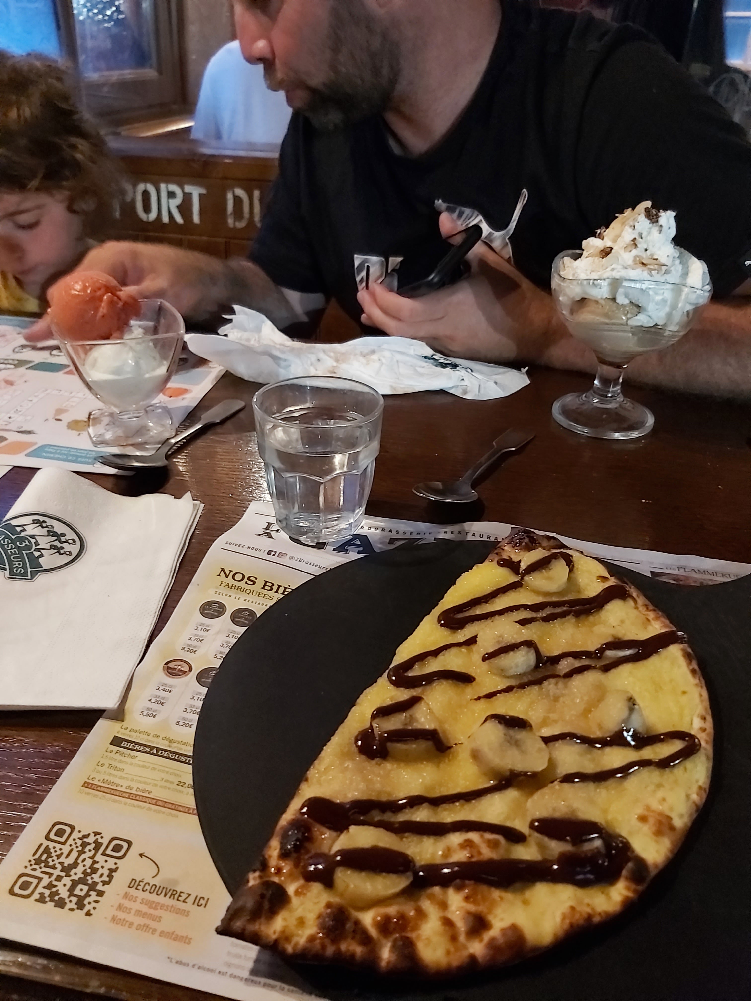 Service compliqué ( le serveur oubliait tout jusqu’aux couvert ( et on attend encore l’eau ) mais on met sur le compte de la fatigue ). Cuisine DÉSASTREUSE et grasse . Les croquettes de pomme de terre , sans goût , dégoulinaient d huile . Mention spéciale pour la flammequich pomme littéralement cramée avec 2 morceaux de pommes , pas cuites , qui se battent en duel. C’est une chaîne qu’on apprécies généralement beaucoup mais là on va arrêter. Dommage car l’ambiance est toujours sympa