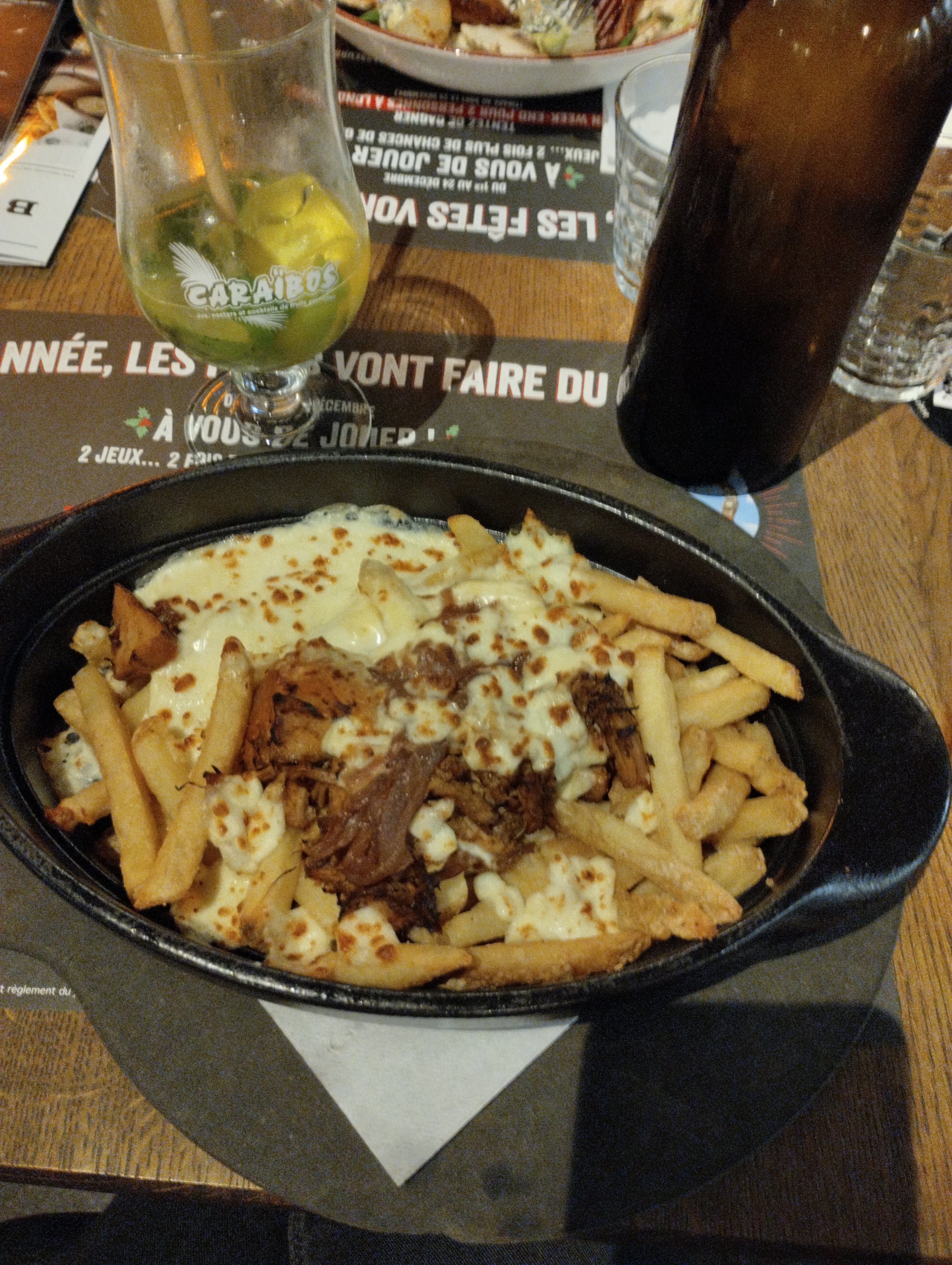 Je vous conseille de ne pas prendre de poutine, visiblement cet établissement ne sait pas ce qu'est ce plat (voir photo). Des frites sèches, pas de sauce et un fromage quasi inexistant... Grand contraste avec le poulet au Maroilles qui était délicieusement crémeux ! Service gentil mais manque un peu de rapidité, on a essayée de faire venir le serveur à notre table pendant 30 minutes... En vain. Du coup nous sommes partis sans desserts. Le lieu est beau, c'est original.