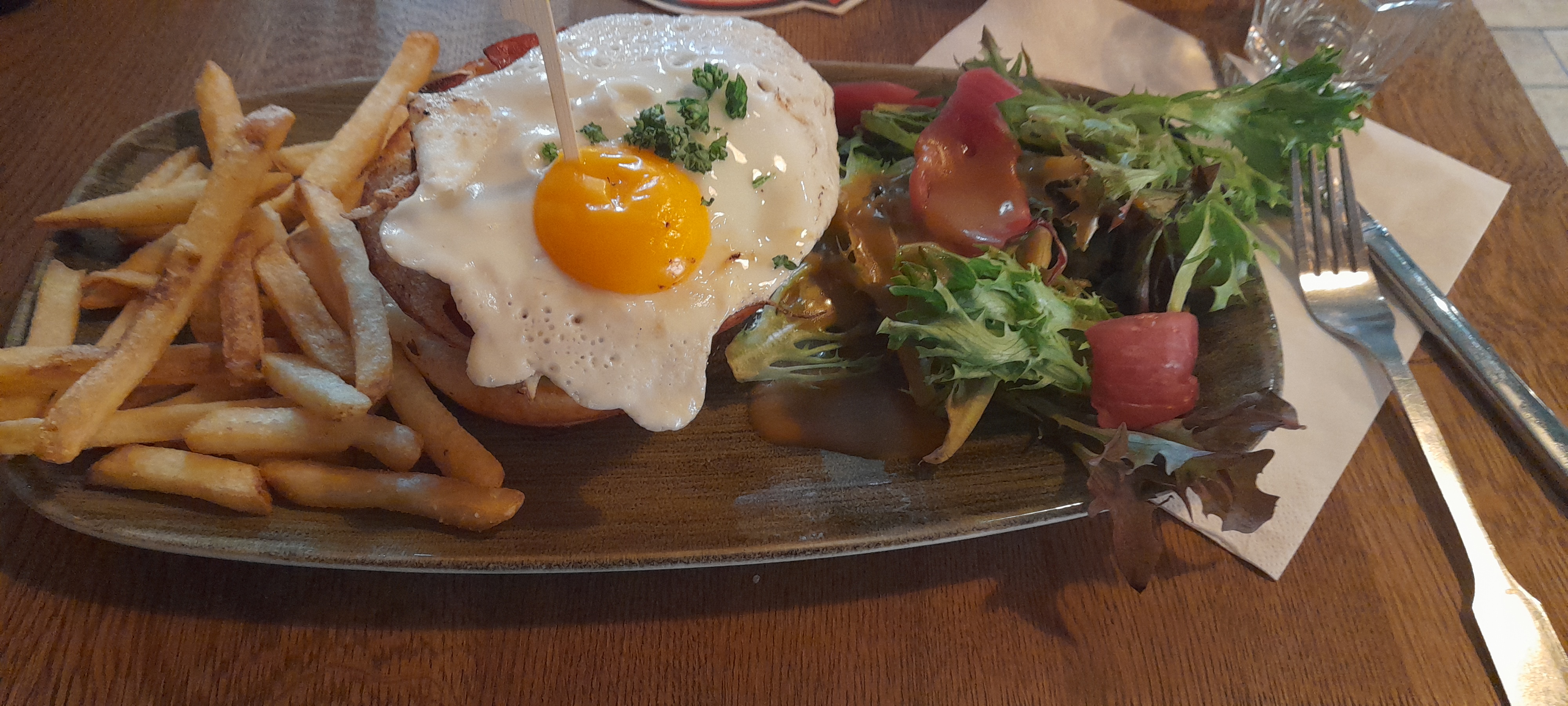 Un peu déçue du plat que j'ai trouvé peu garni, beaucoup de pain pour pas grand chose dedans, heureusement que c'était accompagné de frites et de salade . Accueil chaleureux.