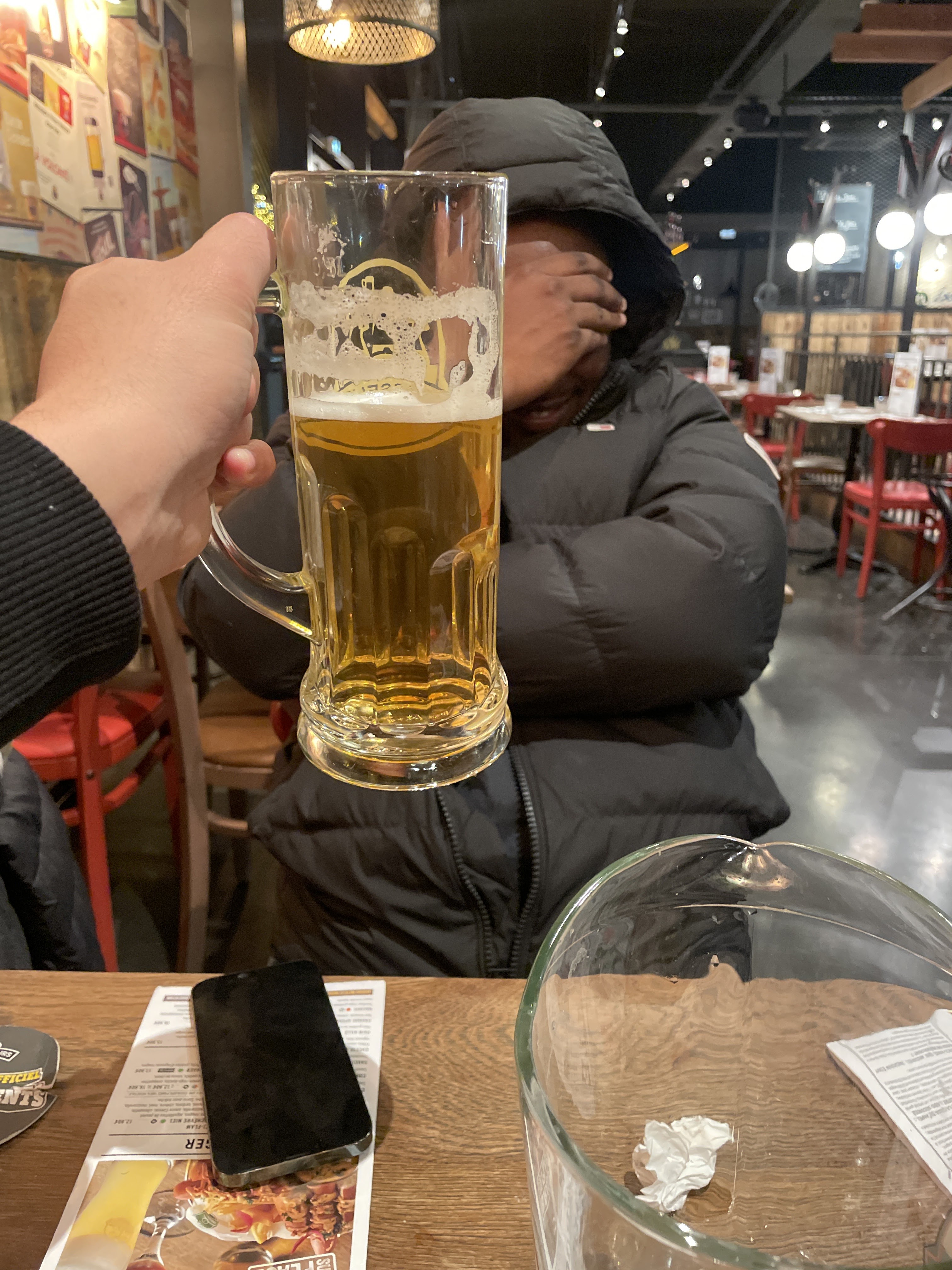 Nous remercions Sarah,Lucie et nos deux serveurs dont celui qui est le tatouage de loup sur le bras droit. Pour son service de qualité toujours avec le sourire nous avons vraiment apprécié la table de 19 au fond bien chiant !😆😜🍺