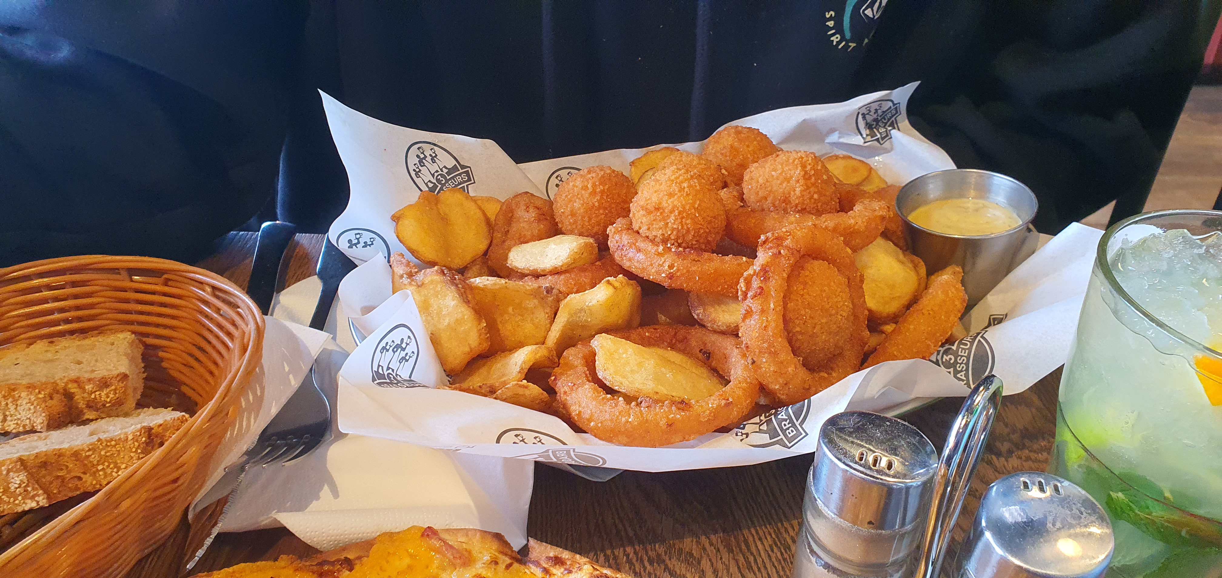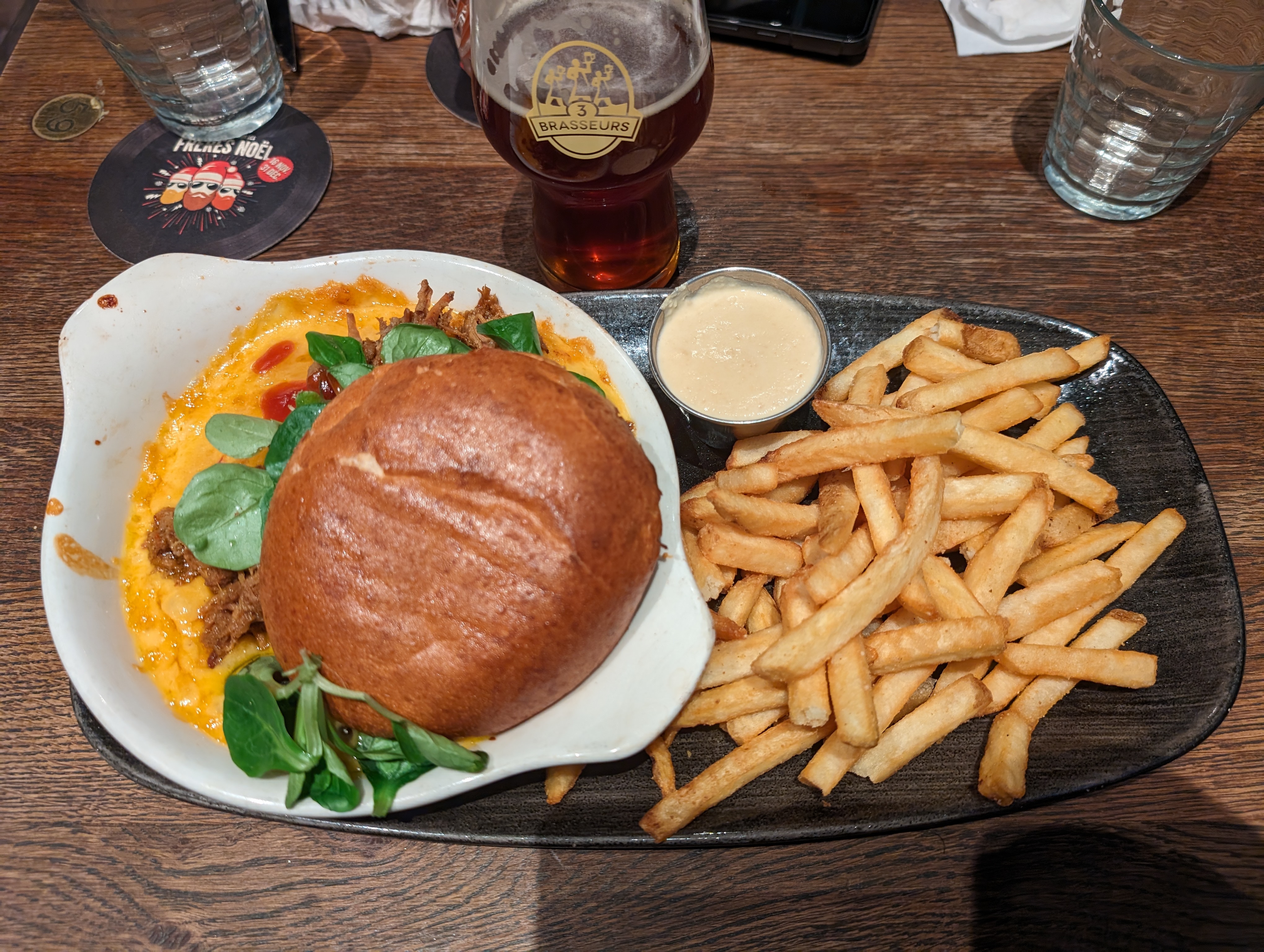 Vraiment bon ! L’apéro le pain aillé est délicieux et fondant Les serveurs sont à votre écoute et peuvent vous conseiller si vous ne savez pas quoi prendre comme plat ( comme pour ma part on m’a conseillé ce burger (photo)) Le Welshbourgeois.. super bon à tel point qu’on en cale ( tout dépend de votre faim) En autre plat : La Poutine des 3 Brasseurs. Vraiment excellent ! Je vous conseille à tous l’un des plats aussi proposé sur la carte. 10.09.2021