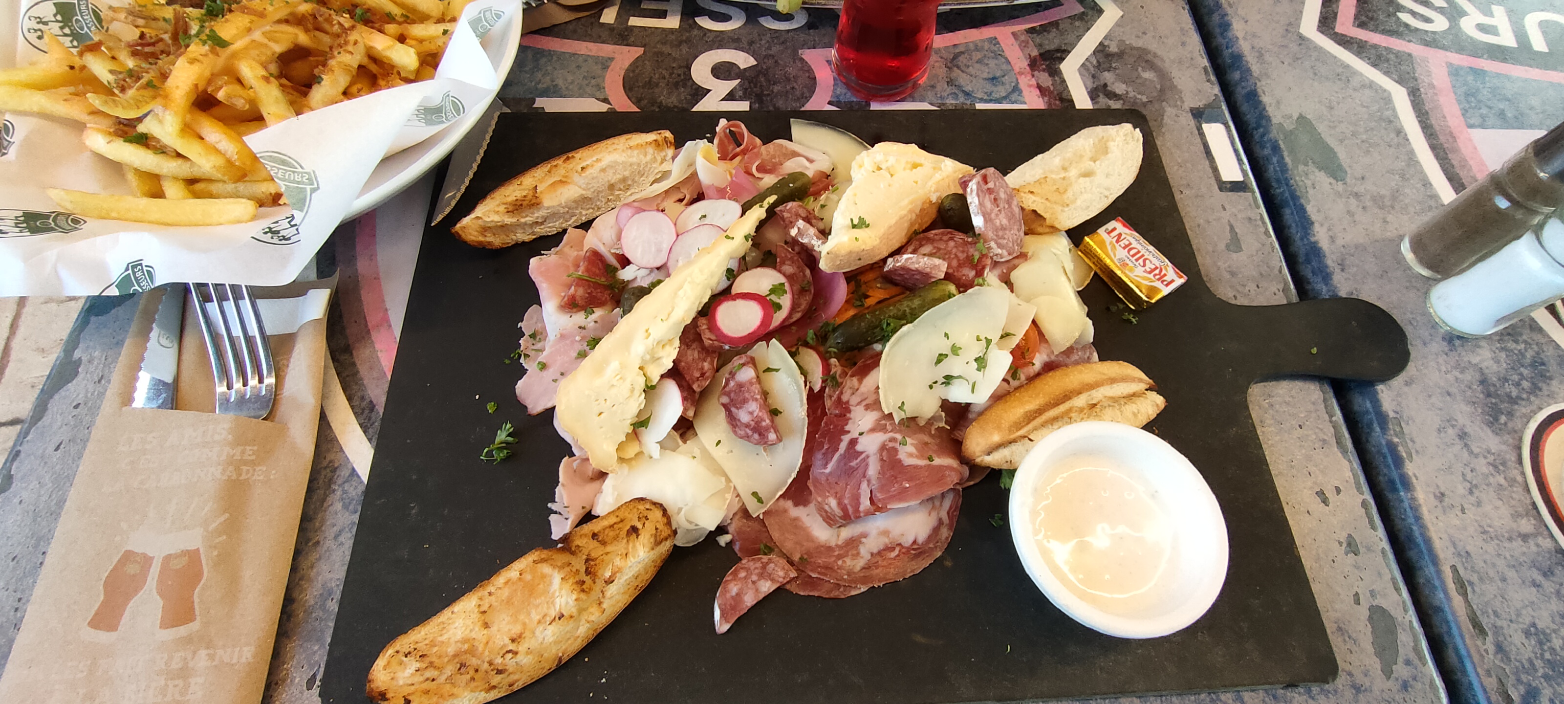 Une expérience un peu décevante côté cuisine. Je donne mon avis sur ce que j'ai mangé; je n'ai pas testé la carte entière. L'assiette de charcuterie : la présentation laisse à désirer, la charcuterie n'est pas mise en valeur avec la couche végétale du dessus, pire la vinaigrette qui coule sur la charcuterie gache la première couche. C'est dommage parce que la charcuterie est bonne. Un bol sur le côté avec la verdure et sauce serait judicieux. La mousse au chocolat était bien dense et au goût un peu léger. La décoration de la salle est sympathique et un service au top. Pour moi le repas en lui-même valait 2 étoiles, mais le hot dog de ma fille étant pas mal du tout je suis passé à 3 étoiles. J'y retournerais et choisirais d'autres plats.......