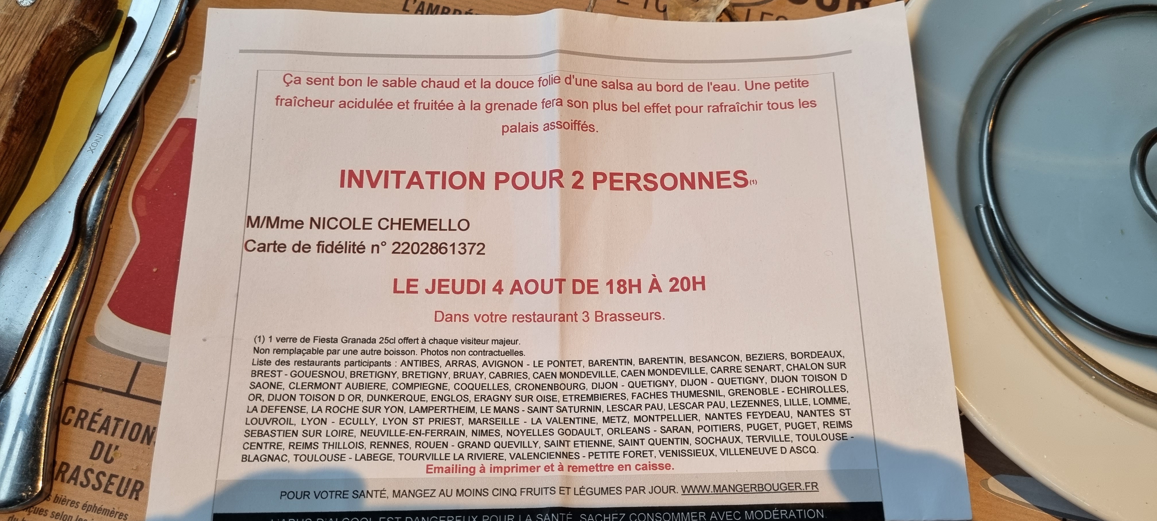 Bonjour à tous voilà nous sommes le premier jeudi de chaque mois. Et nous avons reçu une invitation pour la dégustation comme depuis pas mal de temps .mais grande surprise nous avons été mal reçu par un responsable, et nous nous signale que nôtre invitation est caduque que si nous ne consommons pas. Nous n aurons pas cette dégustation. (Nous avons toujours consommer).je suis dessus de cette acceuil et d être pris en otage. Je ne serais plus là ce jeudi. Si je reviens il faudra m invité sinons de moi même non. Je vais contacter le siège pour être sûr que cette pratique ne concerne pas que celui de Compiègne. Remonter moi les lecteurs vos avis afin. De faire un petit sondages désolé à tous Je reprend la main mais le responsable de salle viens d engueuler un serveur à haute voix. Je ne supporte pas. Olivier