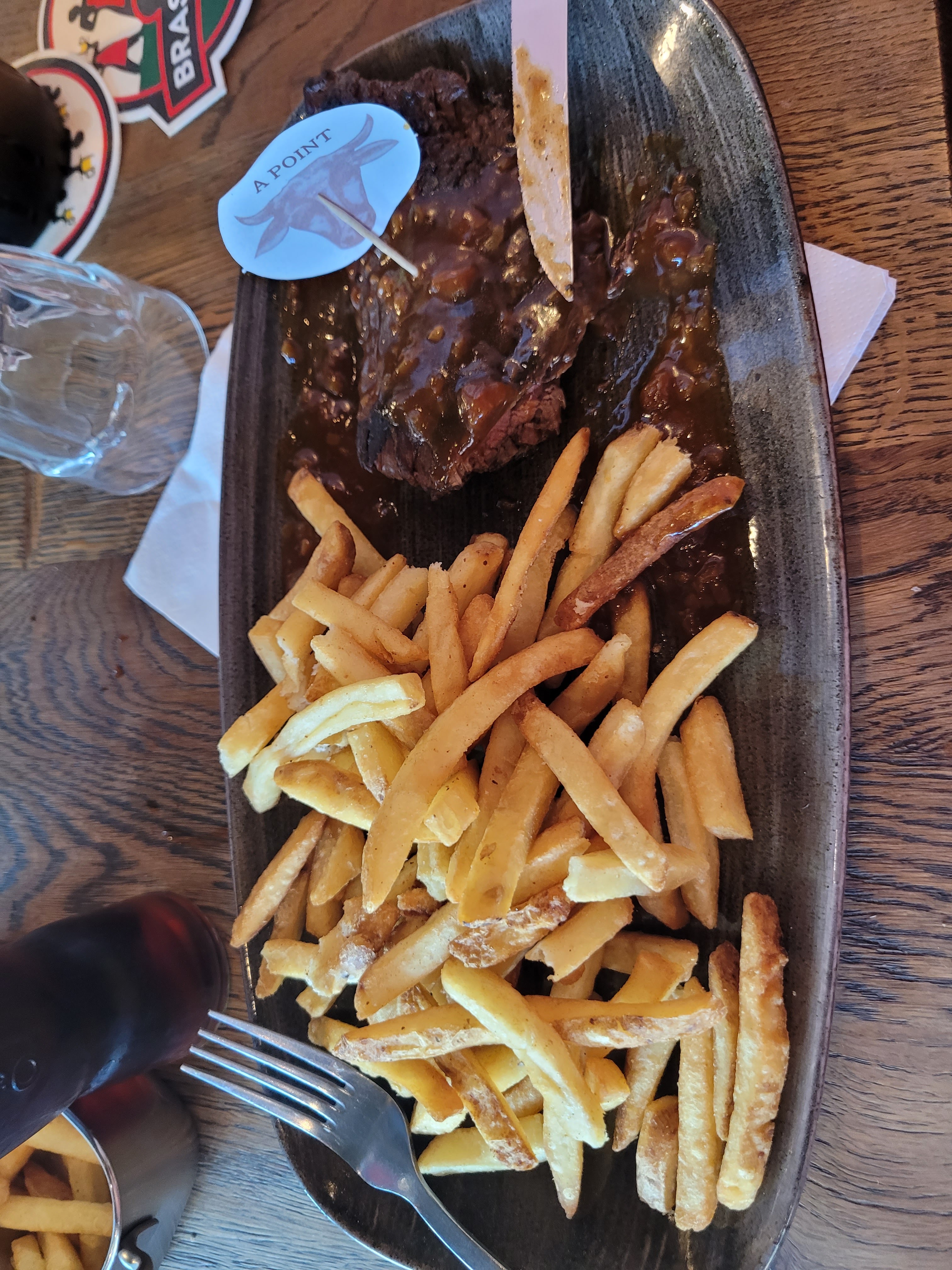 Repas plutot bon viande de qualité. Juste un petit bémol quand tu demandes du sel et du poivre a une serveuse et qu'elle te dit qu'il faut demander a quelqu'un d'autre car ce n'est pas son rang alors qu'elle a juste a tendre le bras pour atteindre la desserte.. J'ai donc pris mon sel moi même. et qui plus est s'en va avant meme que jai pu finir ma phrase ce qui est d'une malpolitesse incroyable.