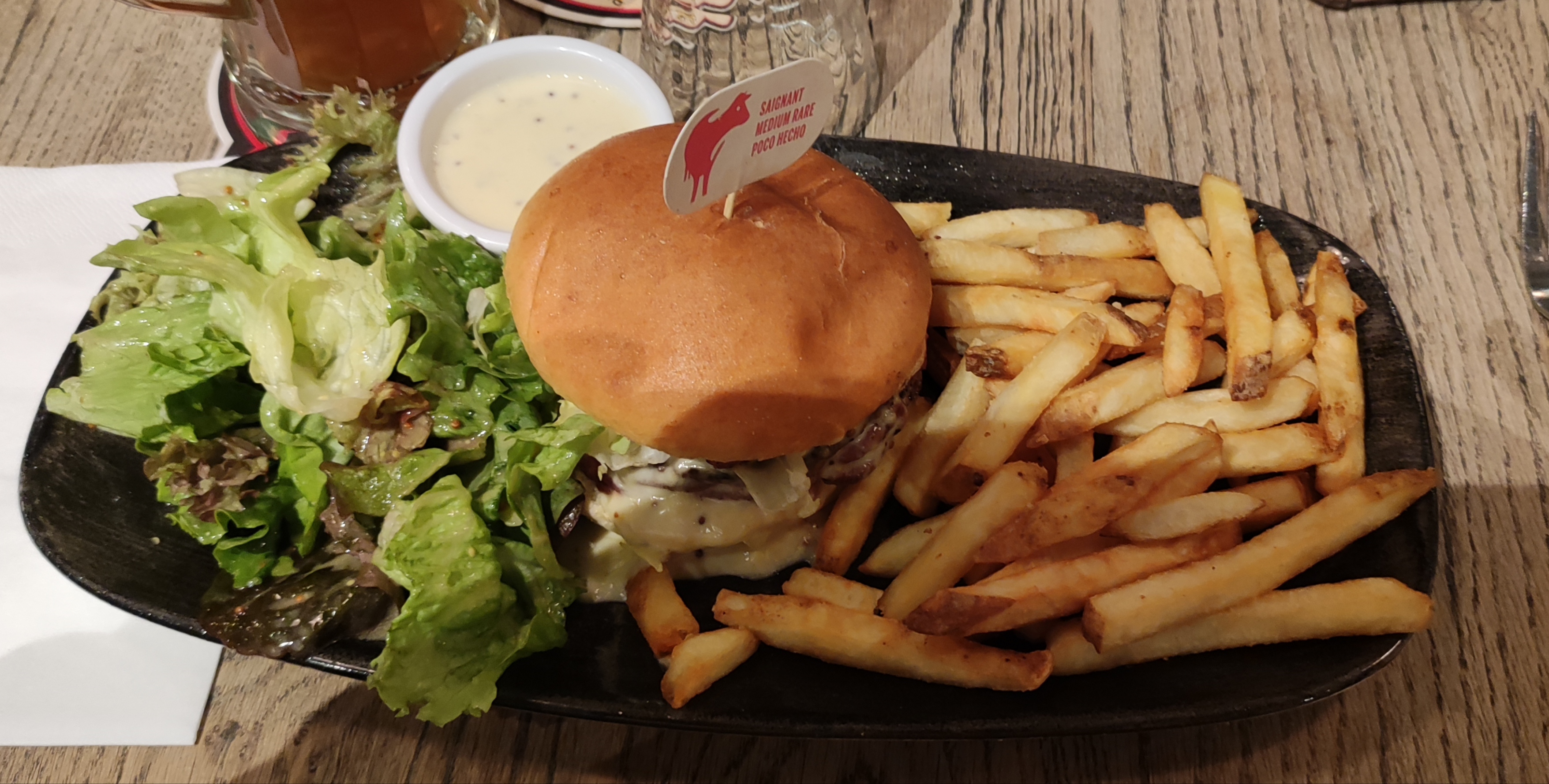 Burger très moyen et frites froides Sauce de salade inexistante Nous n'avons jamais eu la carafe d'eau Je ne recommande pas