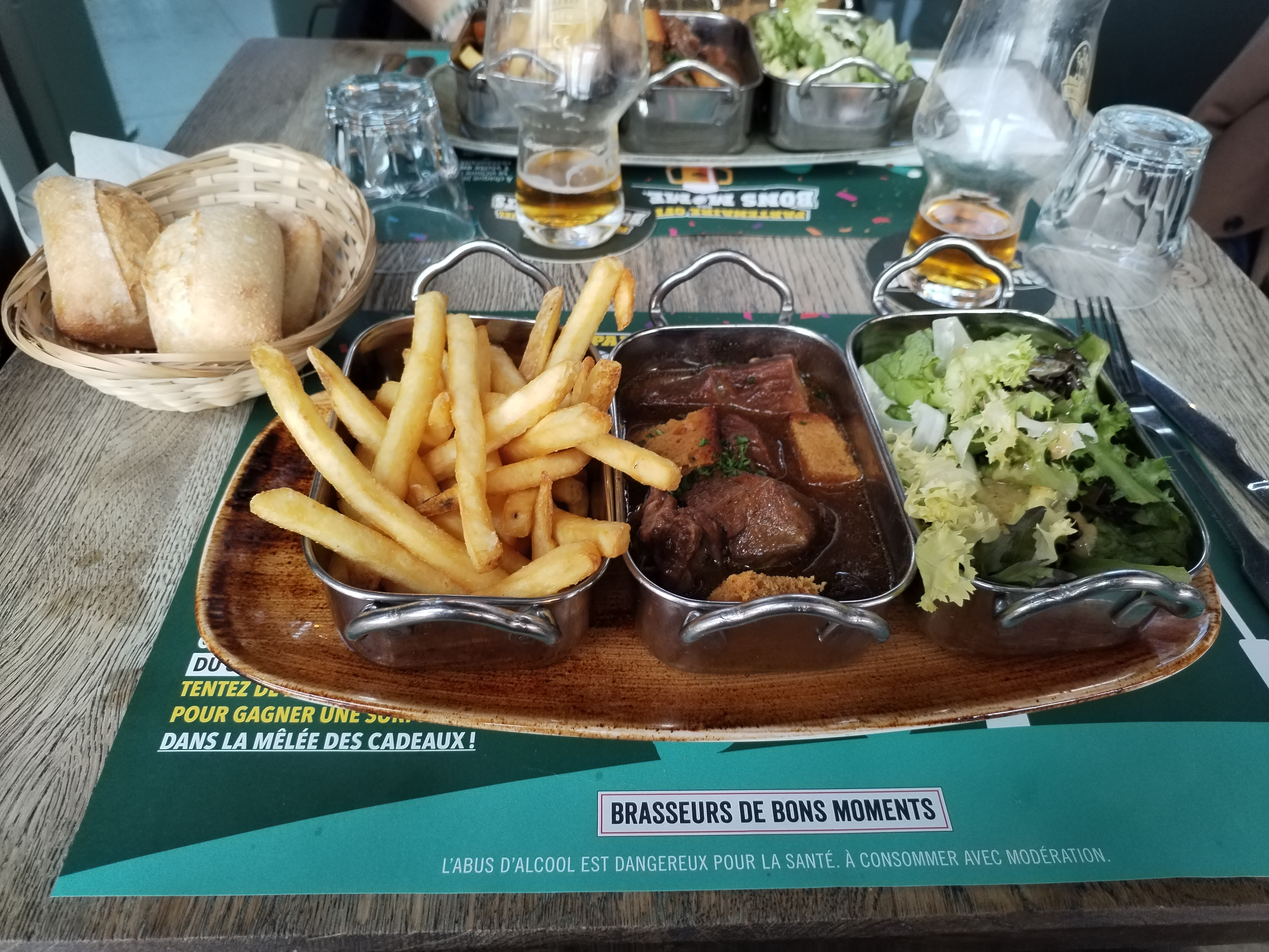 Nous avons bu une excellente bière la mandalorian (à la mandarine) accompagné d'un panier à partager (bon mais ça fait trop quand on est 2) En plat, nous avons mangé une bonne carbonnade flamande. Le service et l'accueil sont top.