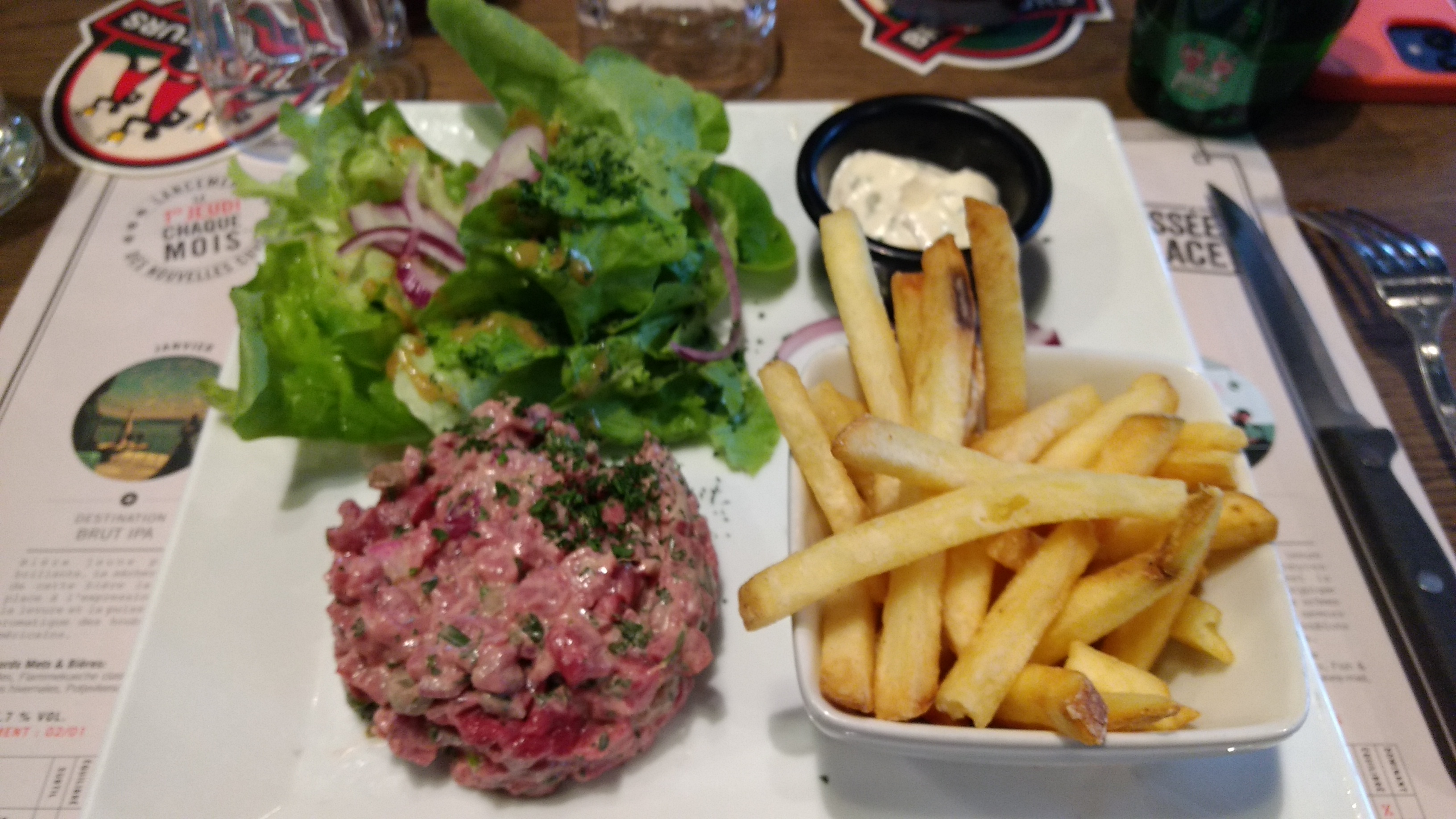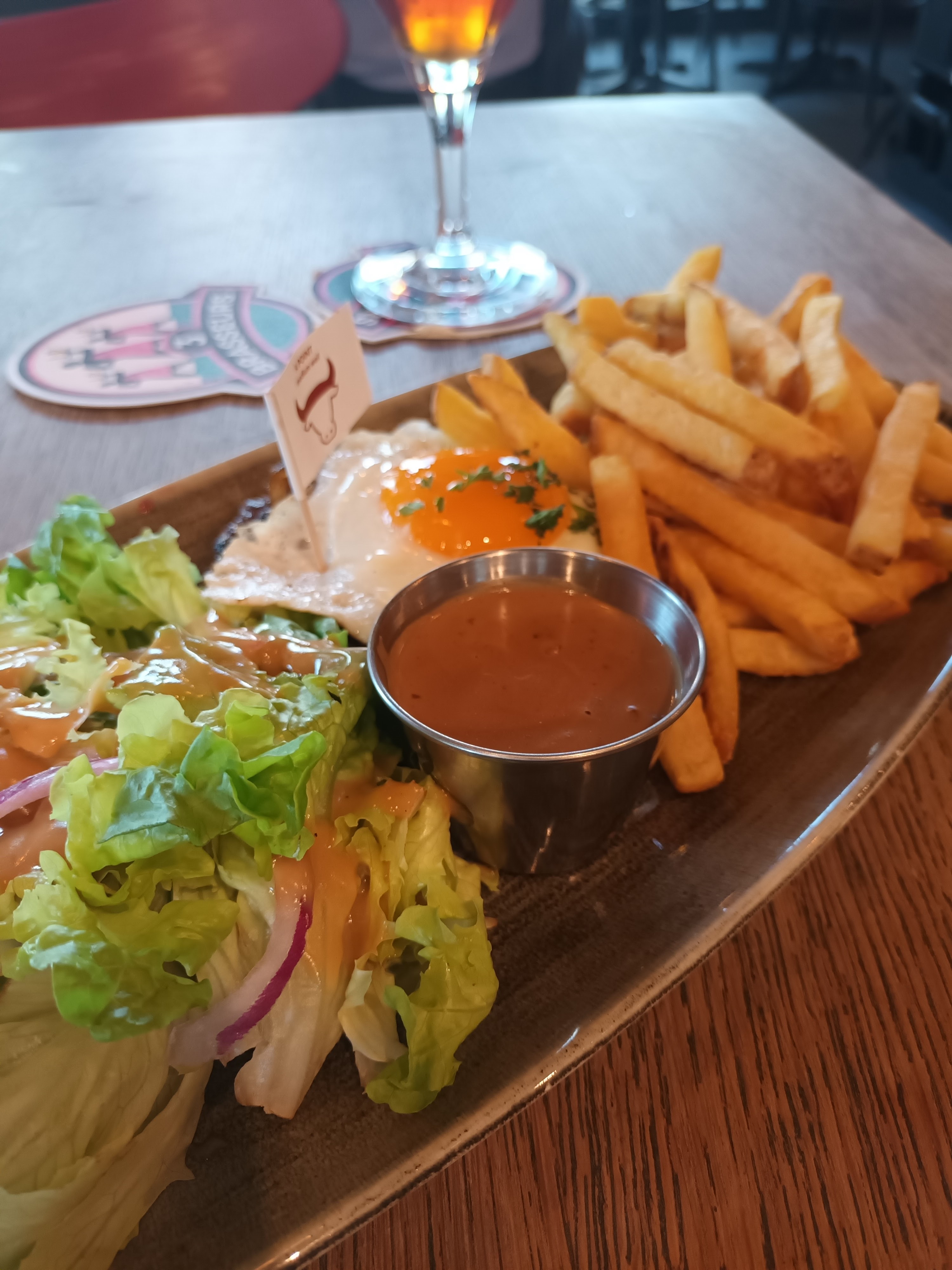 Expérience plus que mitigée. Pas d happy hour les jours de match : autant encaisser plein pot les supporters du stade qui est a 100m. Welsh clairement réchauffé et mal réchauffé puisque très dur a coeur , enfin le cœur c’est la tartine de pain tellement grosse qu’on peut y glisser peu de fromage autour. La viande du tartare est rouge à faire pâlir une écrevisse… dure à mâcher et filandreuse… Le ponpon revient à la mayo payée 0,5€ pour un pot qui semble avoir été fait il’y a deux jours vu la différence de couleur entre le haut et le bas du pot. Nous allons généralement à la pilaterie et allons maintenir cette habitude car très déçus de celui là.