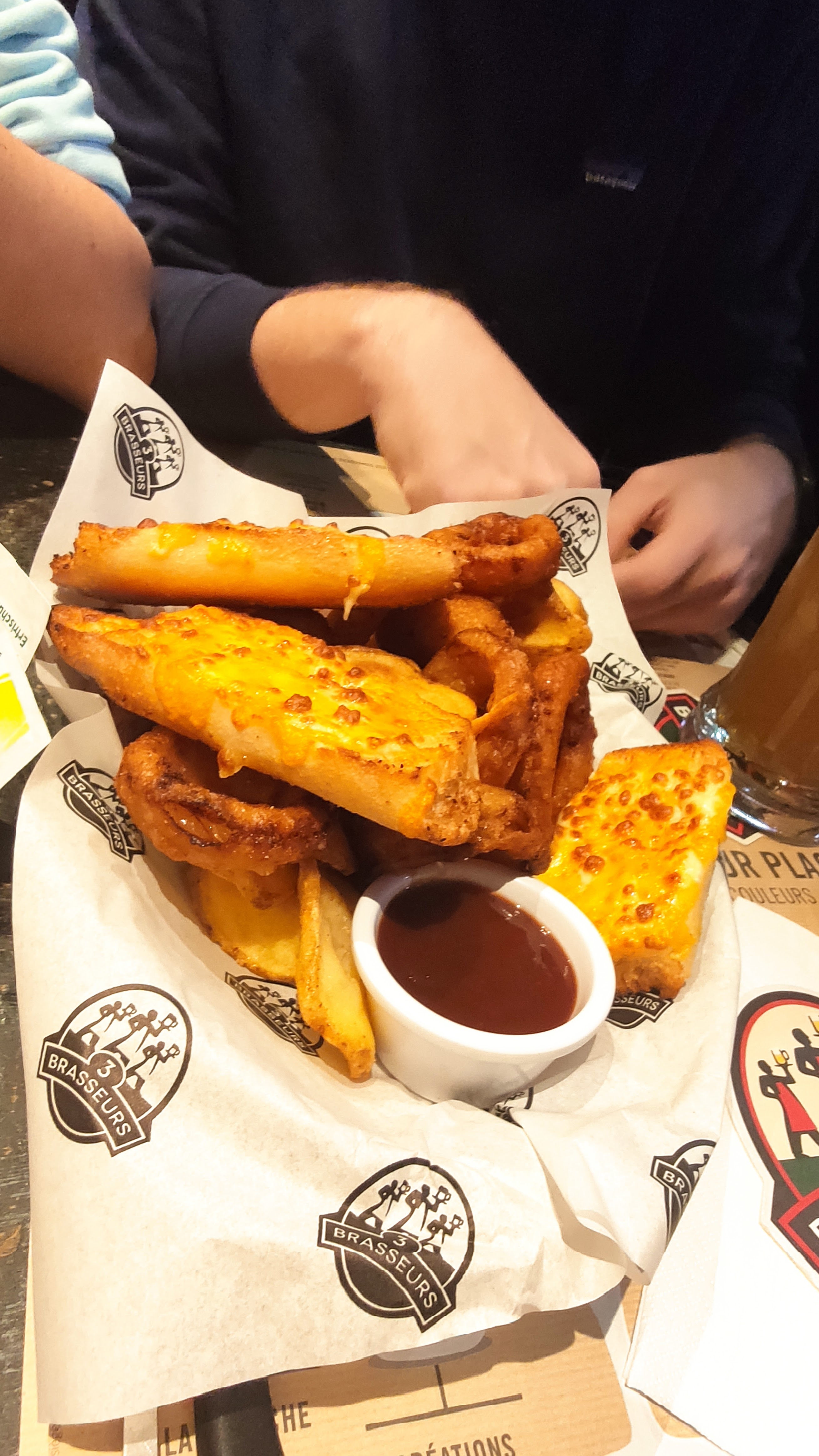 Nous avons récemment dîné au restaurant des 3 Brasseurs et avons eu une expérience mitigée. Les bières étaient délicieuses, et certains plats, comme les assiettes mixtes, étaient bons. Cependant, la poutine n'était pas vraiment authentique et l'entrecôte n'a pas vraiment impressionné. De plus, la portion de frites était petite, bien que les sauces au poivre et au cheddar étaient savoureuses. Malheureusement, nous n'avons pas pu commander de dessert car le service était très lent. Seules deux serveuses semblaient être débordées, tandis que trois autres serveurs étaient en pause dinner sur le floor, ce qui était déconcertant étant donné qu'il y avait encore beaucoup de clients à servir. Une meilleure organisation du personnel serait nécessaire pour améliorer l'expérience globale.