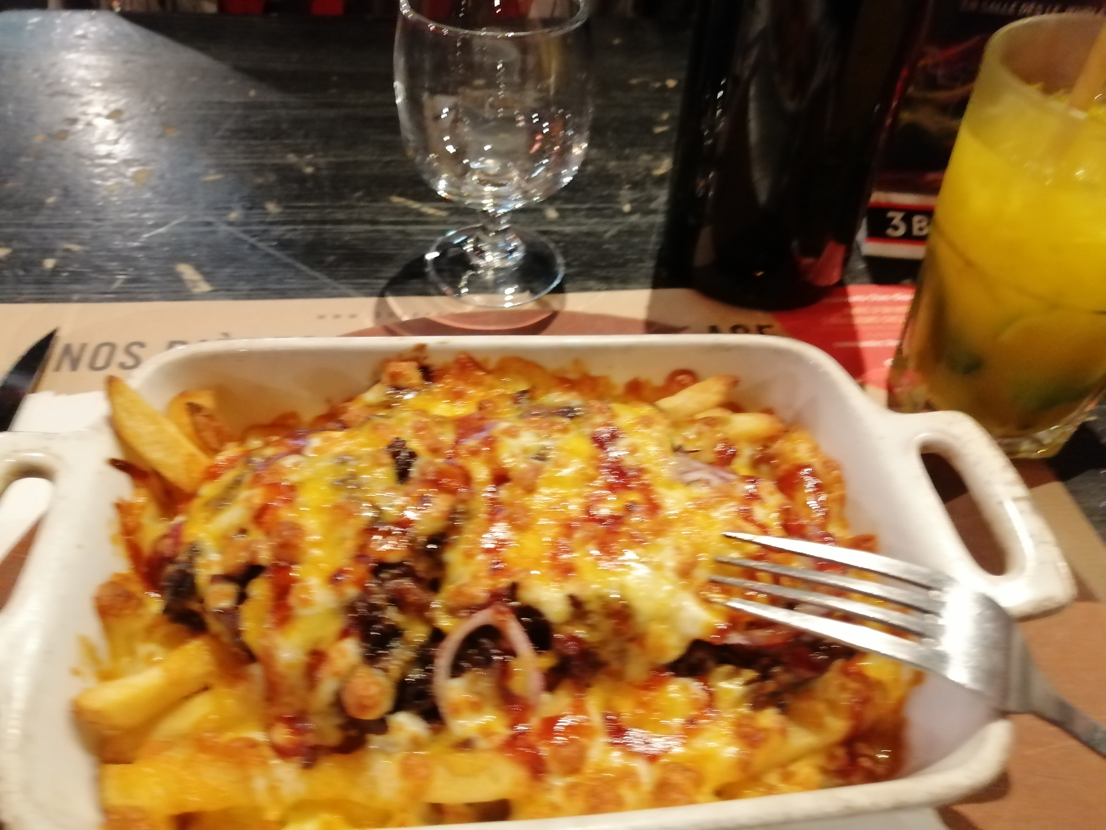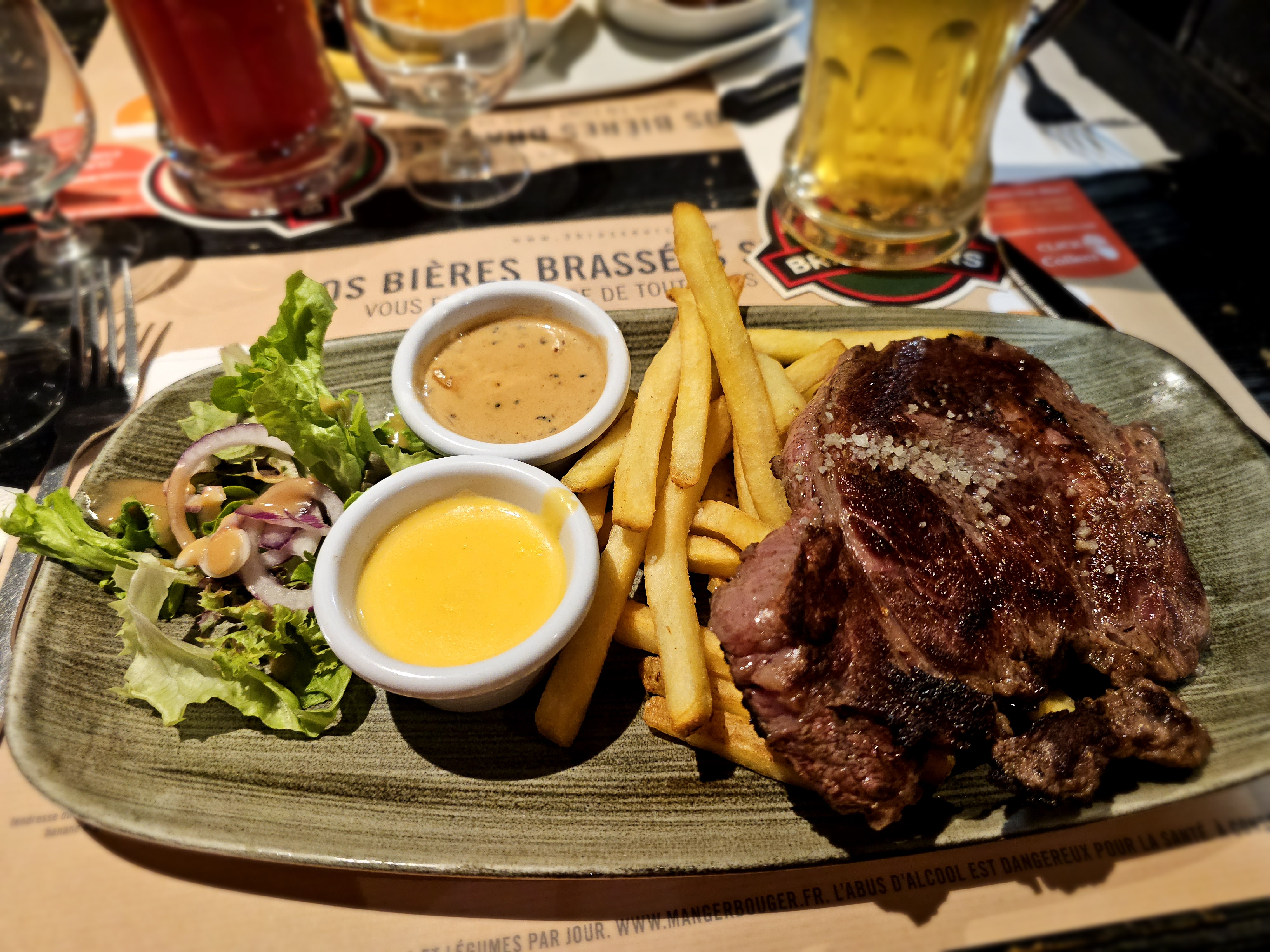 Serveurs au top ! La sauce aux poivres été froide. Mais la viande très bonne et la cuisson au top comme demandé. Frites très bonnes. Bière rien à dire toujours au top ! L'île flottante parcontre moyen. J'ai pas beaucoup aimé. Pas de bonne qualité. Sinon tous le reste rien a dire. Je reviendrais.
