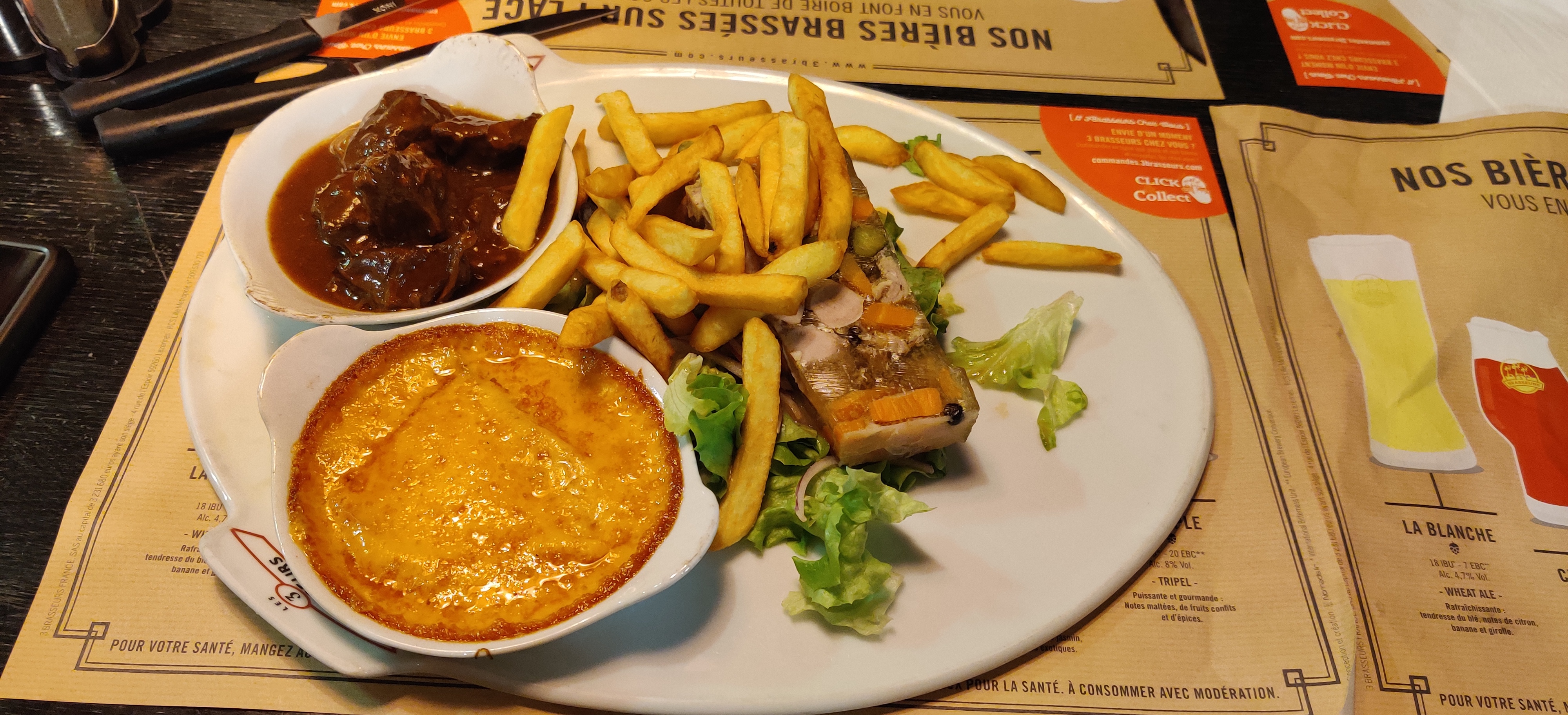 Très belle découverte Un peu d attente avant d être placé car il y a du monde mais ça vaut le coup d attendre Le service était rapide Excellente assiette gourmande des 3 brasseurs, la bière ambrée est très bonne et allait parfaitement avec le plat. Un régal aussi le café gourmand...bref un déjeuner parfait