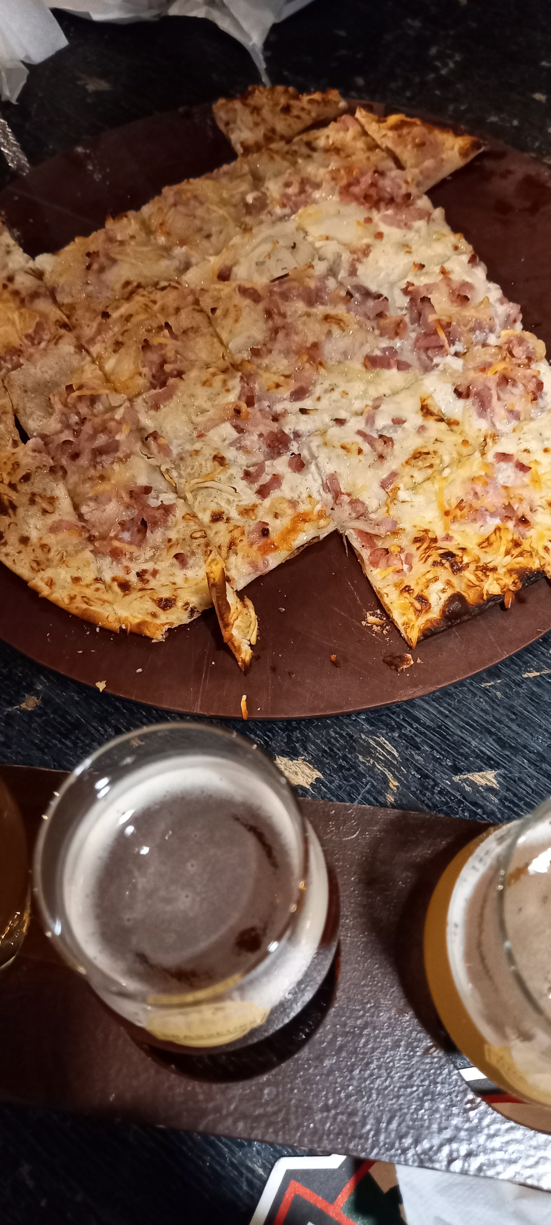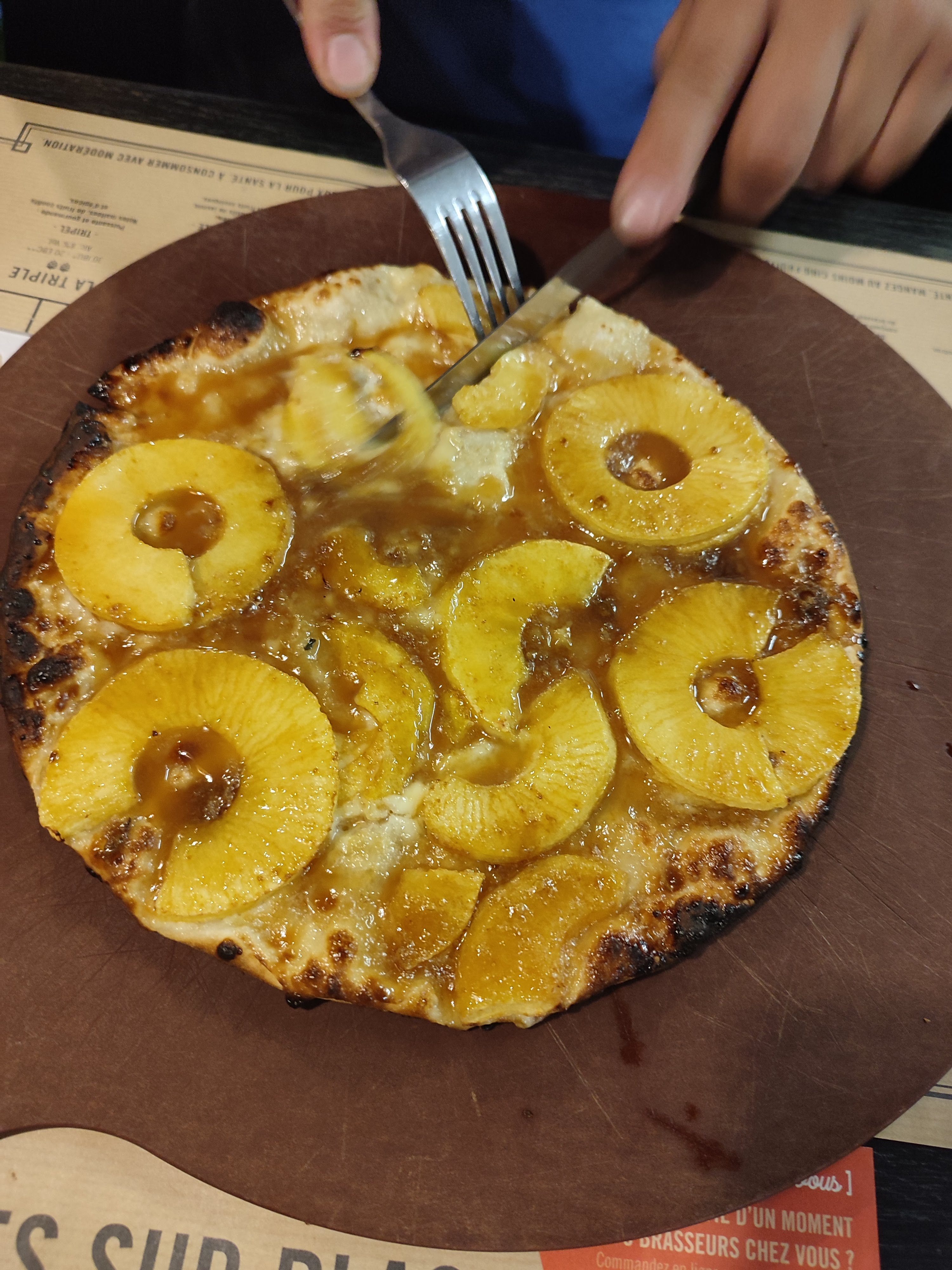 Renseignez vous sur les coutumes Alsaciennes .. Pour les partager avec convivialité, on y coupe les tartes flambées en parts et non en petits carrés .. Rien à voir au niveau dégustation. Nous recommandons une troisième flamme, le serveur nous promet qu'elle sera coupée en parts .. Je te le donne en mille Émile .. coupée en dés .. !! Je la refuse, le manager vient nous voir et ne veut rien savoir, avec son petit air Arrogant .. Le serveur très sympa, par contre. La 4ème tarte, nous l'avons commandée non coupée .. Les tartes sont très bonnes, la bière aussi .. Le personnel sympa et agréable .. Sauf le manager qui n'a aucun sens du commerce .. 😏😉
