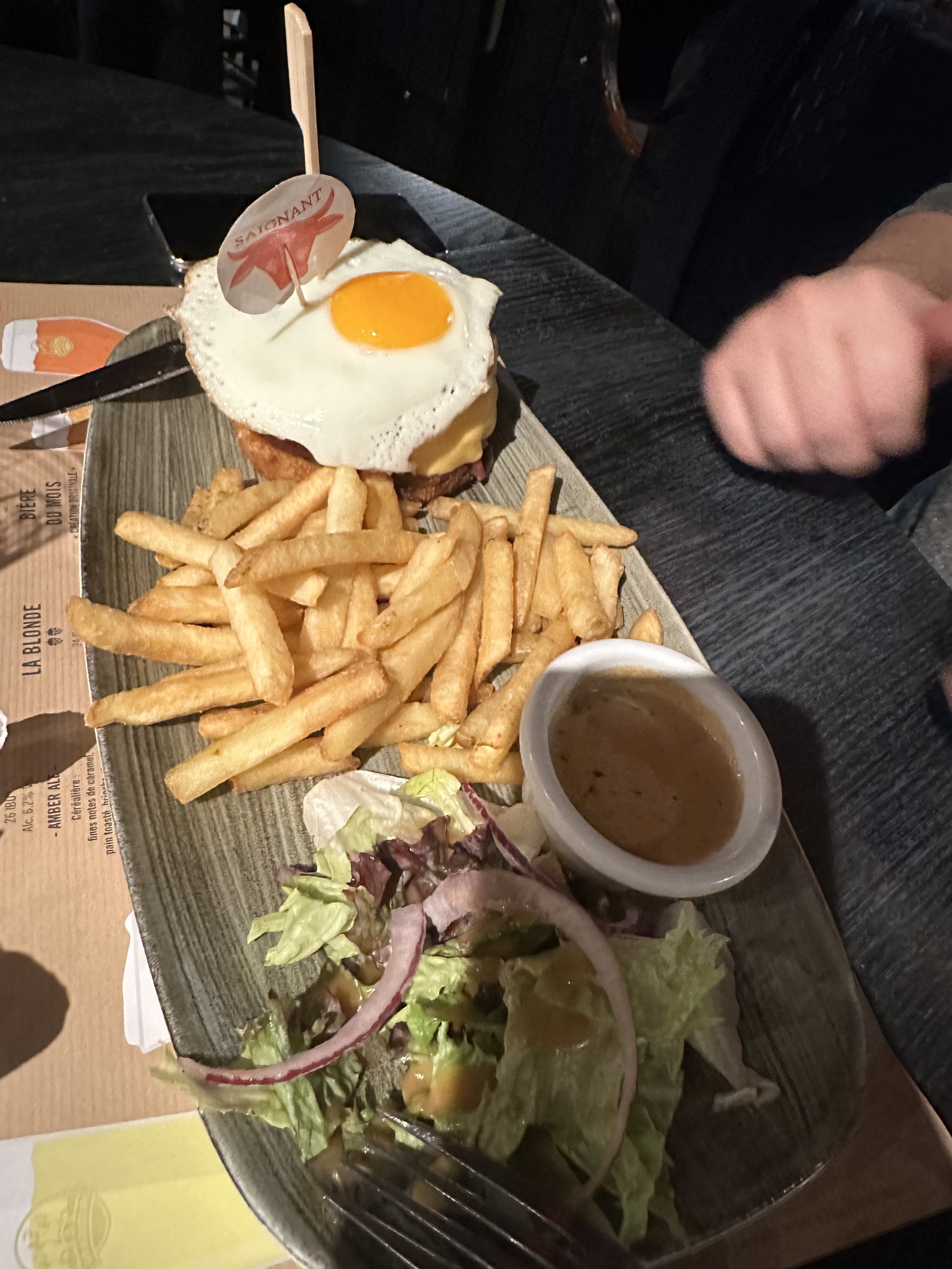 Un burger appétissant, la galette de pomme de terre se marie bien avec l'oeuf au plat. Je recommande la chèvre miel, un délice ainsi que la flamme du mois ognon lardon andouillette sauce moutarde, une tuerie !!!! Concernant la choucroute, elle était bonne mais pas exceptionnelle (info d'un Alsacien pure souche depuis des générations). Lieu assez sympa, vue sur les cuves, bar lumineux, sièges confort etc... Je recommande pour un bon restaurant entre amis ou entre collègues