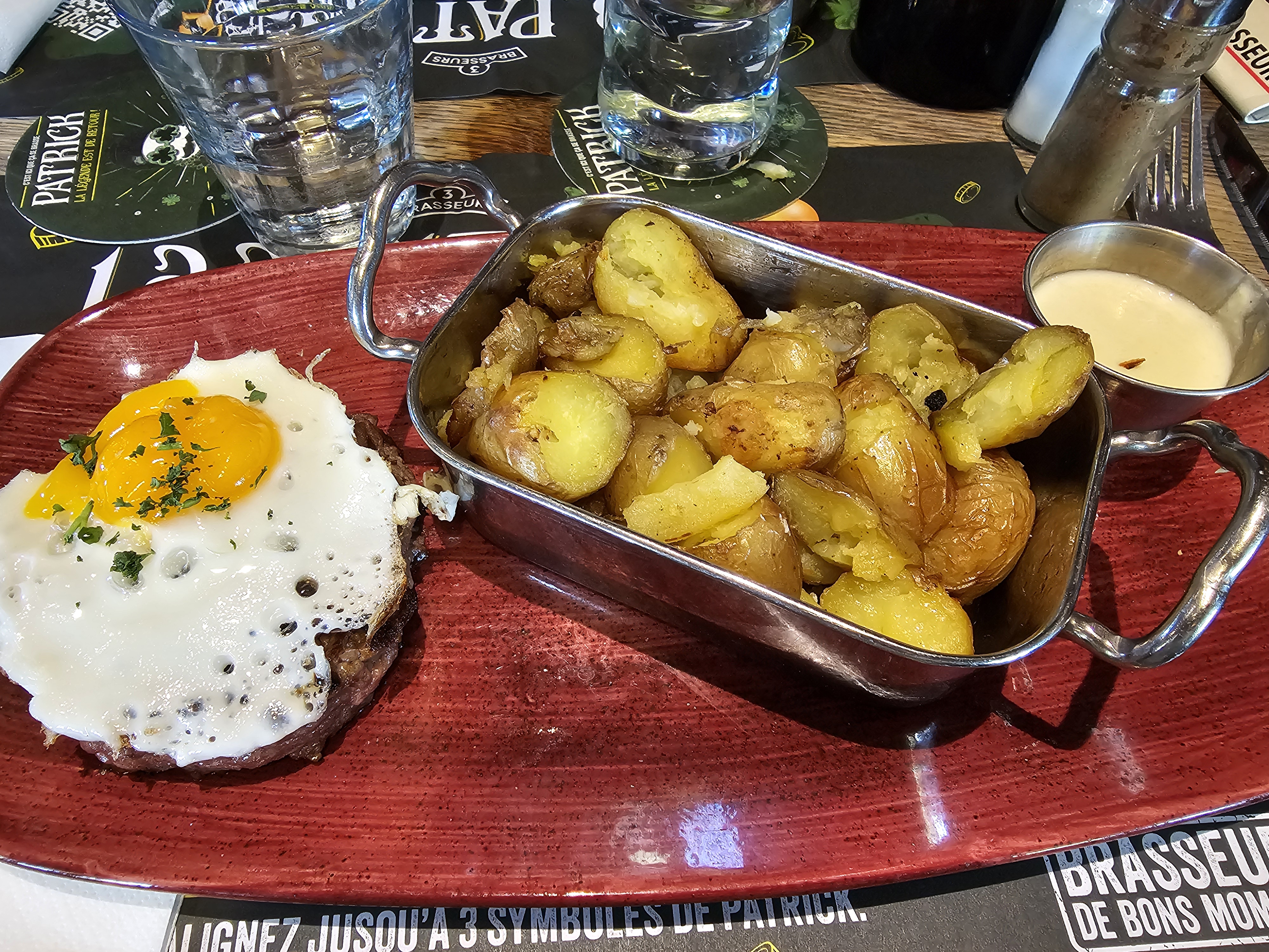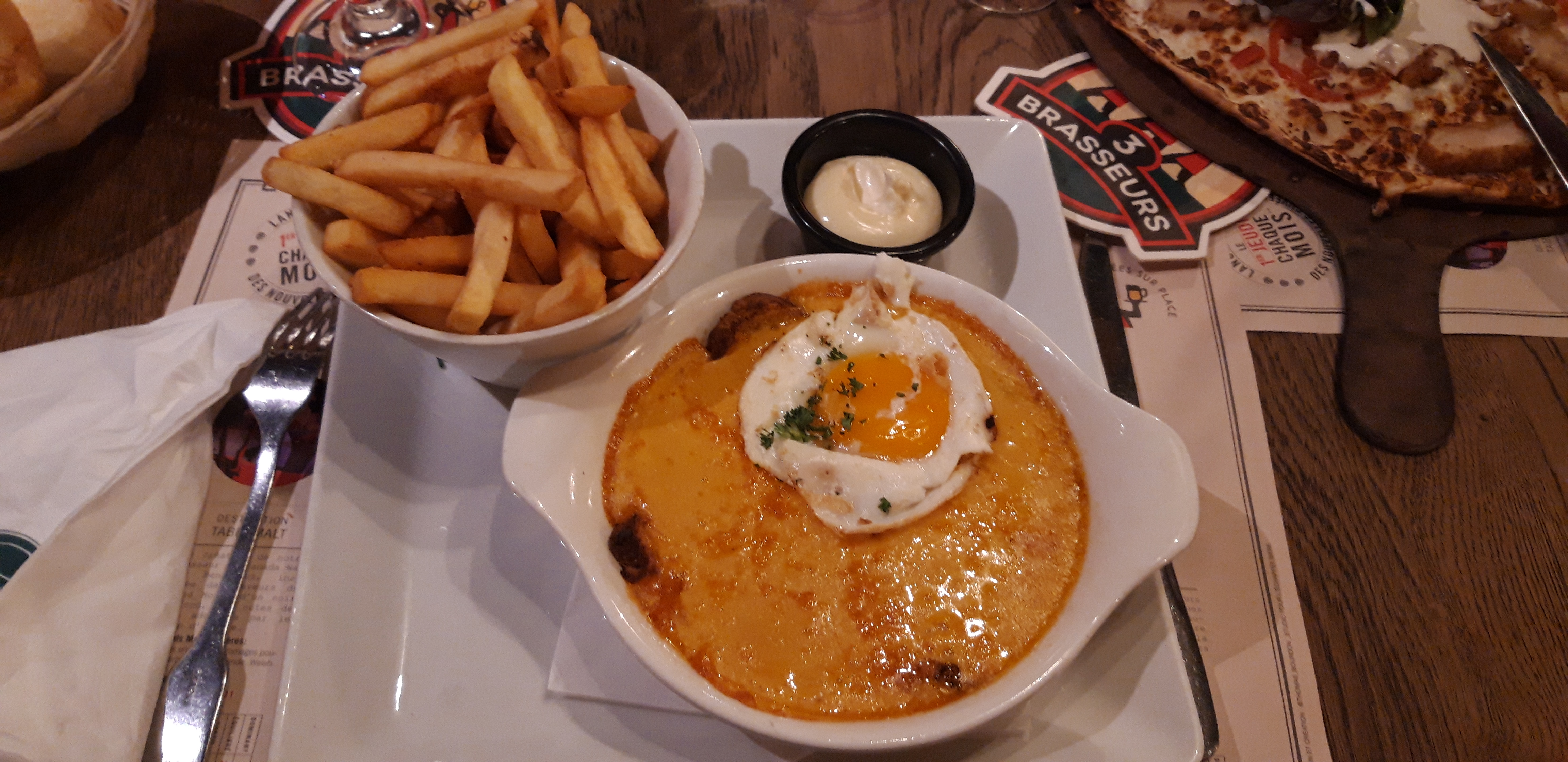 Nous sommes venu le mardi soir, concernant les commandes prises , nous avons tous prit le menu de 15euros qui comprend plat / dessert et boisson . Nous avons pris comme plat le steak à cheval, celui ci a plu à tout le monde, au niveau accompagnement , très déçu des frites, par contre le mélange de légumes était délicieux 👍 Au niveau des desserts, l'île flottante était bonne, les flammenkuchs au Nutella / banane et glace / pomme, belle visuellement mais je m'attendais à mieux au niveau du goût et quantité ( surtout au niveau des fruits ) . Pour conclure, c'était un bon repas au niveau qualité / prix, je donnerai 3 petits conseils, ce serait bien d'avoir des frites fraîches maison et pas des congelé surtout dans un restaurant, de rajouter des fruits au niveau des desserts flammenkuchs, et dernière petite chose, avoir un petit accompagnement avec les boissons apéritif ( ex : cacahouètes ) . Si il y aurait ses petites améliorations, je mettrai sûr 4 étoiles minimum .