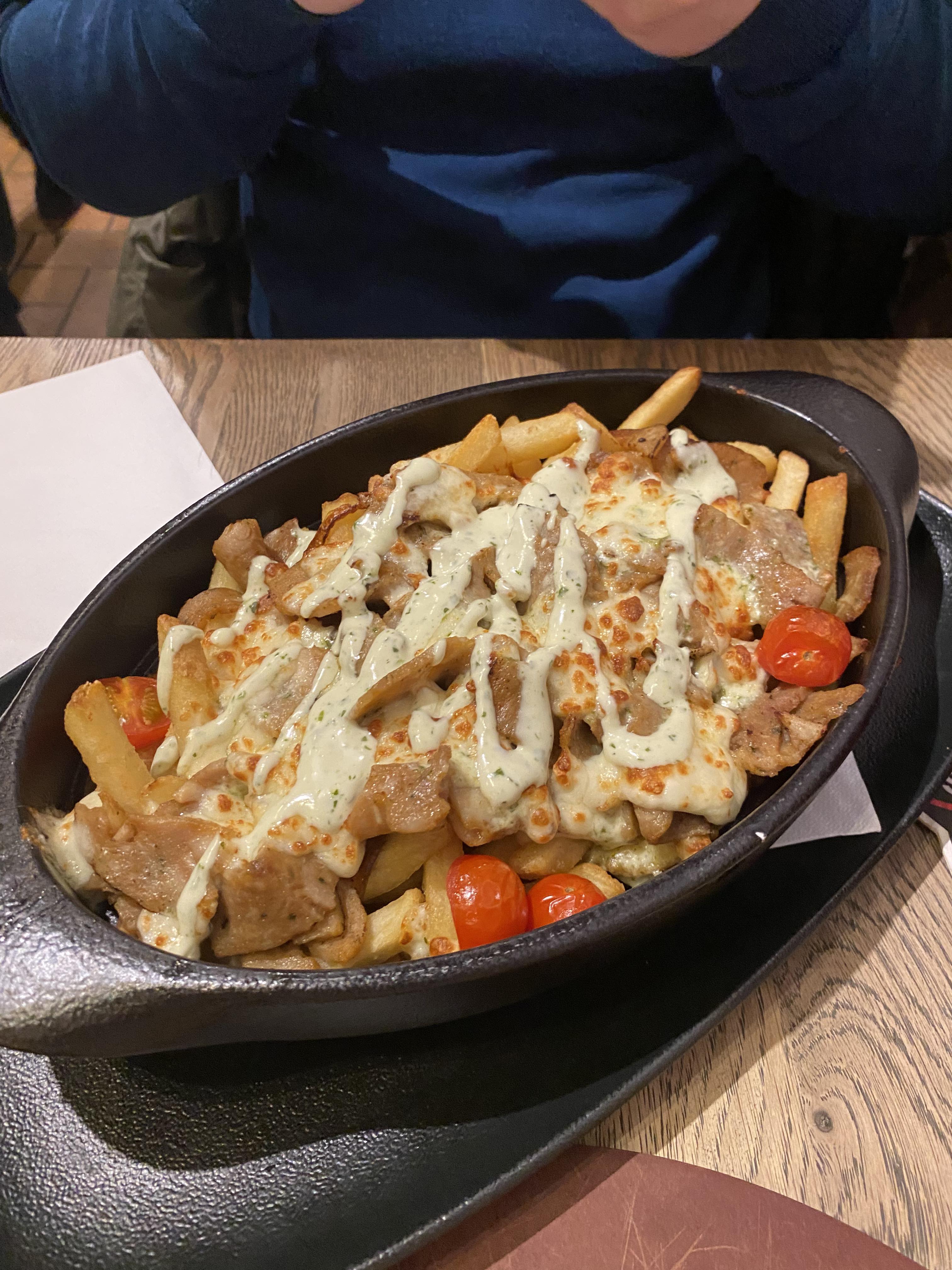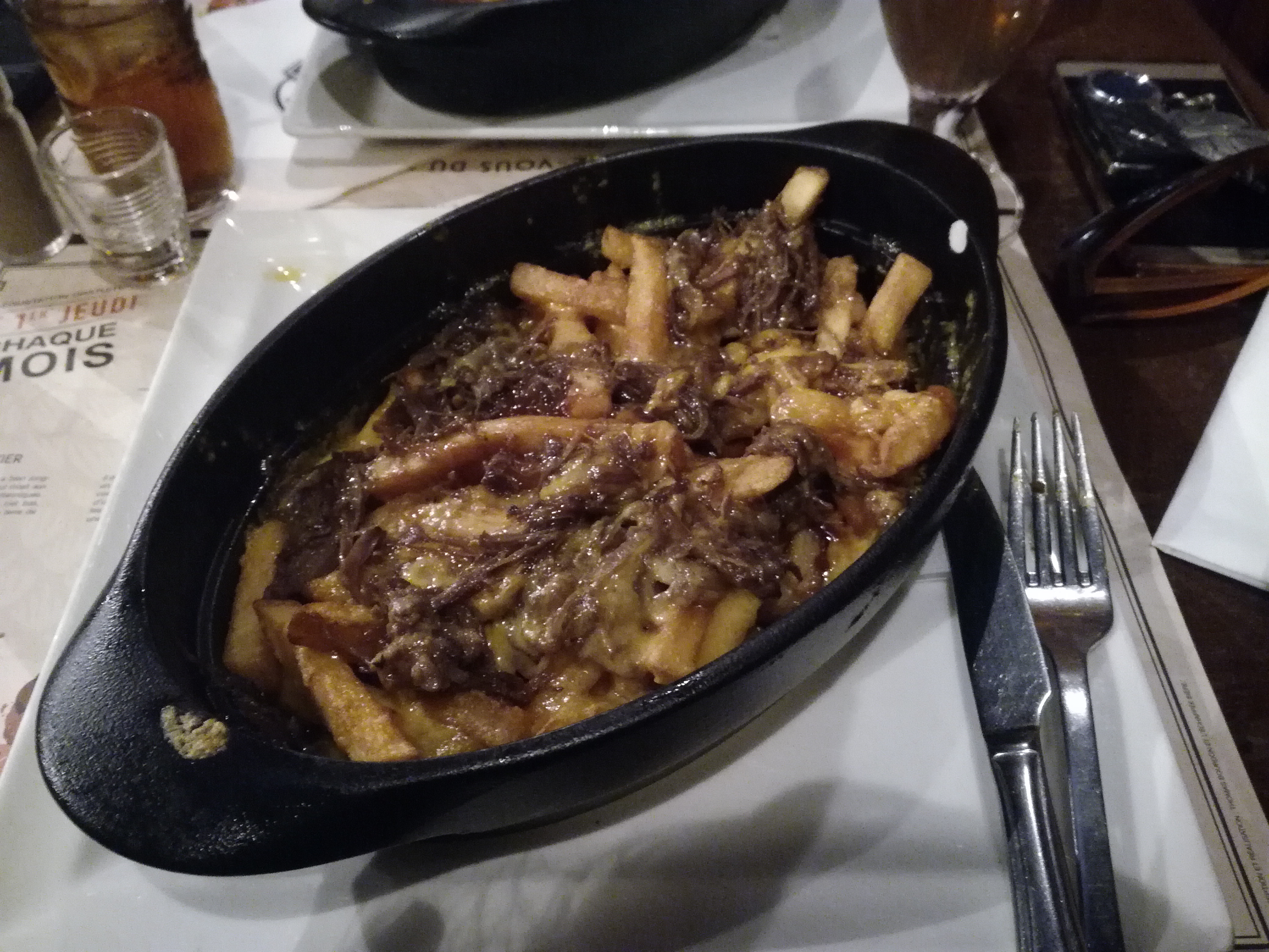 Bien qu'on ne soit pas au Québec, une poutine ce n'est pas des frites toutes molles, sans sauce (très sec) avec de la viande par dessus... Très déçue, si vous voulez bien manger, prenez les flammekuche, ça c'est bon ! (et moins chère).