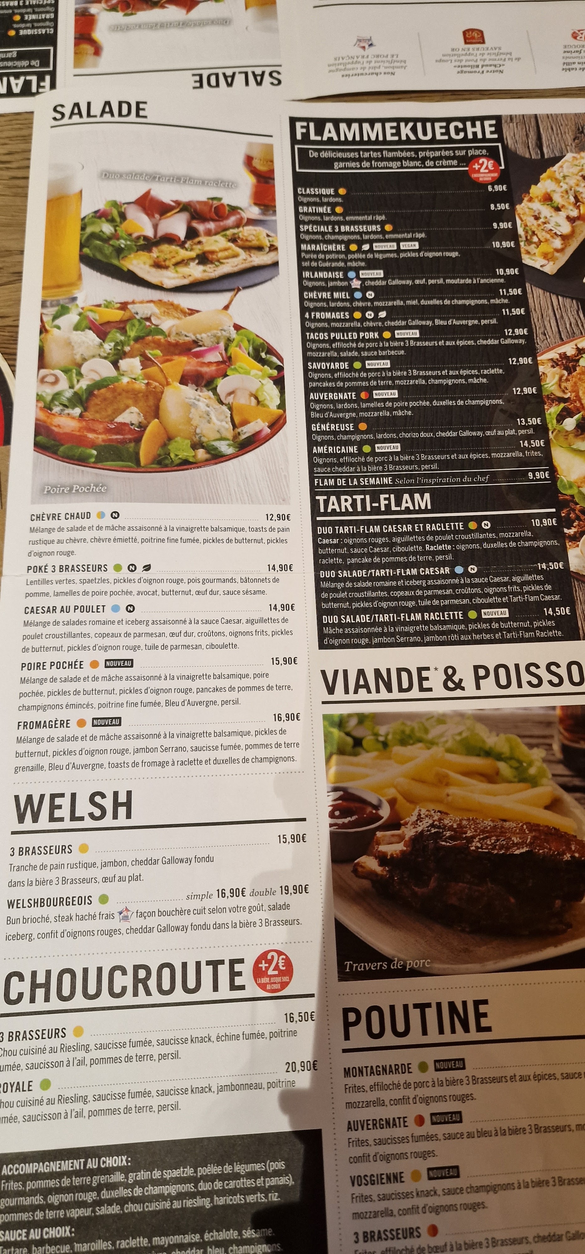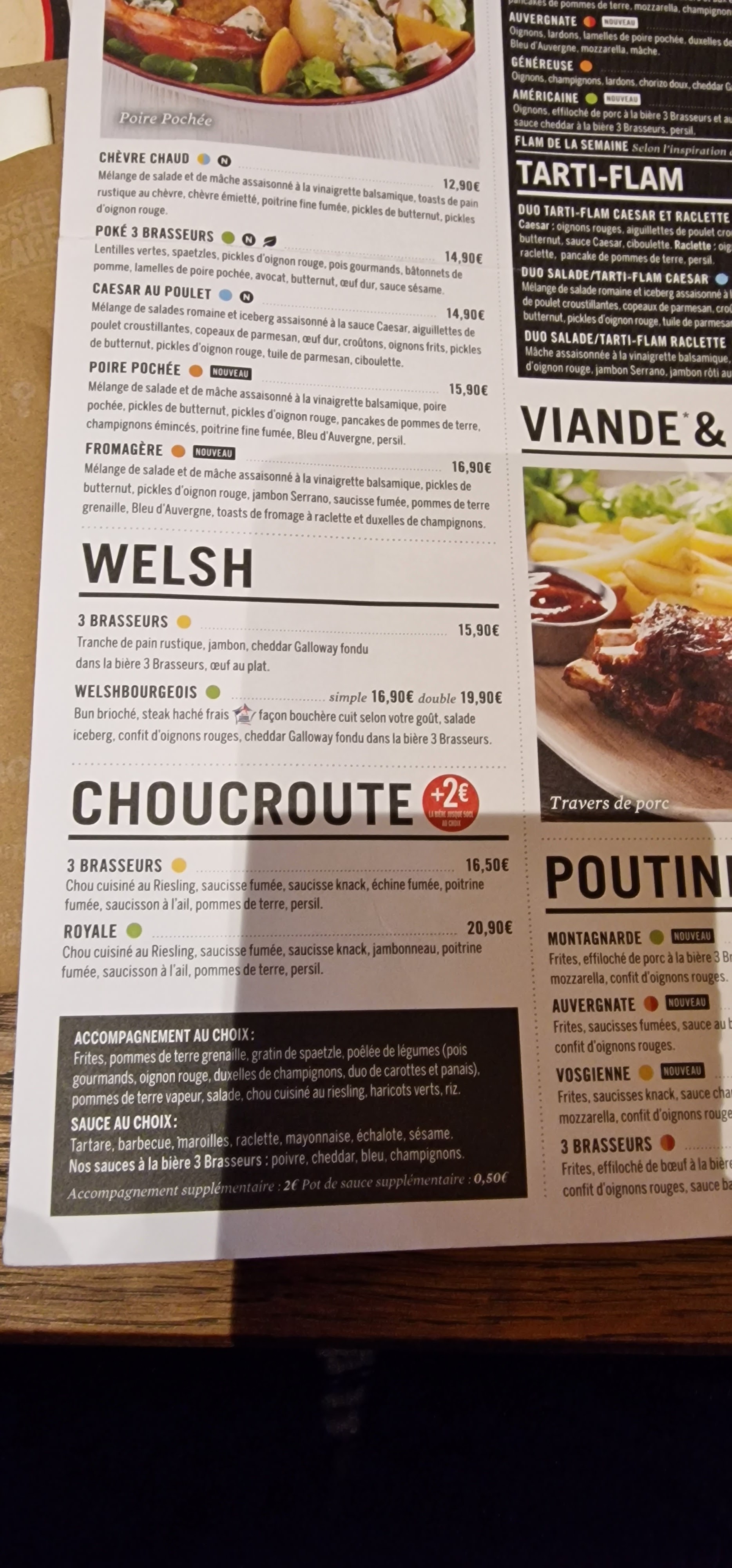 Visite du 12/05/2017 1/5 Accueil ???? On parle de quoi ??? Pardon ???? Ah oui, le truc que l'on ne trouve pas au 3 brasseurs. Juste risible pour être polis. A deux doigt de quitter les lieux. 3-4 serveurs sans activité et personne ne vient prendre la commande, on est juste dans une autre dimension. Ne surtout pas venir en période creuse (18h00-19h00), le services est débordé, pour 10 clients. Ratio serveur/client 6 pour 10. Mdr, il faut mieux le prendre avec le sourire. Dommage que le petit futé indique Sans doute le plus chouette établissement de la chaîne sur la region ça peut faire peur. Pour les plats, le welsh est correct au vu du prix. Les pâtes poulet maroilles très bonnes, dommage que le coeur du plat était froid, les pâtes au centre etaient pleines d'eau froide. Ça rend le plat vraiment pas top. Heureusement que nous avons été pris en main par une nouvelle serveuse qui n'a encore pris les bonnes habitudes de ses collègues (amorphes, hébétés, accompagnés d'une tête d'enterrement). En clair, il ne faut vraiment pas attendre une qualité de service, qui dépend fortement sur quel individu on tombe, mais ça reste très correct sur le qualité/prix. Cadre: 4/5 Accueil: 0/5 Qualité/prix: €€€ Qualité du Service: 1/5 Rapidité du service: 3/5 Qualités gustatives: 2,5/5 Propreté des toilettes: en début de service les toilettes sont déjà en mode sinistrées. 0/5 Atmosphère: décontractée, chargée mais bien, bruyante. Visite du nov 2016 3/5 Cadre: ●●●● Accueil: ●●● Qualité/prix: €€€ Qualité du Service: ●●●● Rapidité du service: ●●●● Qualités gustatives: ●●● Propreté des toilettes: ●● Atmosphère: bruyante, rustique, décontractée Commentaires: Au menu, steak à cheval et un chti Burger double steak. Cuissons loupées. Un steak à cheval saignant se transforme en bien cuit et 2 ème steaks à point se transforment également en bien cuit. en début de service avec 6 personnes dans le resto, louper la cuisson c'est juste abusé.