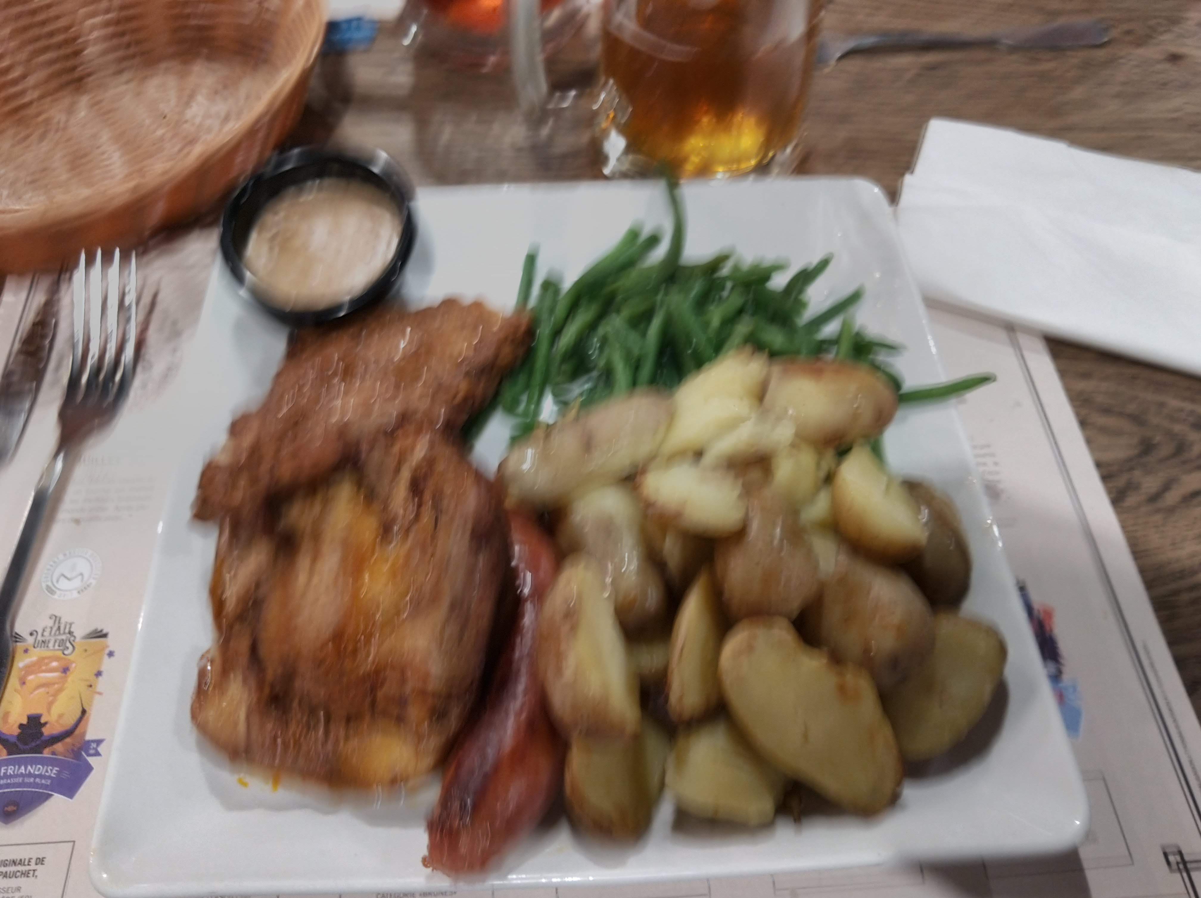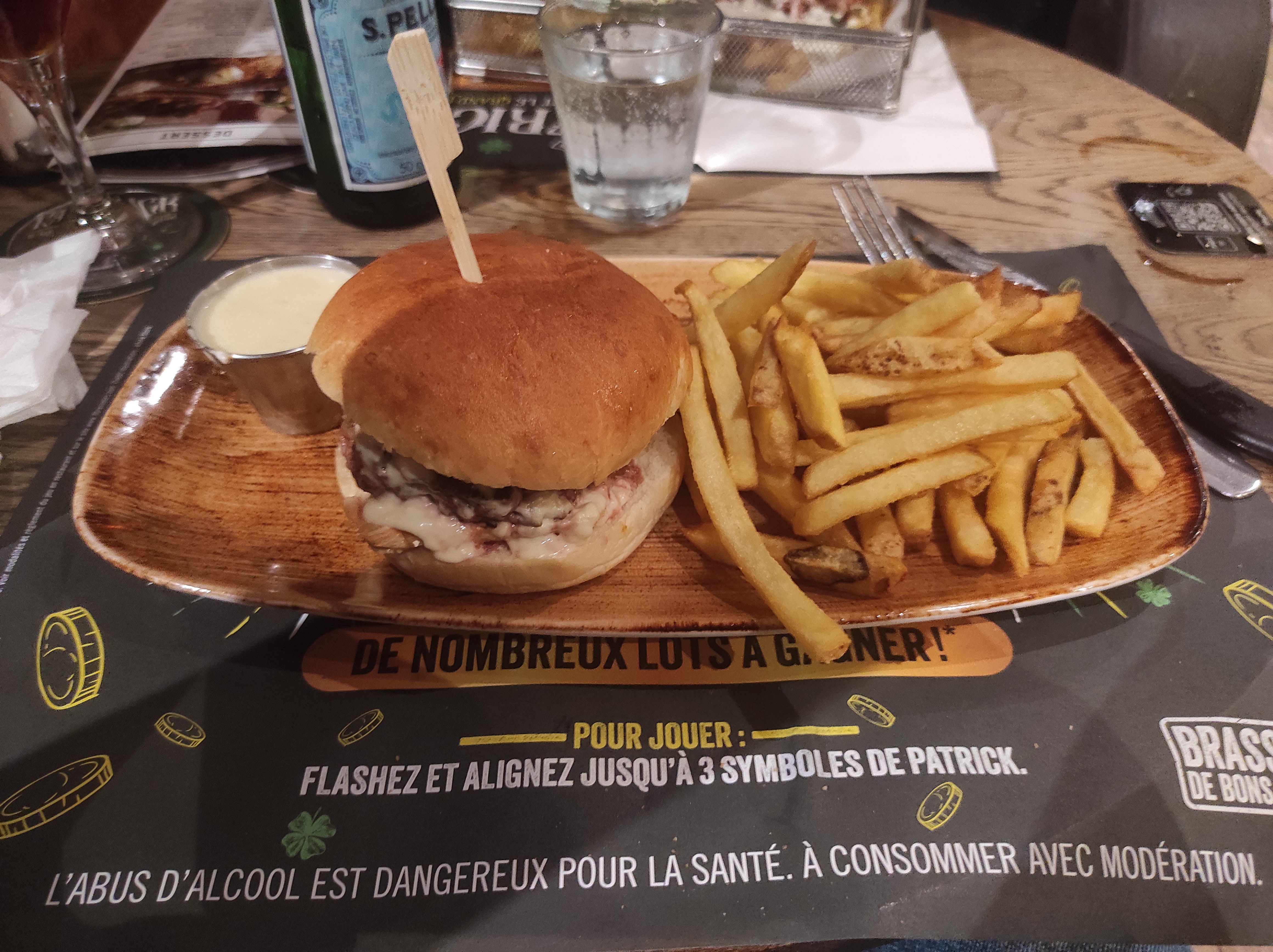 Accueil moyen. Service assez rapide. Les frites sont surgelées assez de cette pratique. Tellement simple a faire des frites maisons. Sauce en sachet. La presentation reste correcte. J aime bien le cote ludique comment faire de la biere. Fait biere les plats maison comme la biere