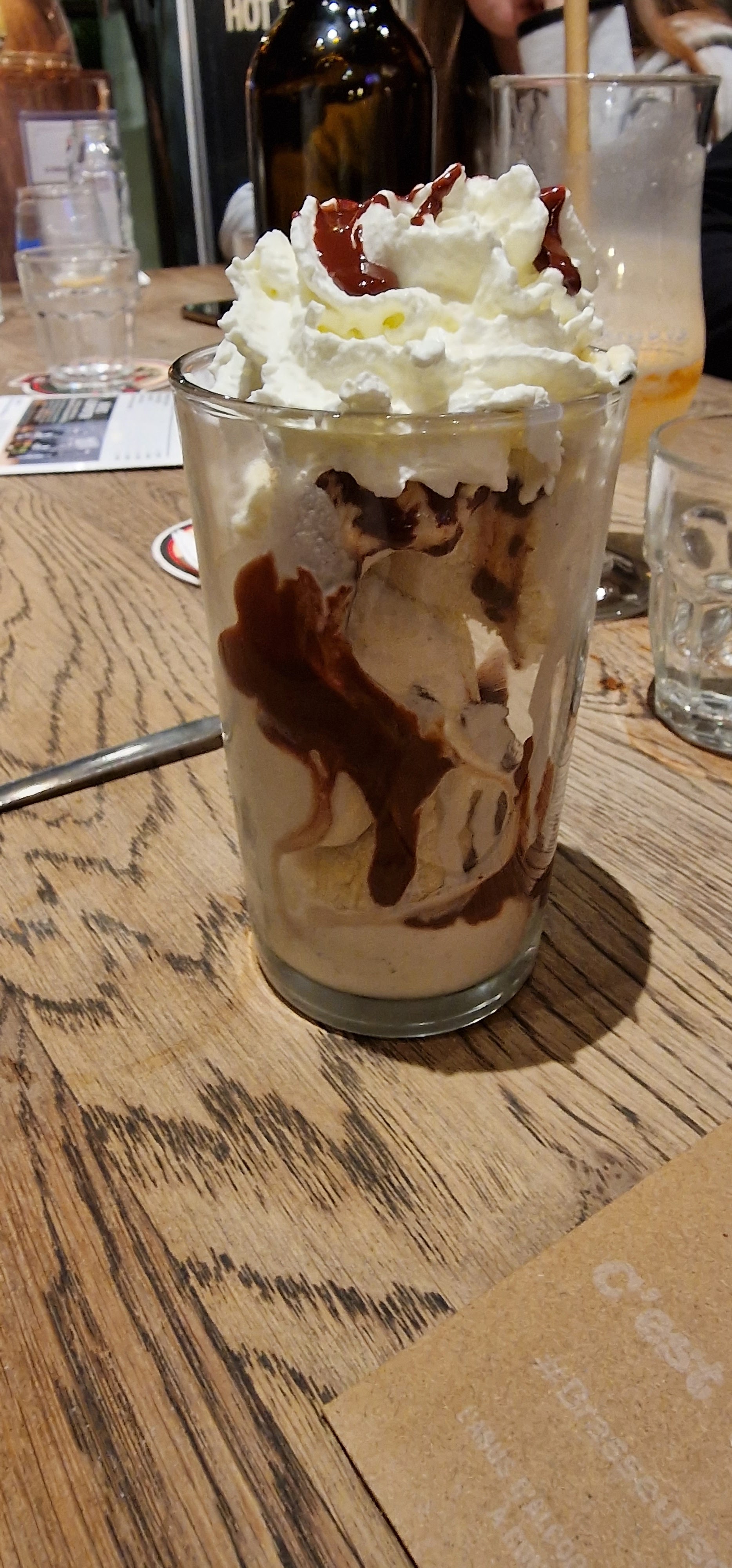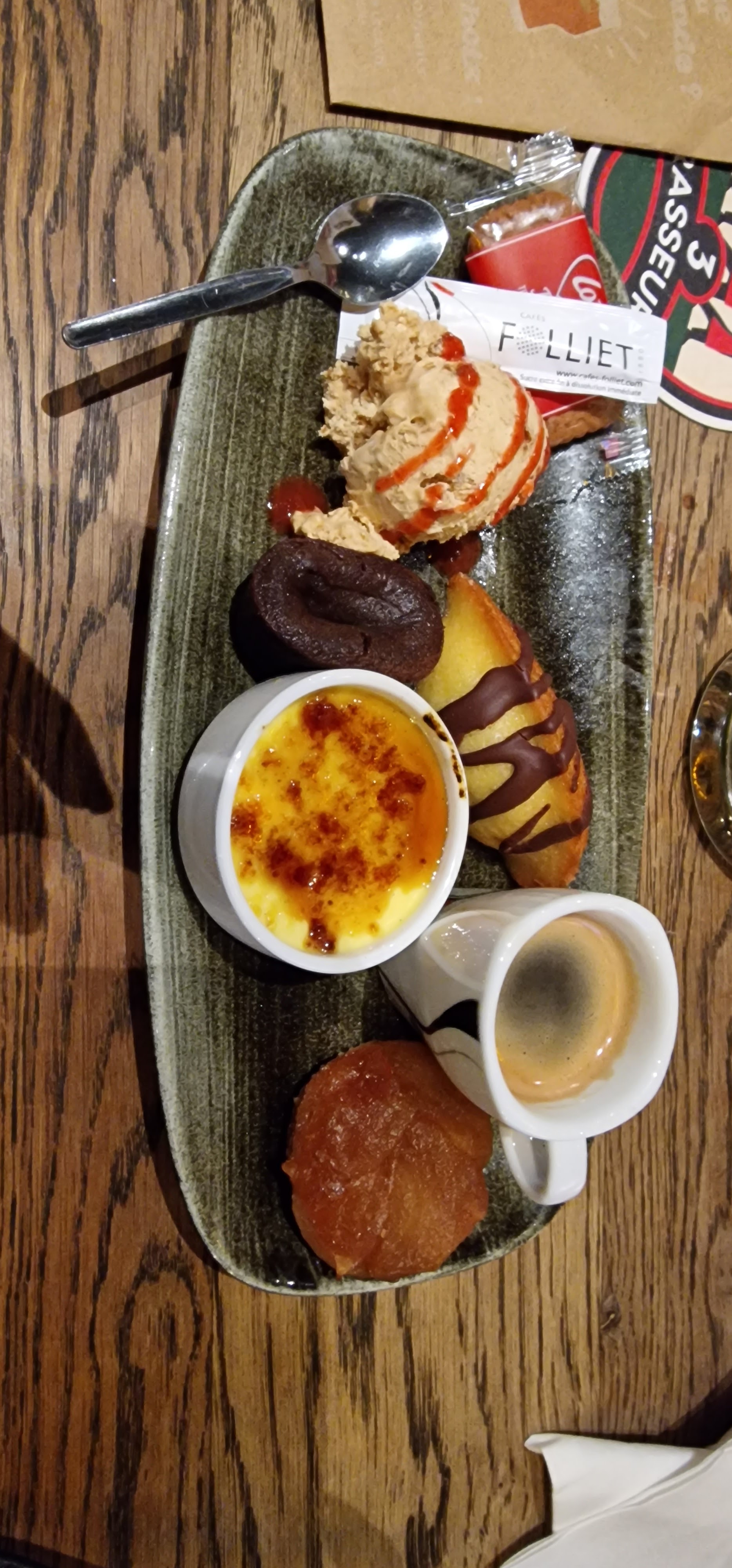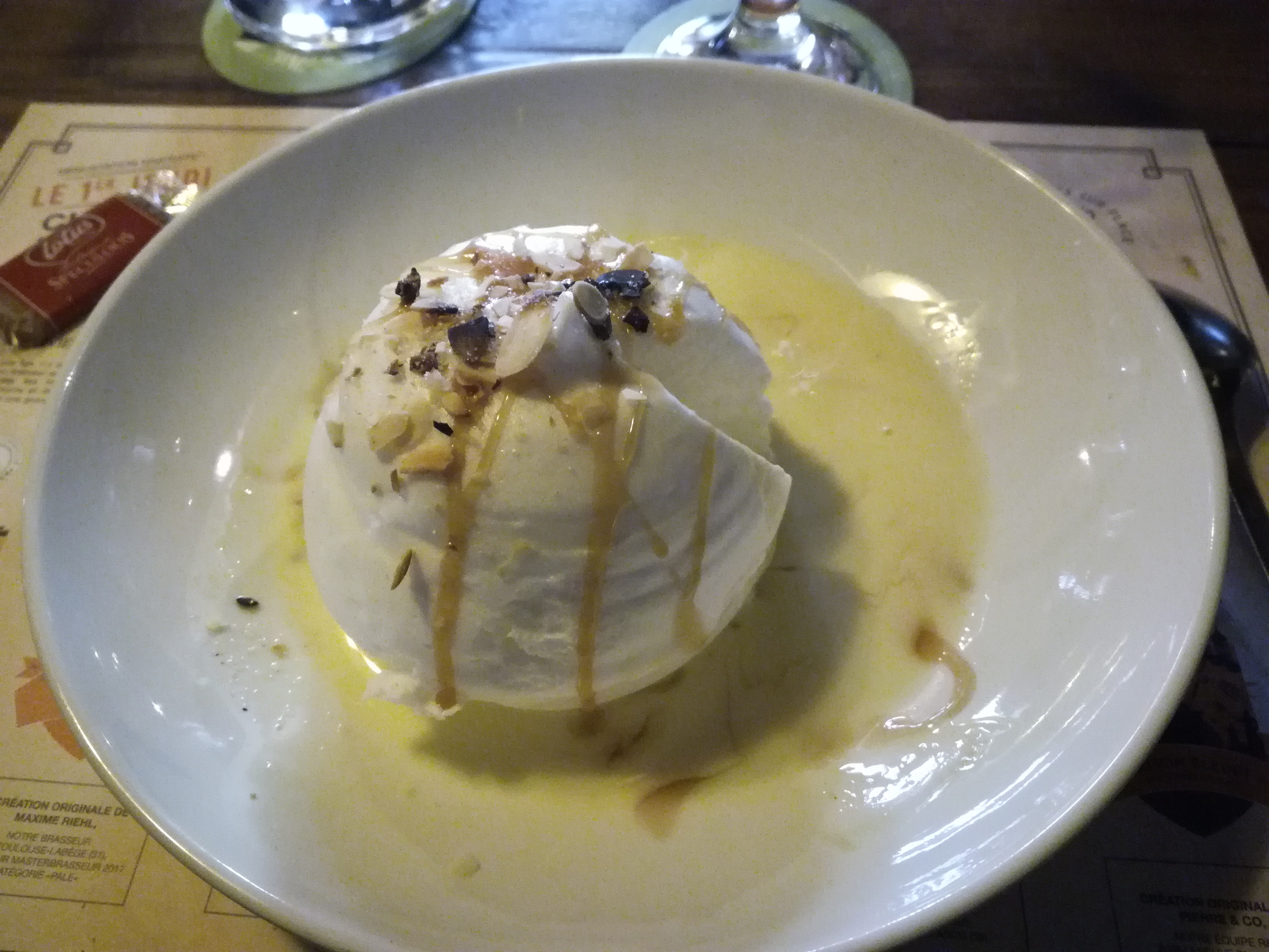 Première fois qu’on me sert une glace complètement fondue dans un restaurant, mais bon apparemment cela ne choque pas le serveur. D’après lui, « la glace ça fond vite ». Oui, surtout si elle a traîné un moment en cuisine…