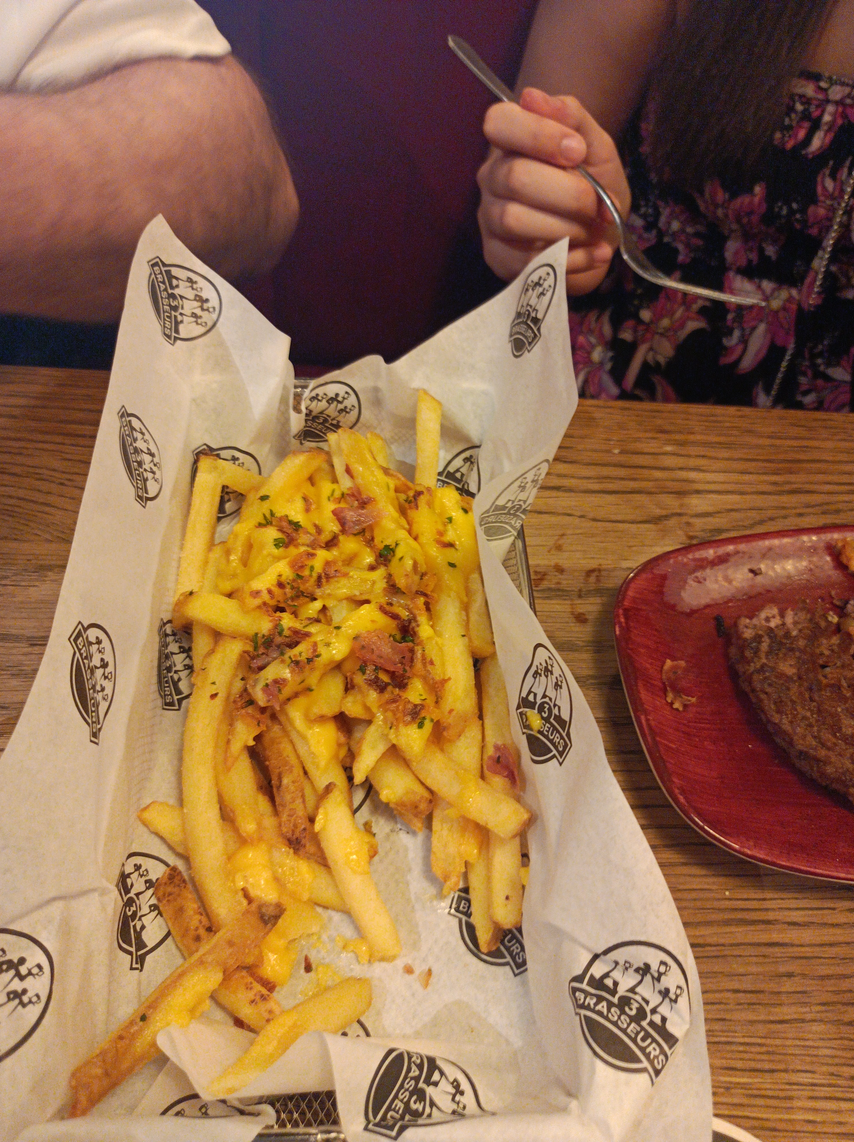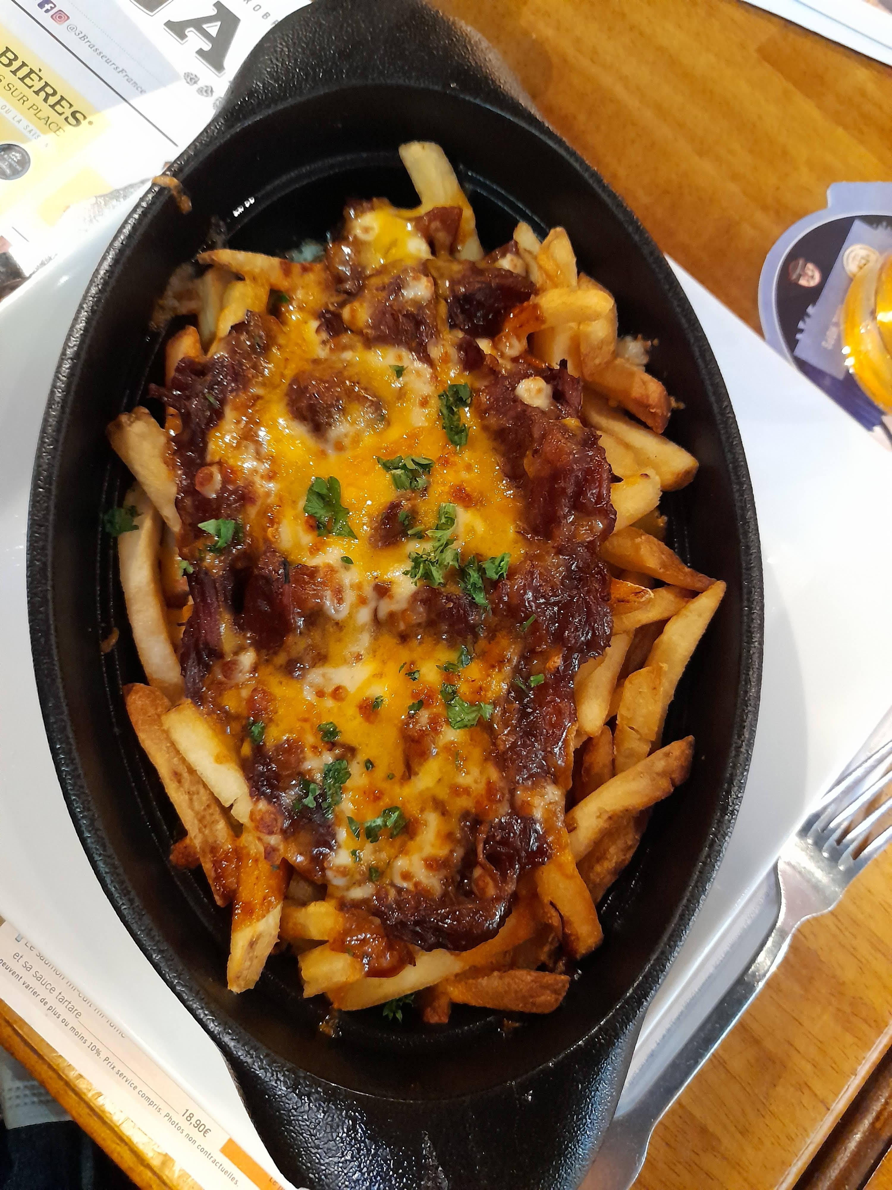 J'ai pris la poutine des 3 Brasseurs qui contient des frites avec un effiloché de bœuf à la bière des 3 Brasseurs, du cheddar Galloway, de la mozzarella, un confit d’oignons rouges, sauce barbecue. Appétissant sur le papier mais la déception en bouche : ce sont des frites surgelées même pas totalement cuites, quel gâchis... Notons un point intéressant de leur carte : il est possible de remplacer les steacks hachées de leurs menus part des steacks végétaux 👍