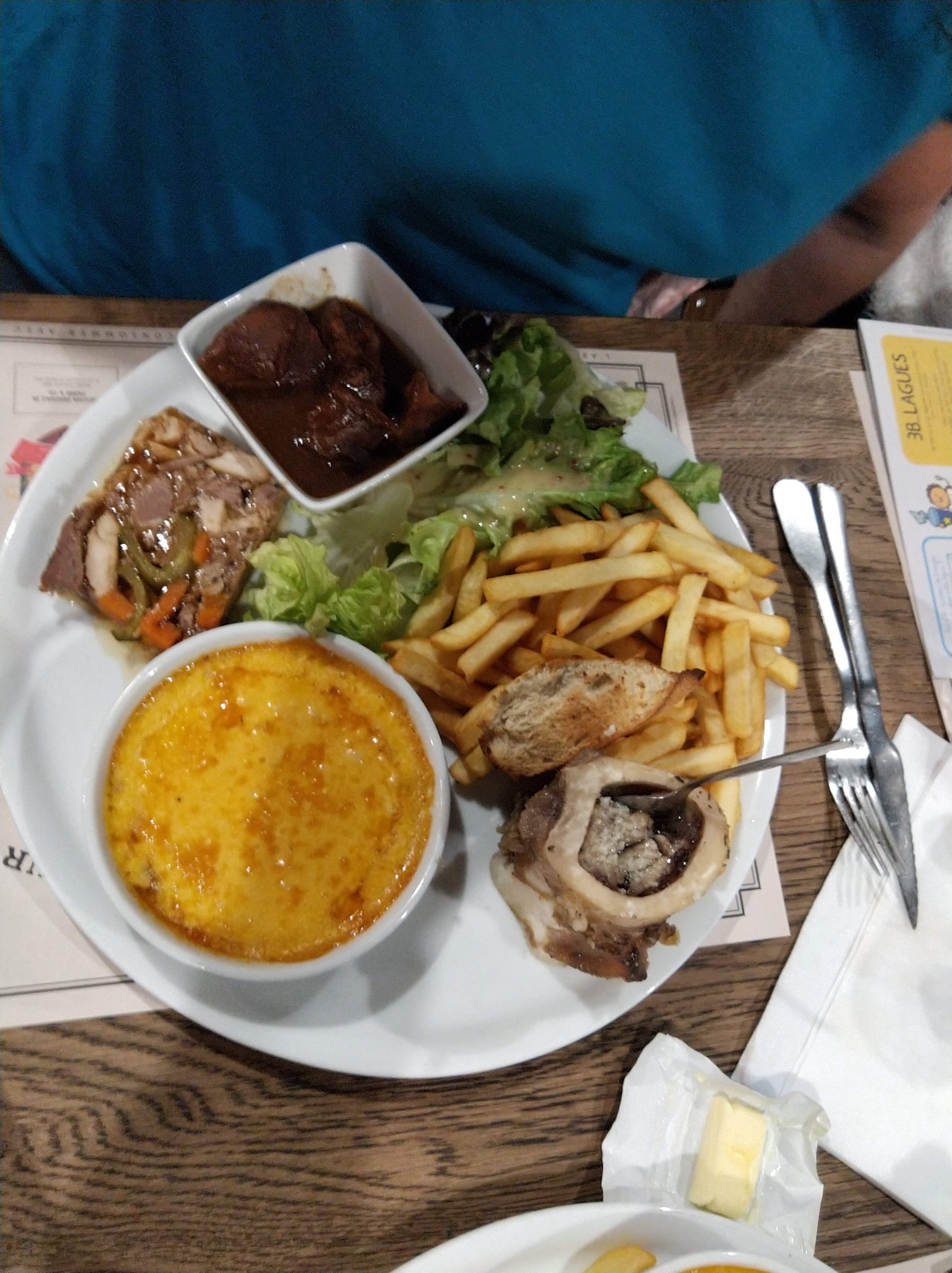 Les carbonnades frites très bonnes et Flammekueche aux pommes, copieux comme repas. Et une ambiance chaleureuse.