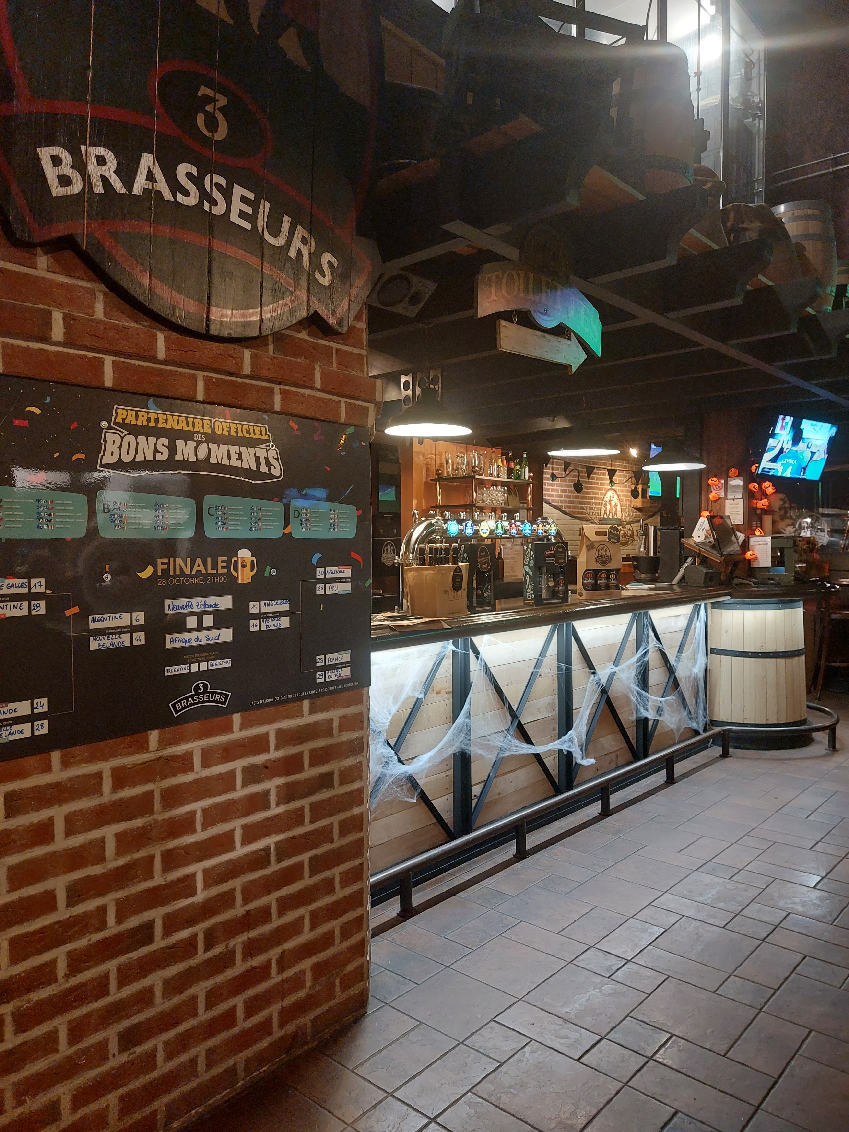 Nous nous sommes arrêtés dans ce restaurant sur notre itinéraire, un peu pressés car il y avait encore beaucoup de route mais nous n'avons rien dit car il y avait beaucoup de monde pour un dimanche soir. Le restaurant comportait de nombreuses décorations à l'occasion d'Halloween, des plus amusantes aux plus inquiétantes pour les plus jeunes, très sympa. Il a fallu attendre un bon moment pour que de la place se libère mais tout a été très vite ensuite grâce à la compétence de la serveuse et sûrement des cuisiniers également. Accueillis chaleureusement comme dans tous les restaurants des 3 brasseurs, nous avons immédiatement été invités à commander. Pas le temps de regarder la carte mais en étant pressés c'est pas plus mal. Un grand classique du coup et une valeur sûre, l'assiette gourmande : carbonade flamande, welsh et une nouveauté le poulet au maroille. Un délice, même mon fils a tout goûté et a adoré. La sauce du poulet au maroille est une merveille. Peu de frites par contre. Mon fils a pris des aiguillettes de poulet très tendres et juteuses avec de la vraie viande. Rien à voir avec les poulets panés (reconstitués) qu'on trouve ailleurs. Souvent les repas enfant sont vraiment bof ailleurs, pas ici. Une bière ambrée fabrication maison pour accompagner le tout. Leur savoir-faire en matière de brassage n'est plus à démontrer, toutes leurs bières sont vraiment bonnes, et même si je n'avais pas le temps cette fois, la dégustation de plusieurs petits verres de bières sélectionnées personnellement est très intéressante. À peine le temps d'aller se soulager que nos desserts étaient déjà servis. (ils ont été commandés tout juste en quittant la table). Redoutable efficacité malgré l'affluence. Café gourmand très bon, même le café lui-même. Surprise finale, il s'agit d'un jour où les repas enfants sont gratuits, du jamais vu ailleurs pour ma part. Une trentaine d'euro pour mon fils et moi, un très bon prix pour s'être régalés, merci. Je pense que je m'y arrêterai plus souvent désormais lorsque de passage. Une belle adresse, la clientèle nombreuse explique tout.