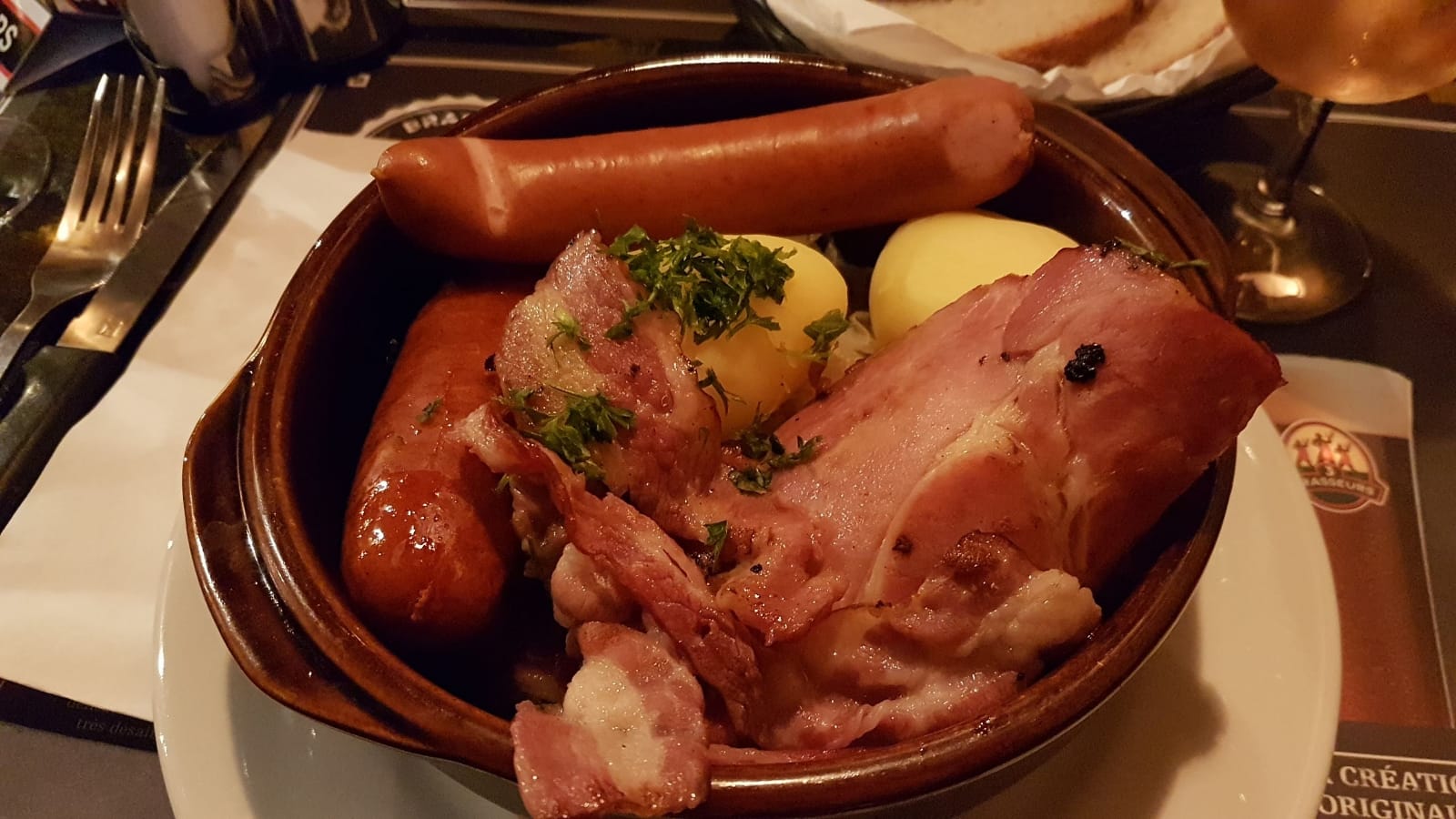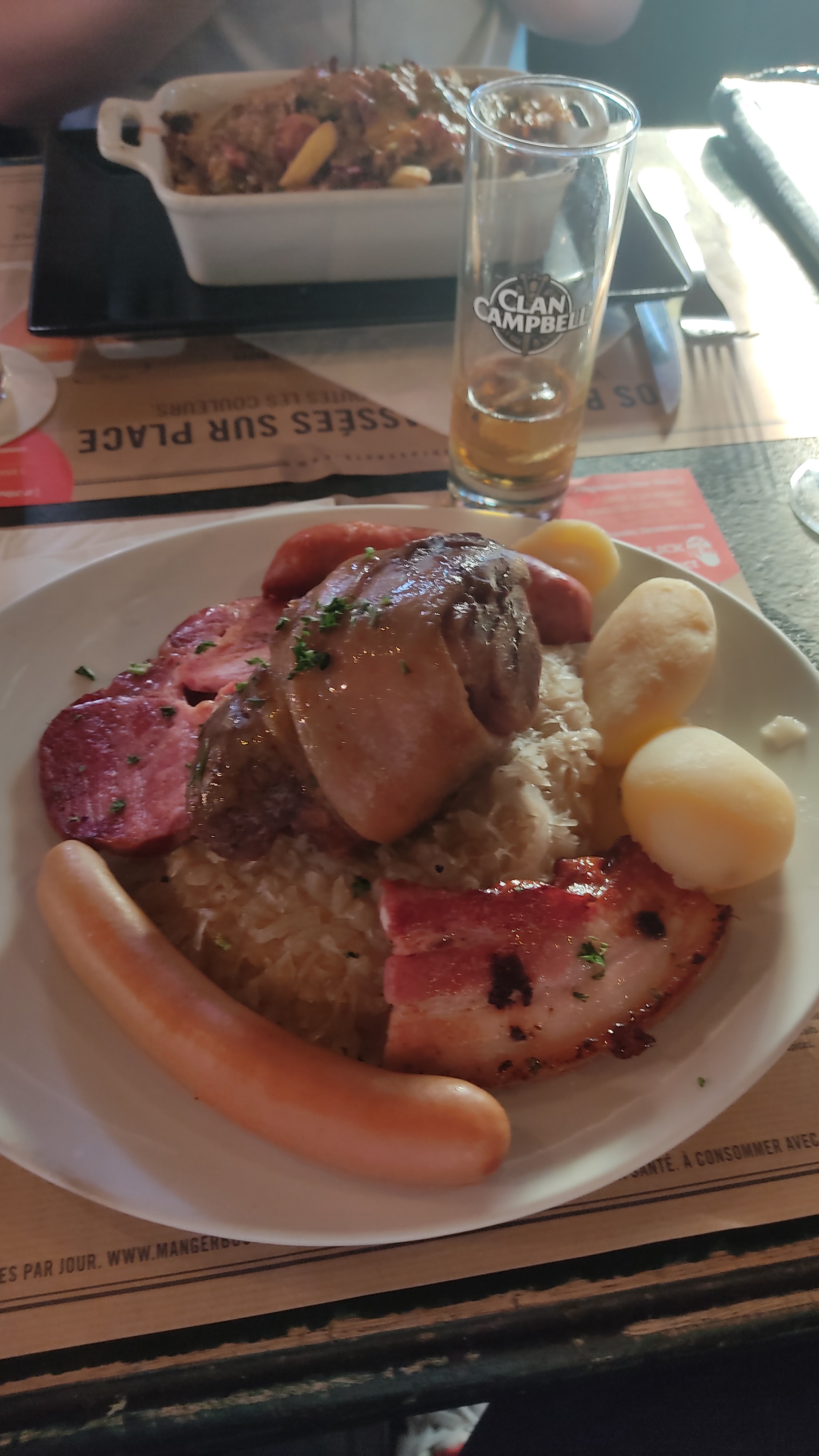 Nous y avons passé un très bon moment. Les photos que j'ai publiées parlent d'elles-mêmes. Un très Bon morceau de jarret dont la viande se détache toute seule de l'os sans partir en bouillie, ce qui évoque une très bonne cuisson. Une bière blonde de 50 cl à 2€ en plus du prix de la choucroute, je pense qu'on ne peut pas souhaiter mieux à ce prix. Un personnel agréable et serviable, pourvu que rien ne change à l'avenir
