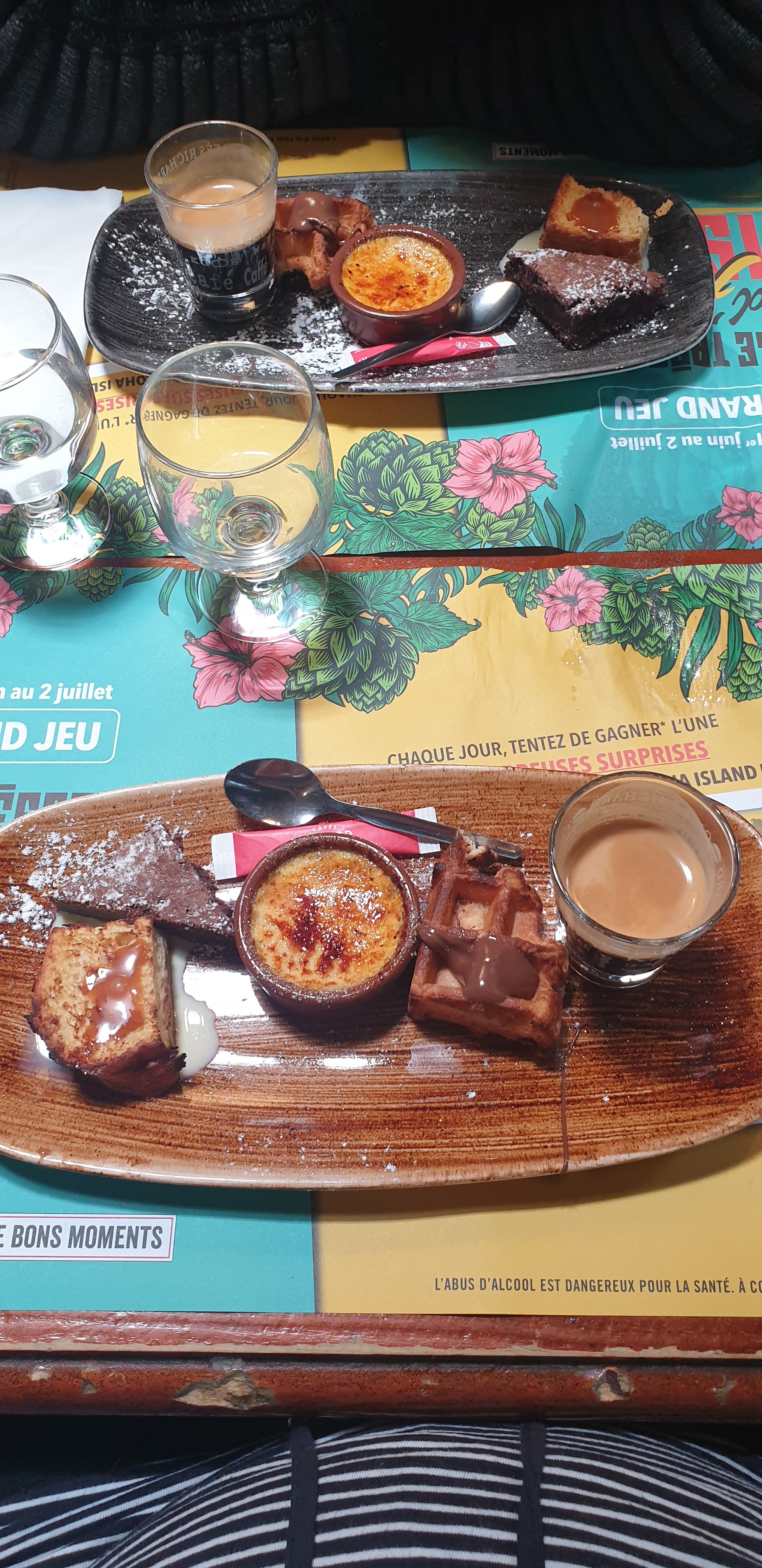 Service et décor impeccable. Je suis déçue par les ingrédients sur les flammekueches qui se sont tellement amoindri que ça n a plus aucun intérêt, j ai pris une complète avec peut être 15gr de viande... je vous déconseille les flams complète les autres avaient l air plus garnis. Les flams sucrées reste encore bonne. Ma fille a adorée la gauffre liégoise. Petit plus nous avons eu les tickets ciné UGC à 7.05€.