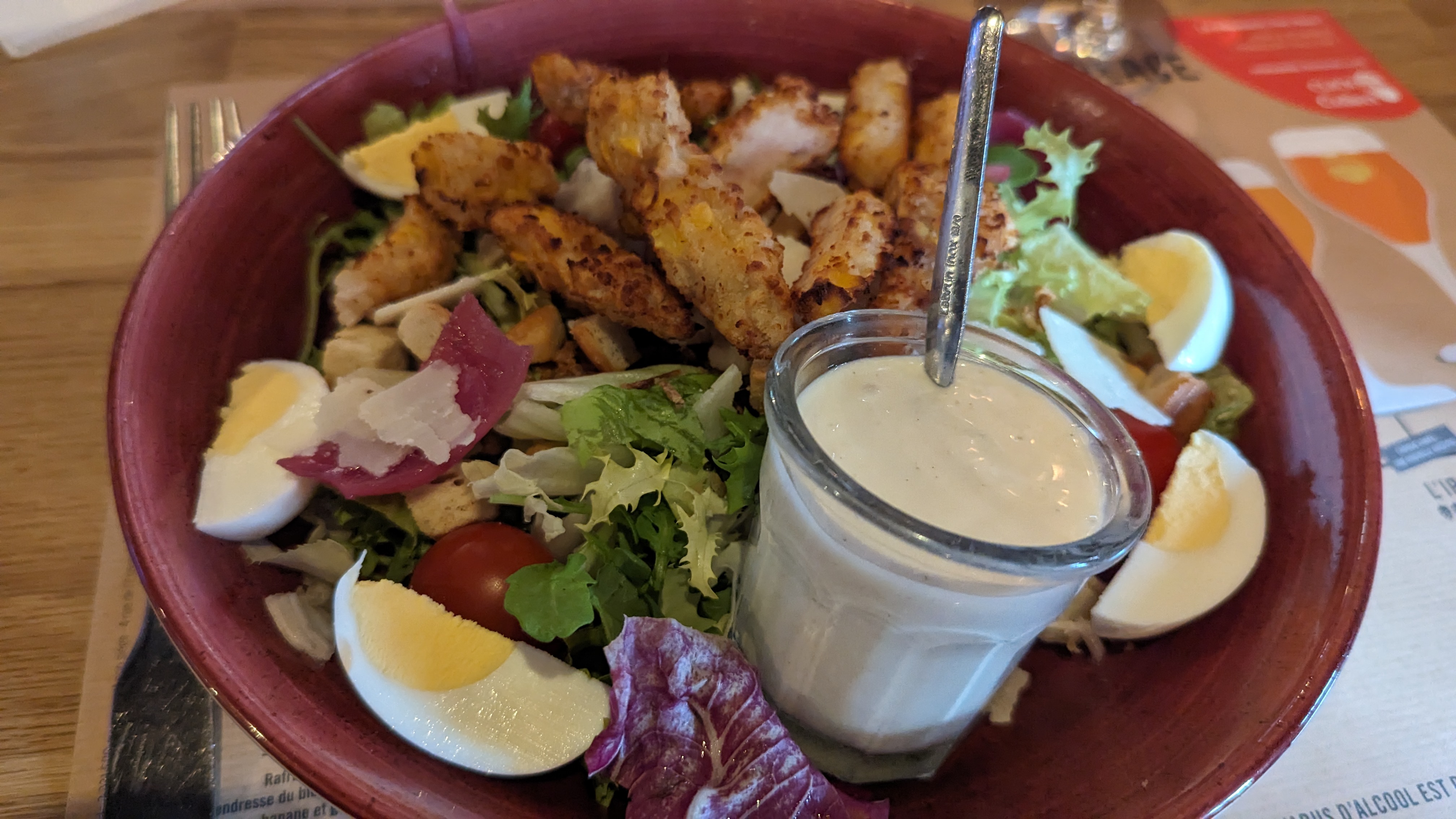 Je suis d'habitude satisfait de ce restaurant mais ce soir j'ai été déçu par la qualité de ce qui m'a été servi. Certains morceaux de poulet de ma salade César étaient secs et la sauce moins bonne de d'habitude. Les oignons étaient très épais et coupés grossièrement. Ressaisissez vous...