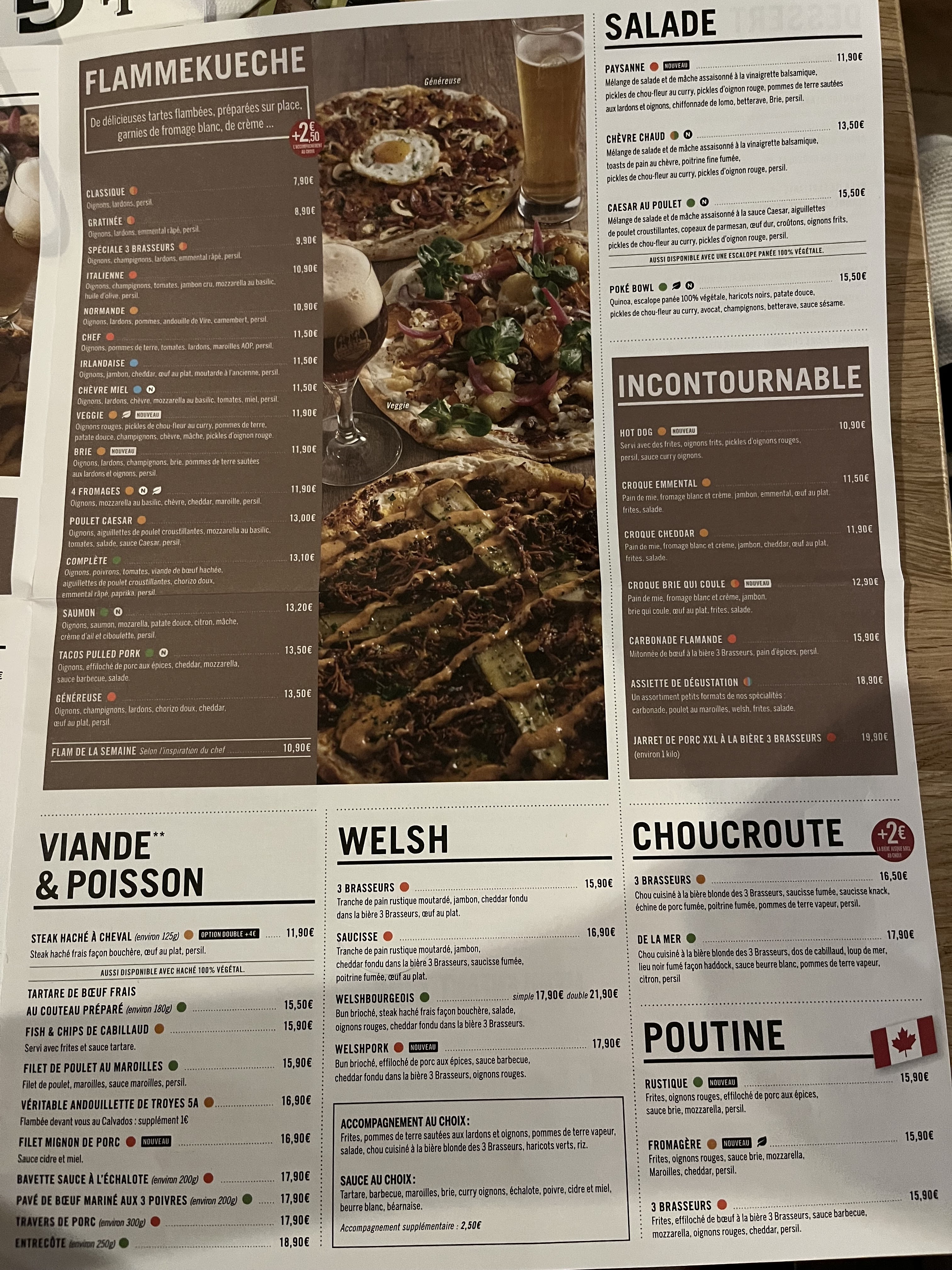 Les flamenkueche très bonnes! les burgers, poutine& sauces des plats industriel a souhait … les desserts et les cafés pas bons… Le service est correct si on oublie la lumière éteinte et la musique a fond juste derrière ma tête toute les 5 minutes pour chaque anniversaire…..