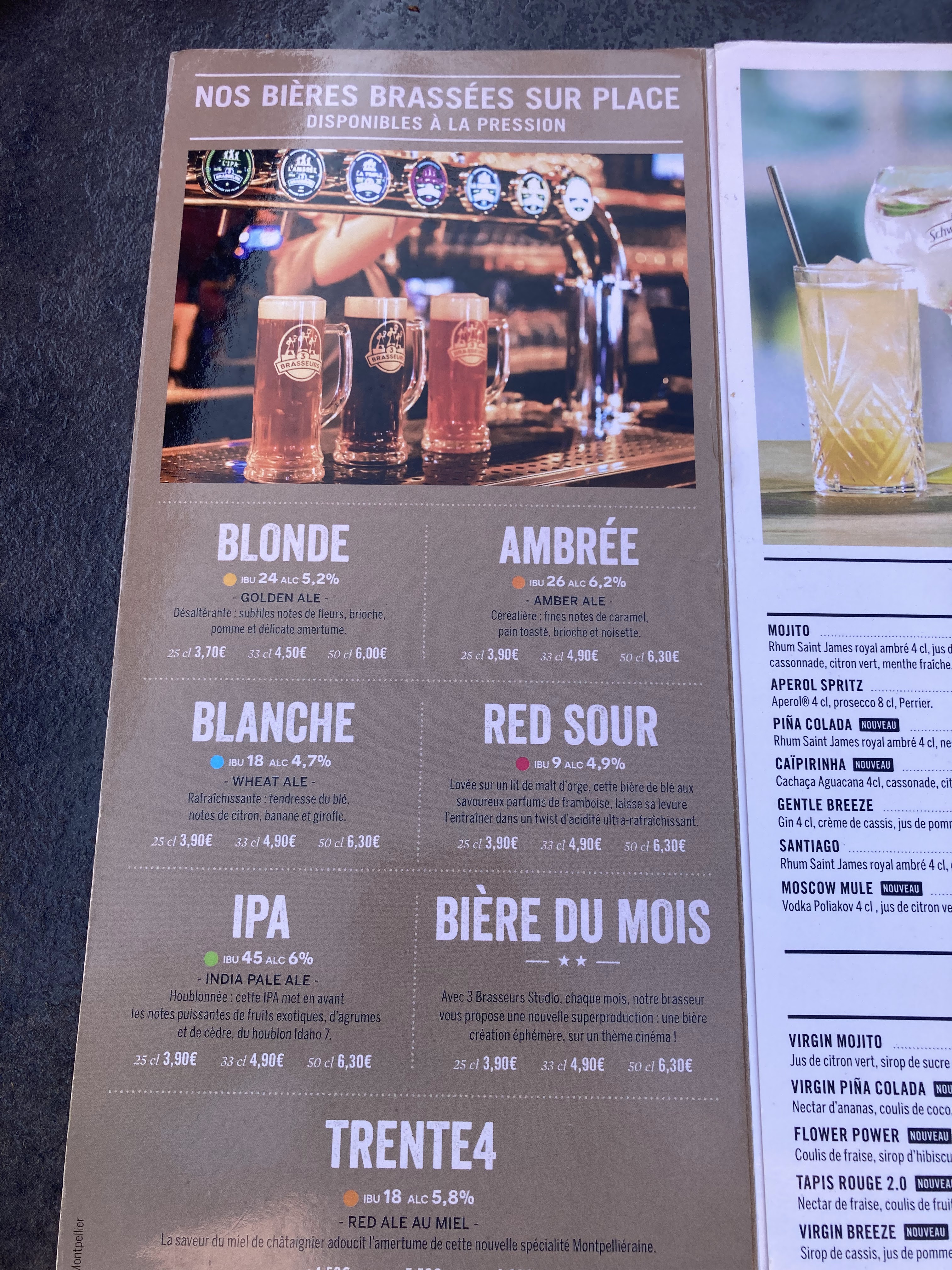 En vrai les bières sont pas mal, mais là le temps d'attente c'était un peu trop long. Genre on a attendu longtemps à attendre que les plats arrive. En plus, j'avais un train à la gare de Montpellier saint Roch dans le centre de Montpellier à prendre pour faire un trajet en train Gare Montpellier Saint-Roch à Paris en train jusqu'à Paris. Donc c'était contraignant, d'autant qu'il manquait des produits de la carte alors qu'ils étaient présents sur la carte mais pas disponibles en restaurant sur place. La nourriture est bonne avec bon goût à part ça, mais attention aux jours de fortes affluence avec du monde quand y a bcp de gens. La bise