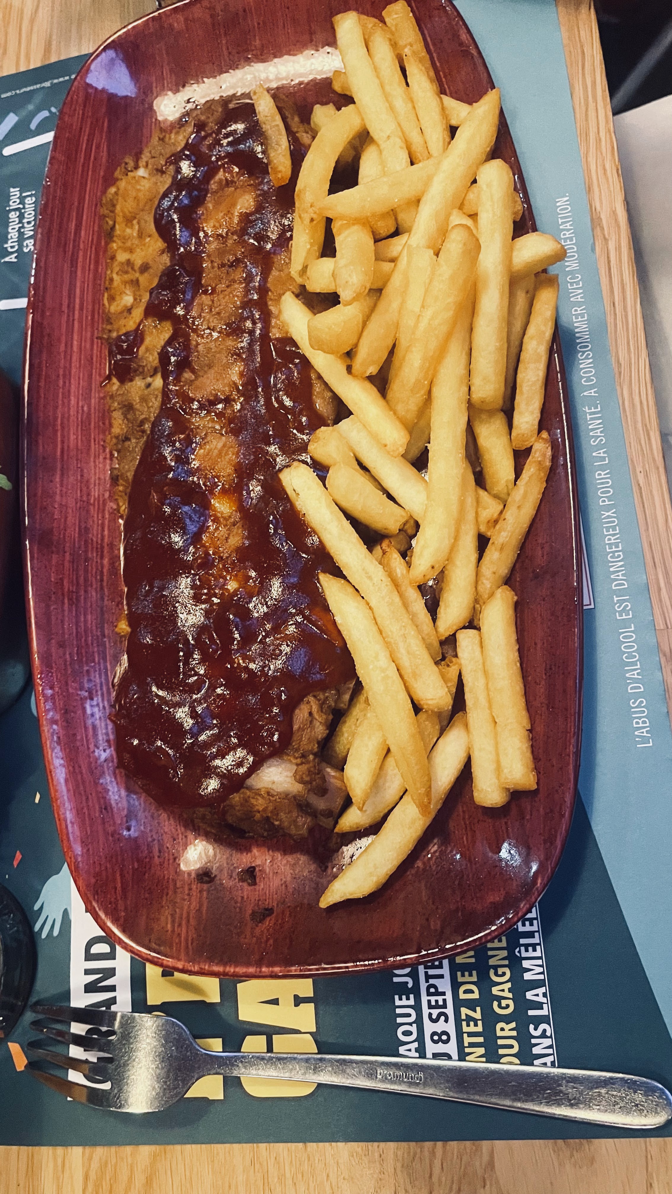 Bon accueil parfois on s’est senti un peu oublié mais y avait du monde ça se comprends . C’était bon sans être exceptionnel les ribs étaient noyés dans la sauce barbecue elles auraient pu être meilleures . Le dessert était un pain perdu noyés dans la crème anglaise pas ouf mais la glace à la vanille était bonne