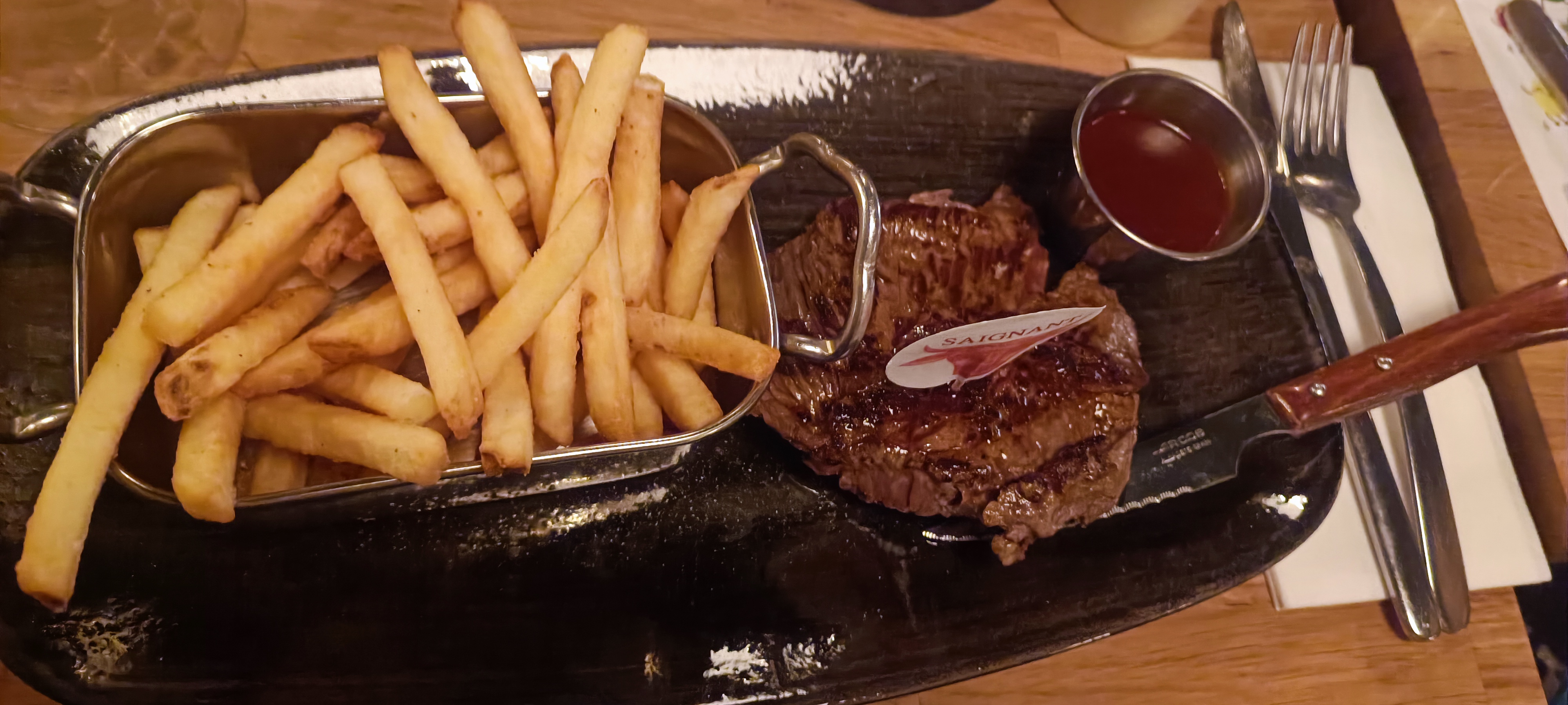 Cuisine diverse et variée, bonne maîtrise de la cuisson, serveurs agréables et aux petits soins (un peu speed, mais compréhensible vu le nombre de clients). Décoration chaleureuse, même si la salle principale est masquée de l'extérieur par des structures de brassage (atypique). On ne s'attendait pas à grand chose d'une enseigne franchisée, mais nous avons été très agréablement surpris. Viande parfaite mais salade un peu fade (aucun assaisonnement).