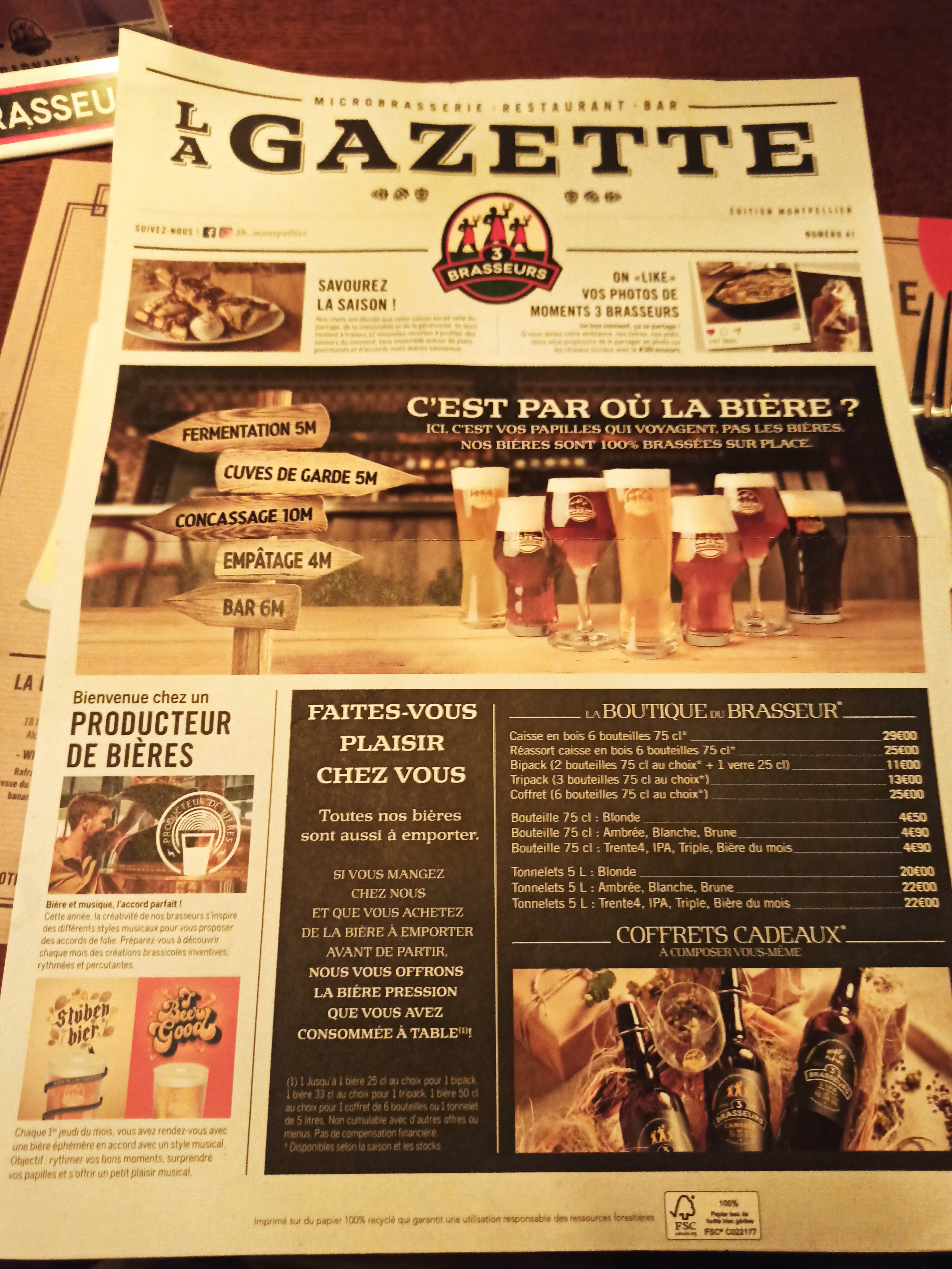Aux 3 brasseurs, ils brassent leurs propres bières artisanales. C’est plutôt cool et elles sont assez bonnes. La nourriture est assez simple et de qualité moyenne. La carte est fournie de plats habituels efficaces sans originalité (pizzas, burgers, flammekuches, viandes…) Le service est sympathique mais très expéditif. On sent que les serveurs sont sous pression les soirs de rush et qu’ils n’ont pas trop de temps pour nous. Aux 3 brasseurs il faut que ça brasse, et pas que de la bière. Il faut aussi que ça brasse des clients, plus on nous sert vite, plus il y a de nouveaux qui rentrent vite et, mieux c’est pour le chiffre. Cette façon de procéder me rend personnellement très mal à l’aise. On se sent comme si on était de trop ou encore comme si l’on dérangeait. En tout cas on ne s’y sent pas super à l’aise à cause de ce climat anxiogène du vite vite vite, palpable. Pas très fan de ce lieux, ça dépanne, mais il y a bien mieux sur Montpellier