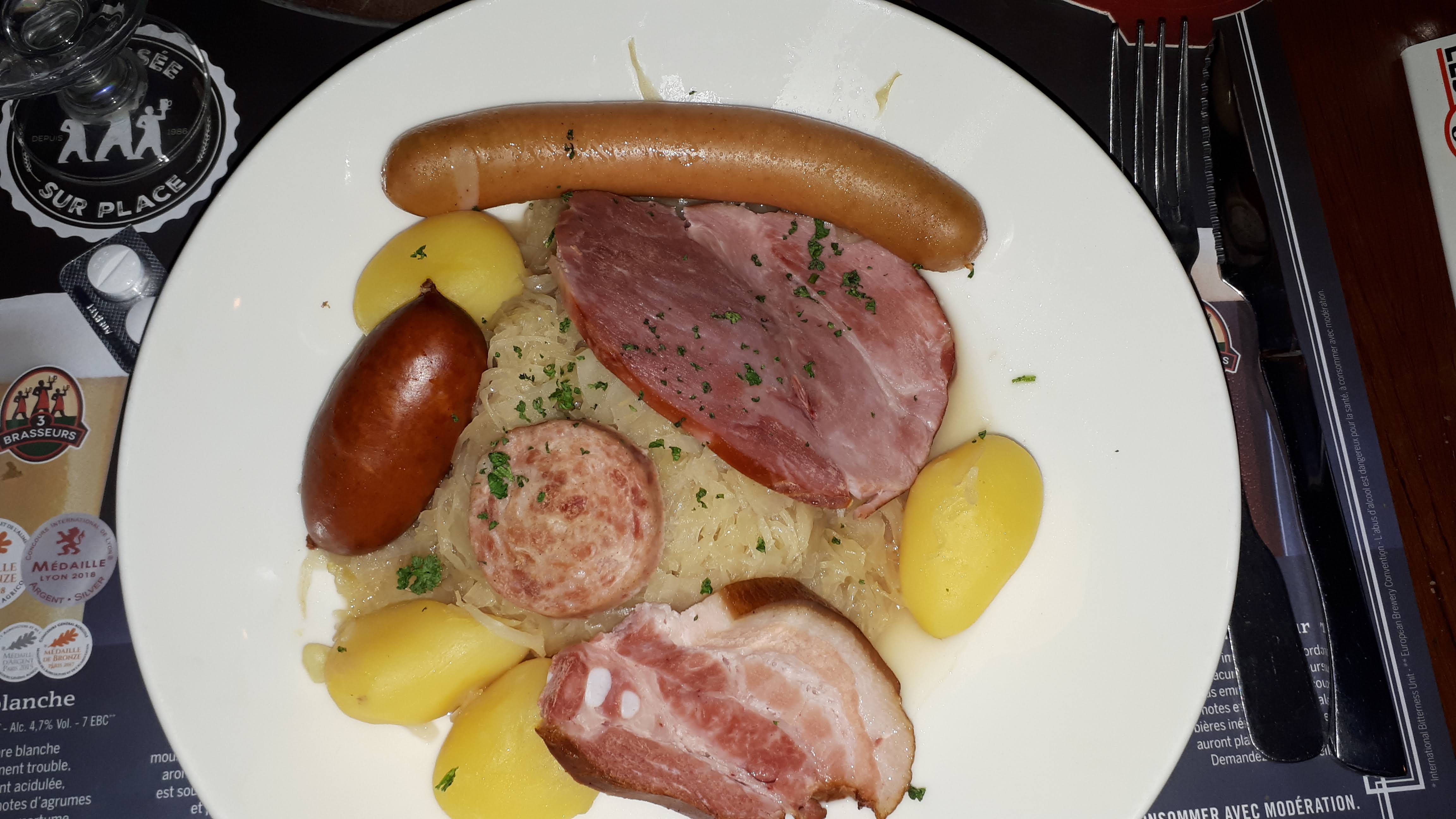 Mon épouse a pris Une flemmkuch immangeable la pâte était dure à mon avis préparée à l'avance et pour moi une choucroute des 3 brasseurs très moyenne. Une boule de choux avec 3 bouts de viandes et saucisse autour .il faut que les cuisiniers aillent faire un tour en Alsace pour voir ce qu'estune choucroute. Tout cela a bien régresser et c'est dommage. Heureusement les serveurs sont très sympa.