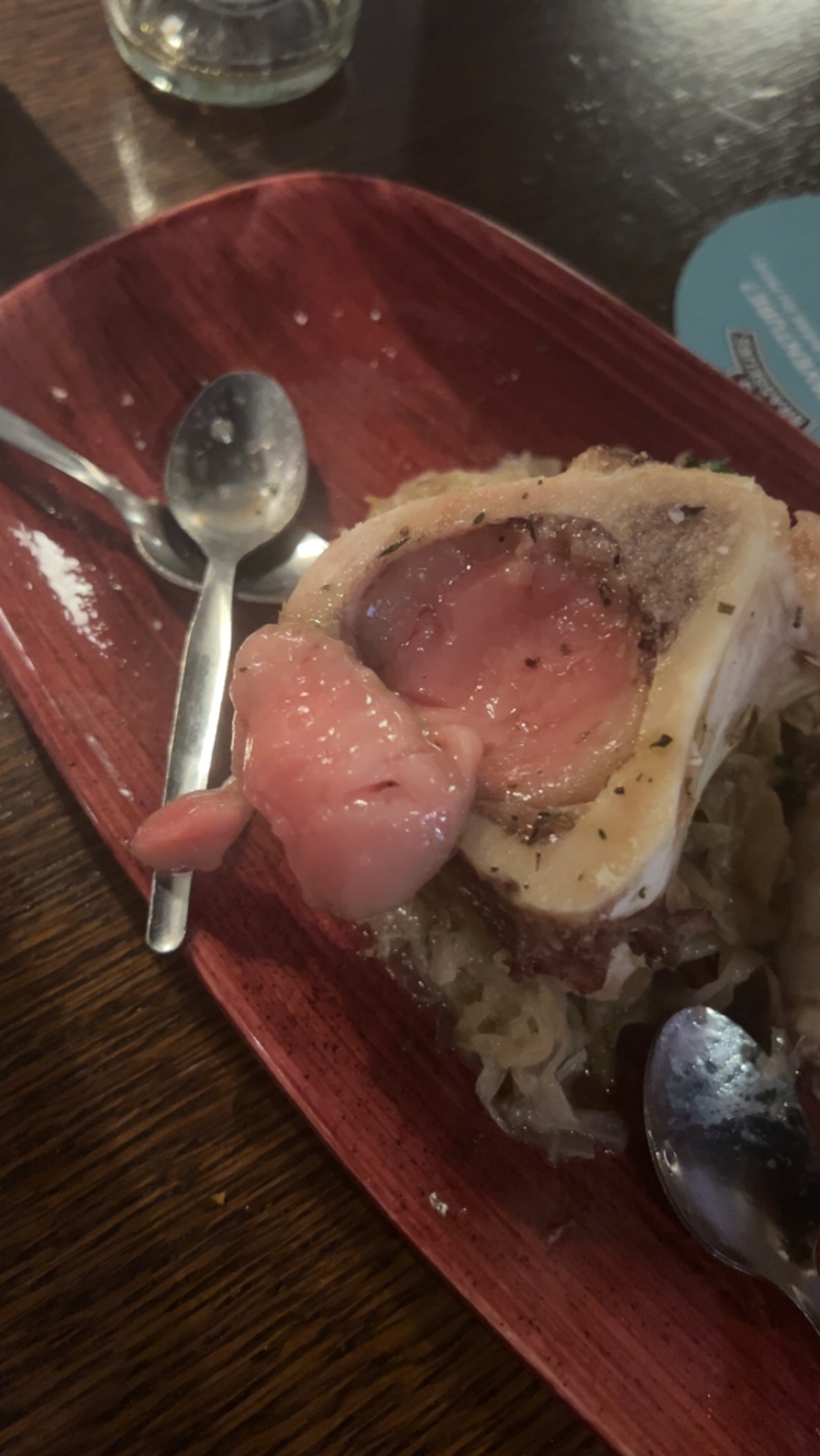 Nous avons demandé les OS à mouelles en entrée servi en premier sans le plat. Tout est arrivé en même temps ??? Avec le sourire le plat est reparti en cuisine mais laissé dans un coin et servi quand l'entrée était fini. Mais froide.... 🥴 L'os à mouelles délicieux. Pour finir ont demande une crêpe toujours servi froide. Le staff cuisine est a changé.