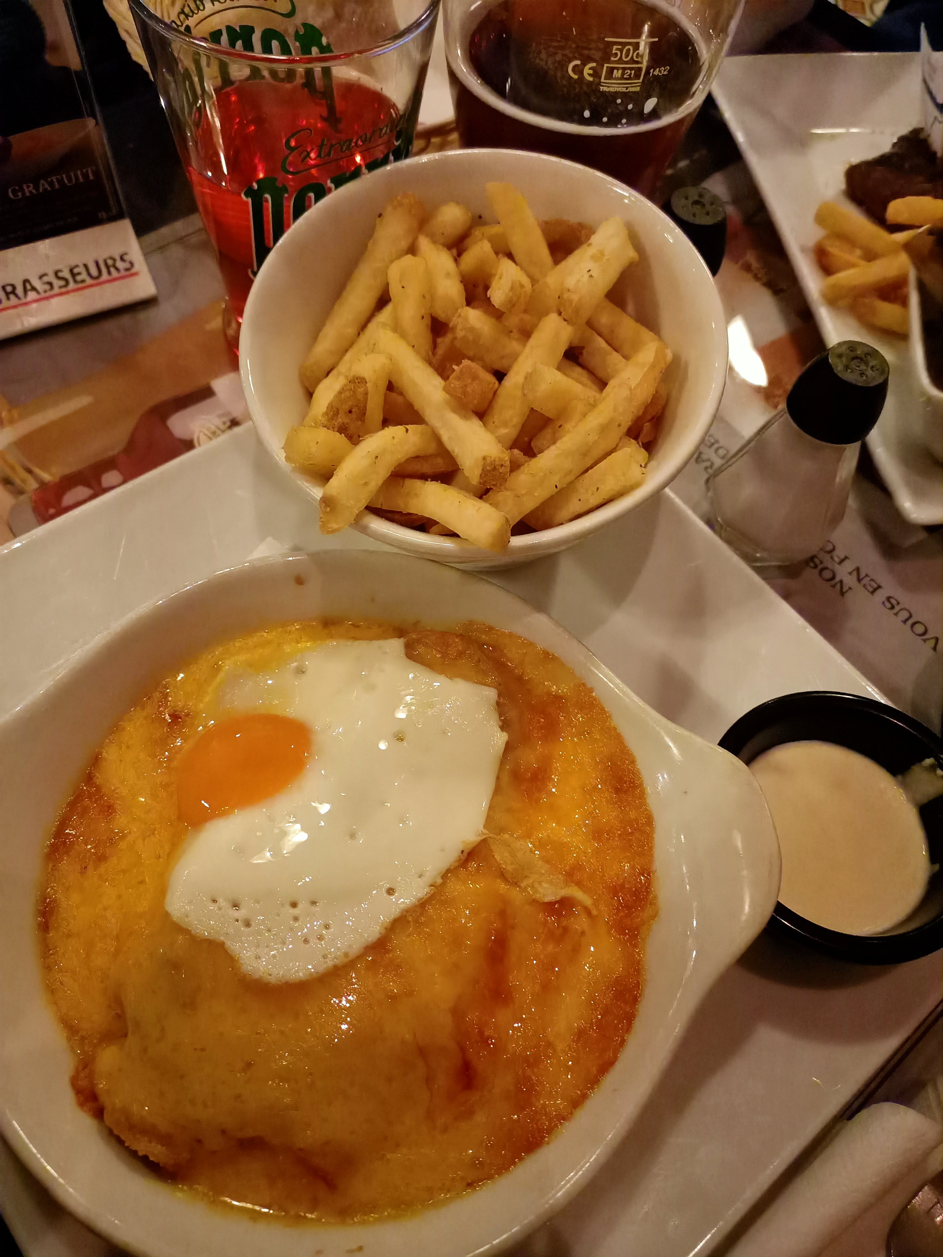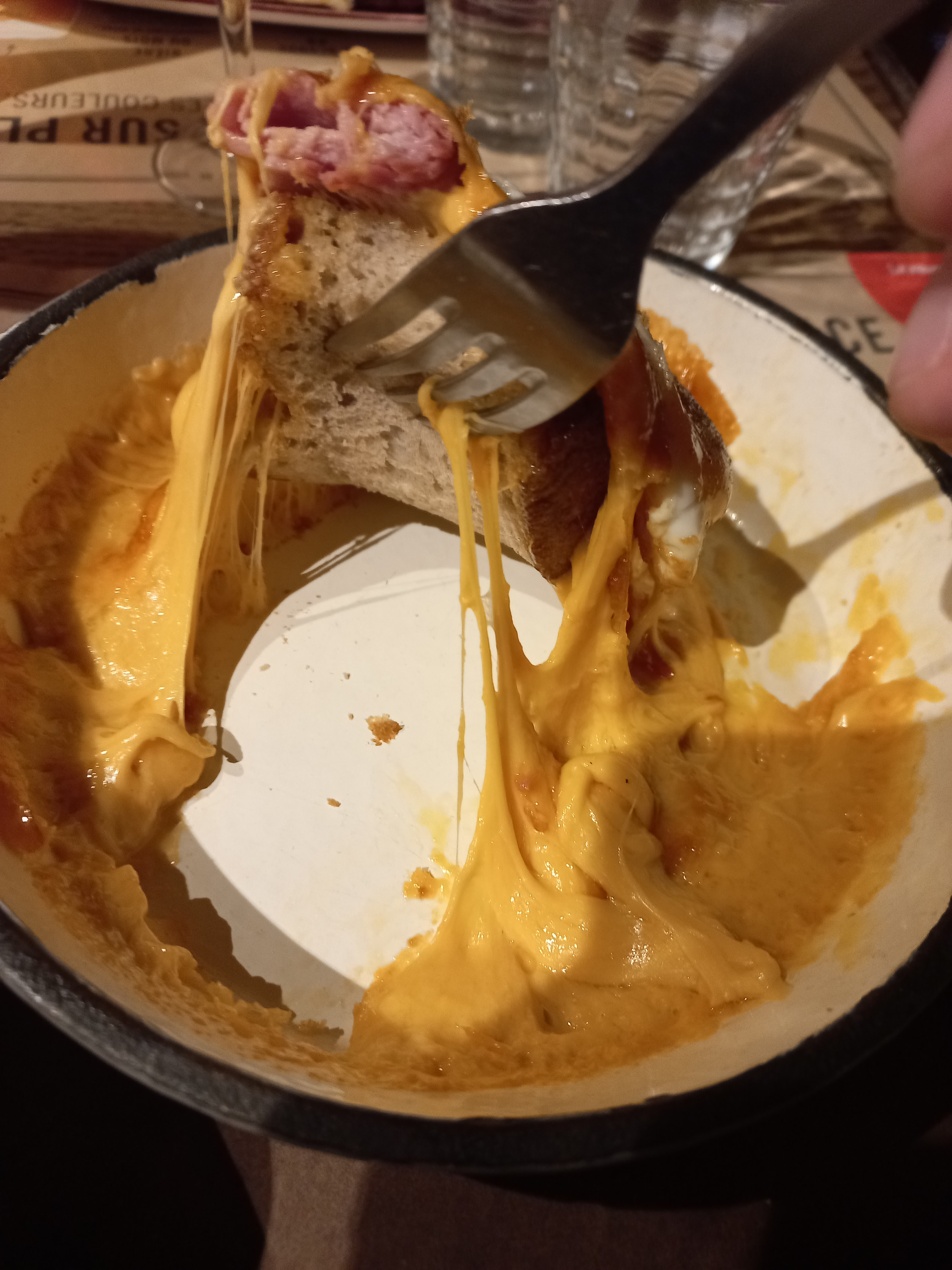 Venus pour dîner, nous avons été reçu convenablement et service correctement. Nous avons eu un soucis sur un plat mais la serveuse nous a réglé cet incident ! Pour la photo, j’ai choisi le croque cancoillotte, il est très bon mais bourratif et compact. Pour ceux qui n’aiment pas le formage évitez sinon régalez vous ! Et pour le dessert une mousse au chocolat noir (qui ressemble plus à du chocolat au lait) avec du caramel beurre salé (qui ressemble plus à du duce de leche), je ne la recommande pas Malheureusement, avec le temps, nous sentons que la qualité de certains produits baisse et que les quantités s’amoindrissent…