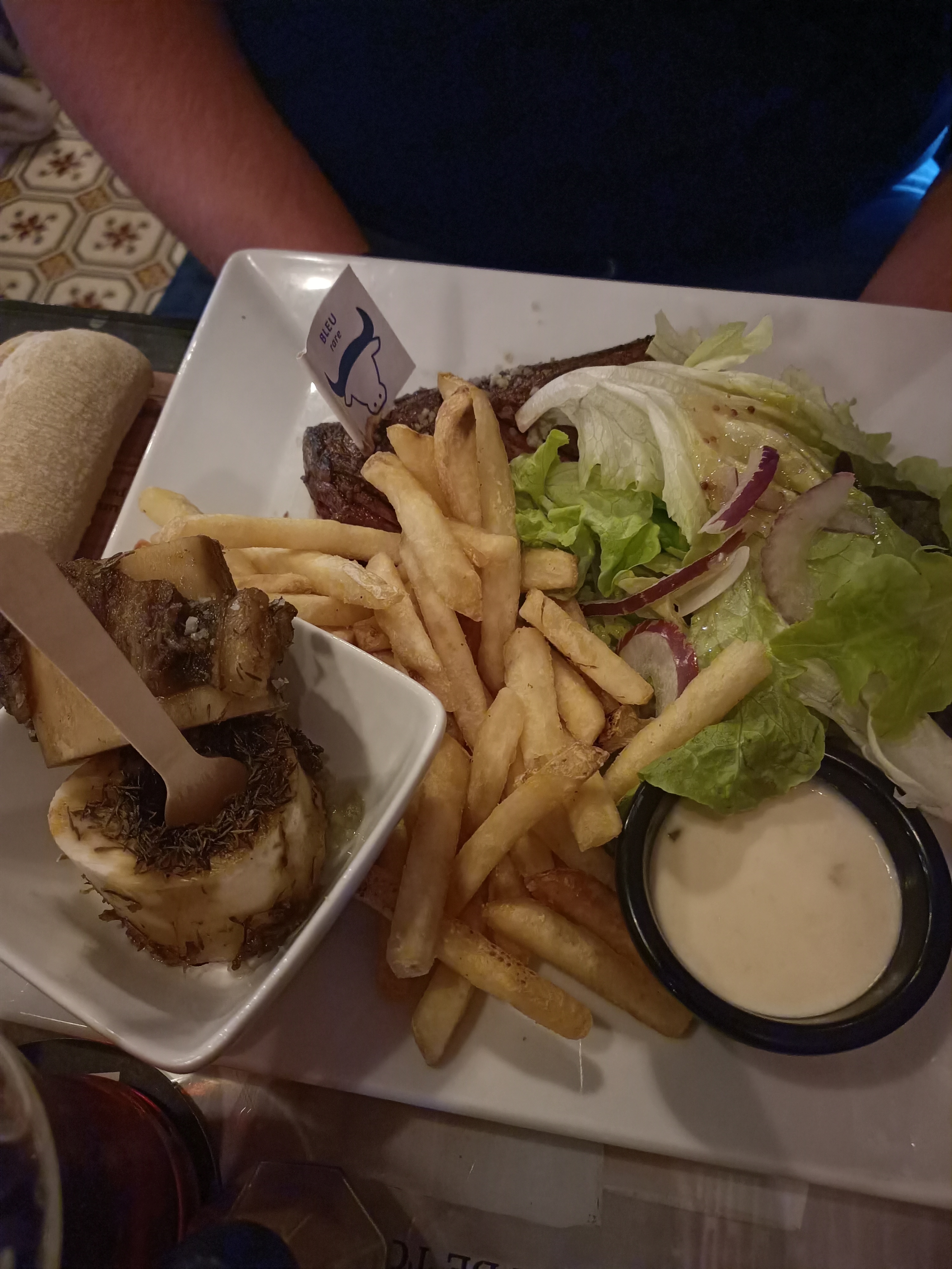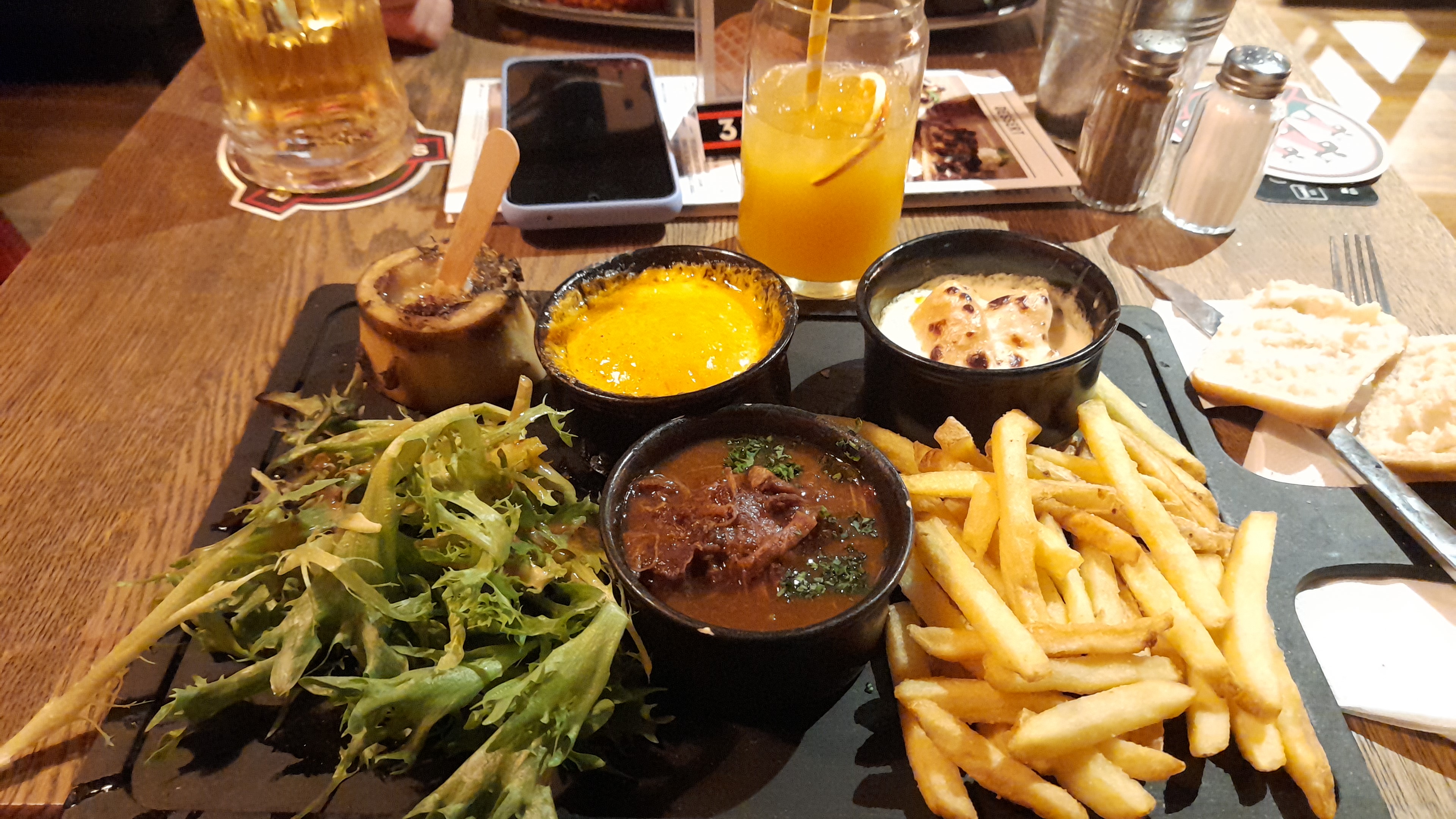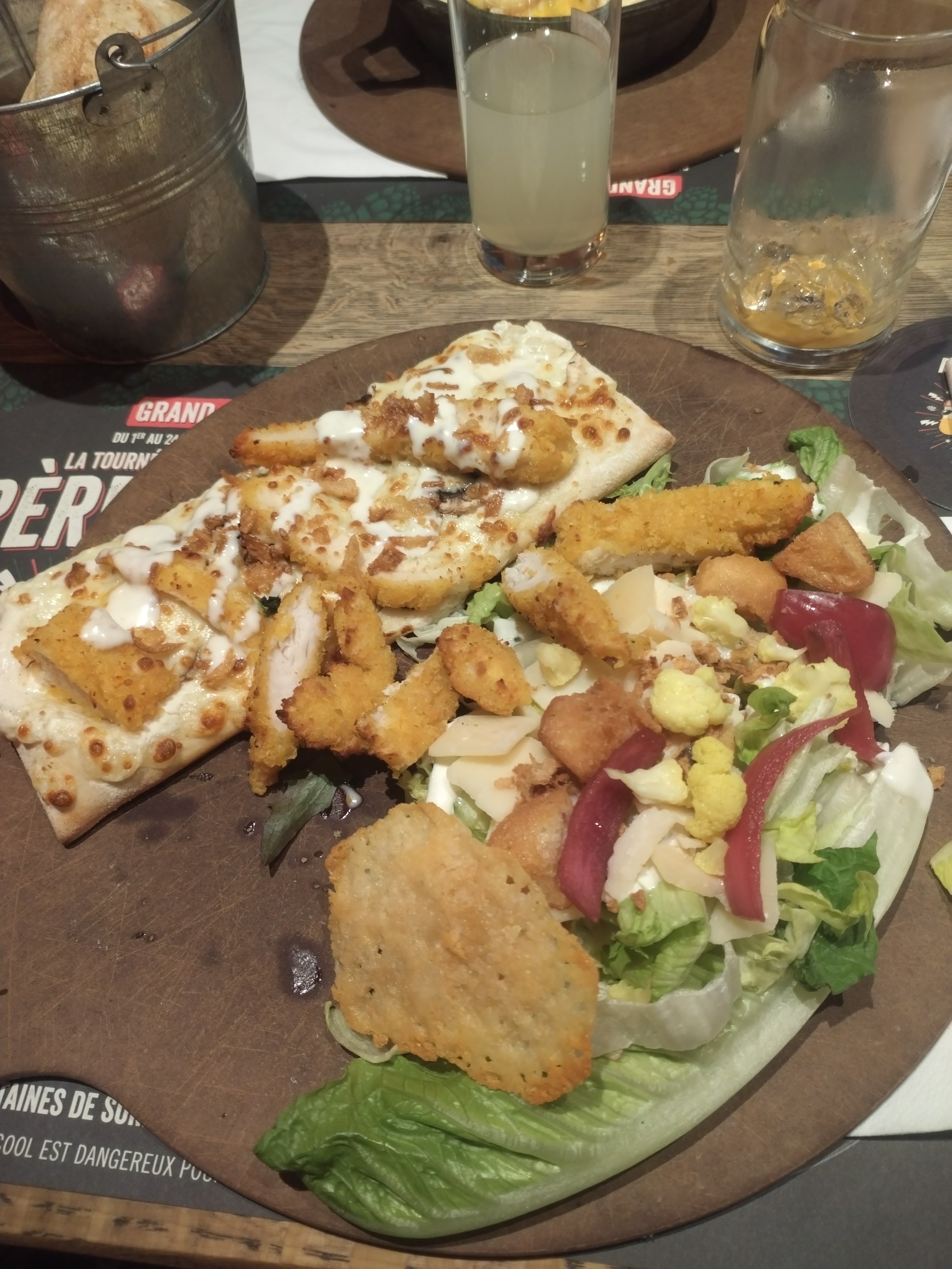 Salade peu garnies ( beaucoup d’oignons rouge). Les toasts aux chèvres ne sont pas assez assaisonnés. Pour le carppacio de bœuf dommage pas suffisamment d’assaisonnement.. mais frites très bonne !! Personnel de salle très accueillant et sympathique!