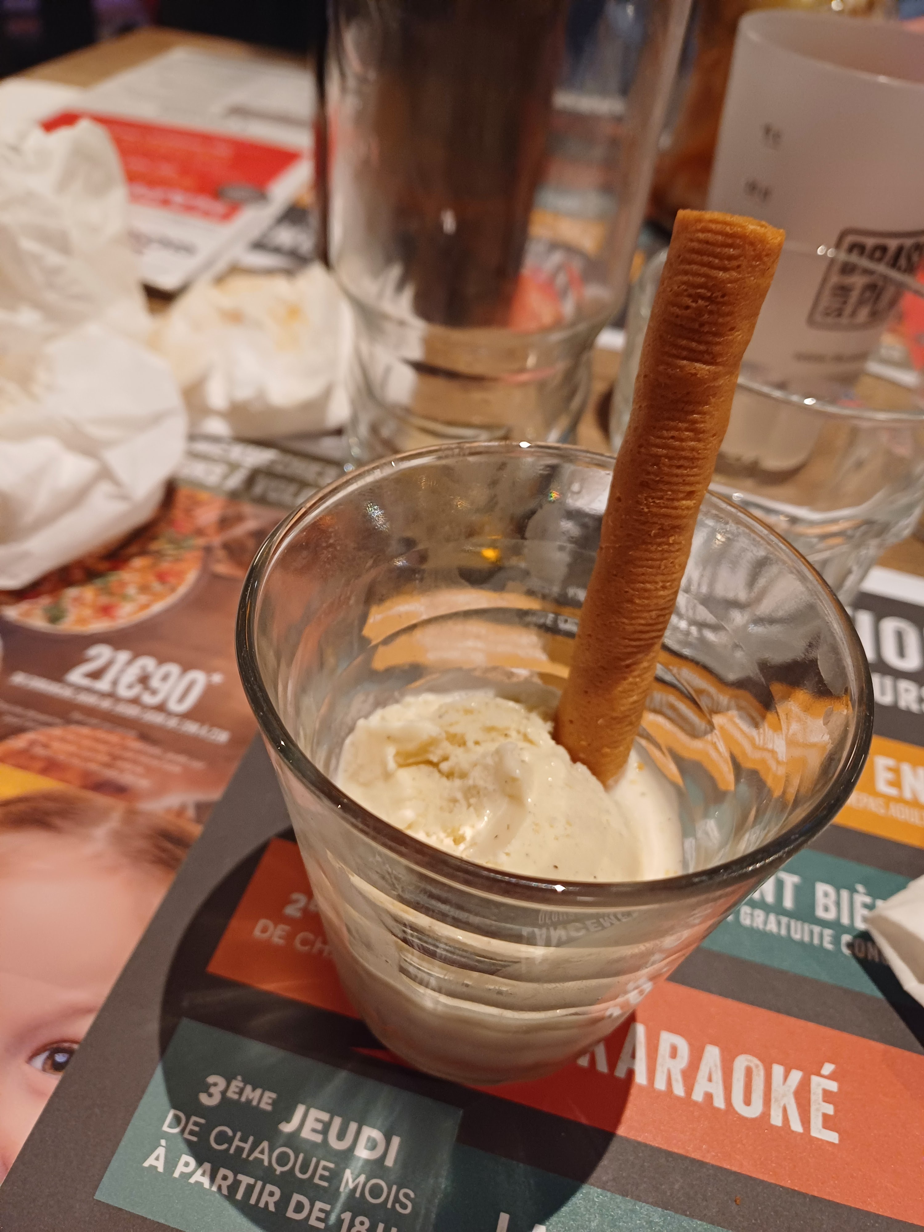 Service à désirer… Entre deux serveurs ils ne disent pas pareil… On me sert une dame blanche dans un petit verre avec seulement deux boules de glace… autant prendre une glace deux boules ça revient moins chère.
