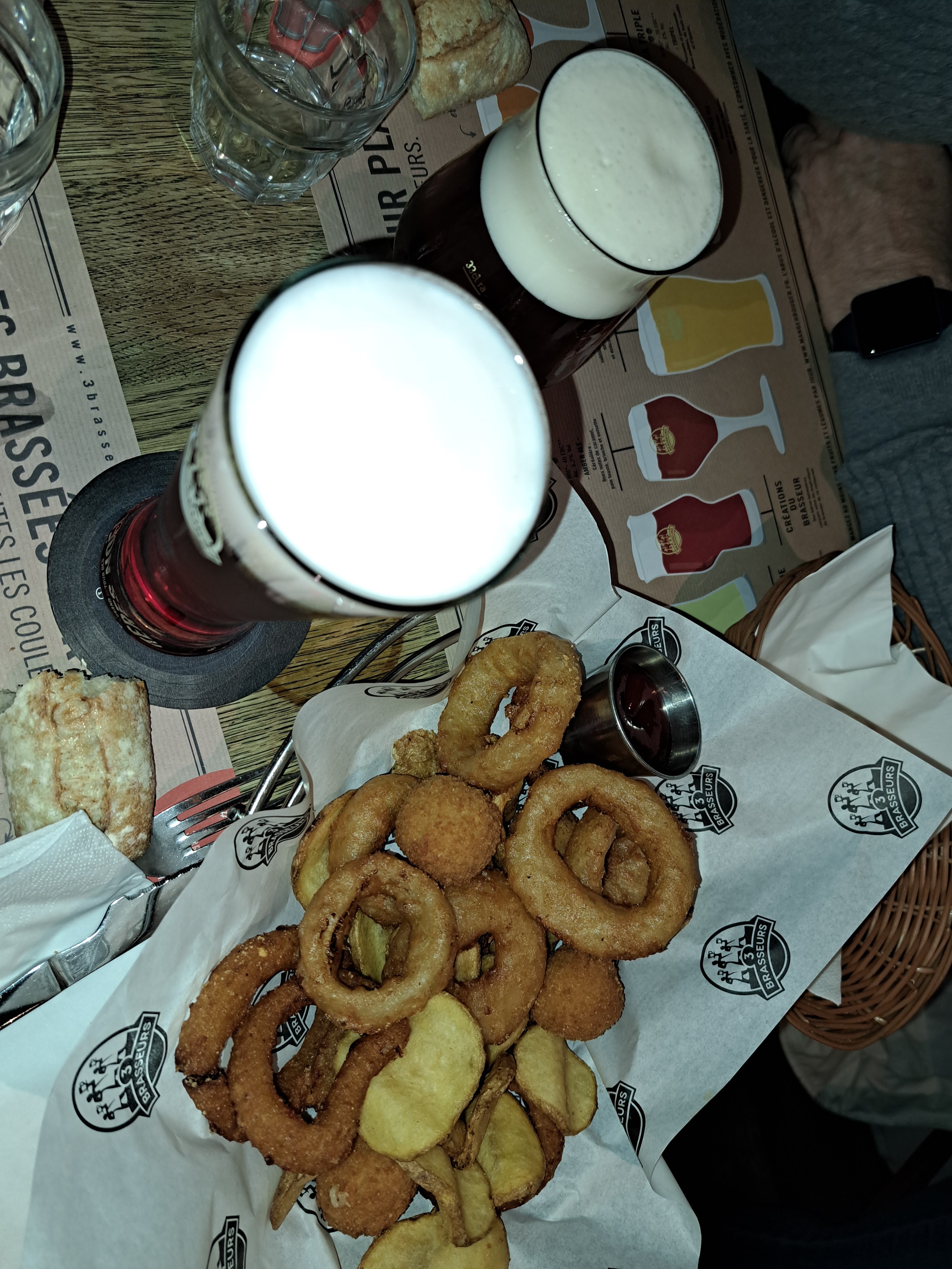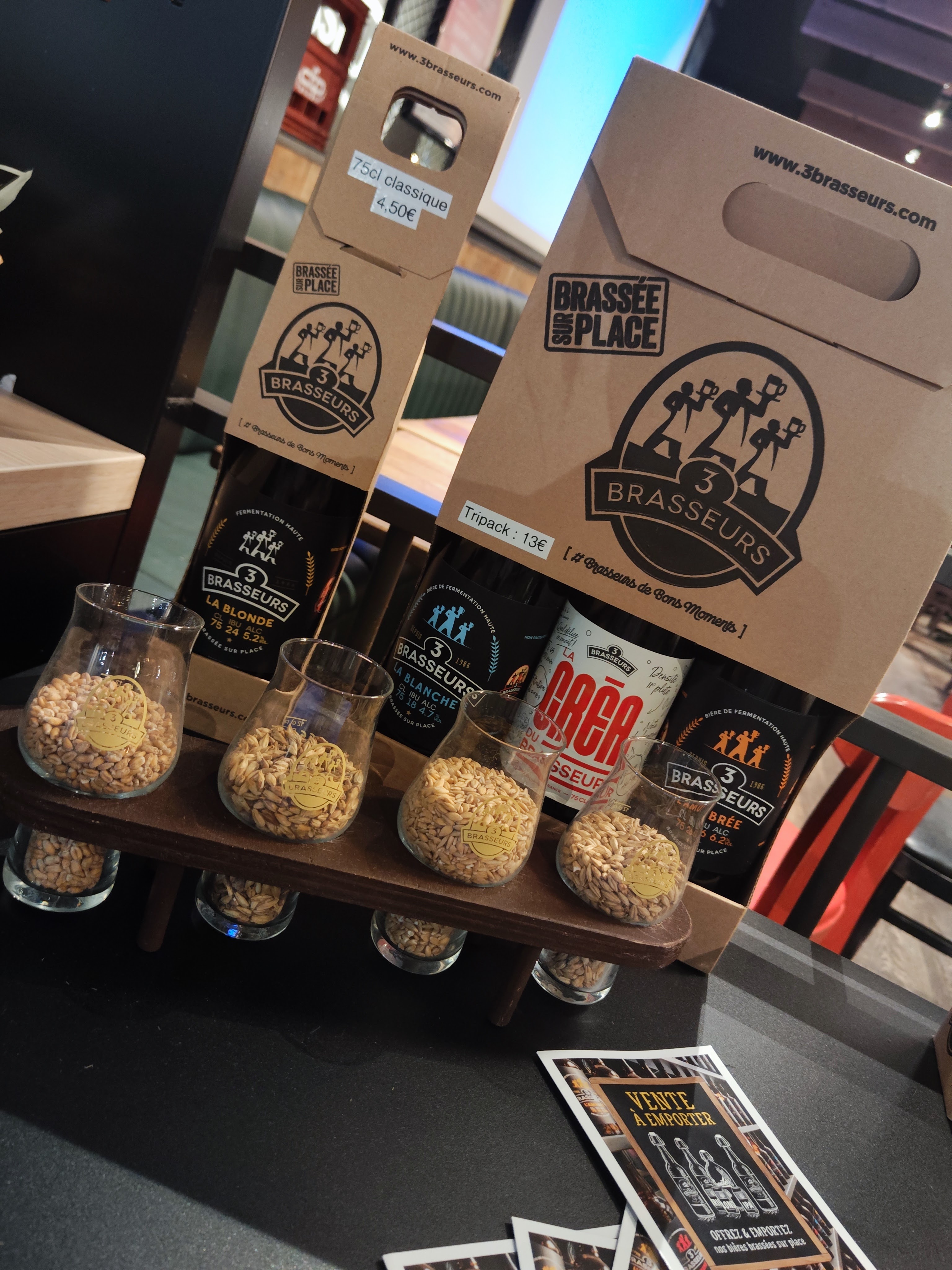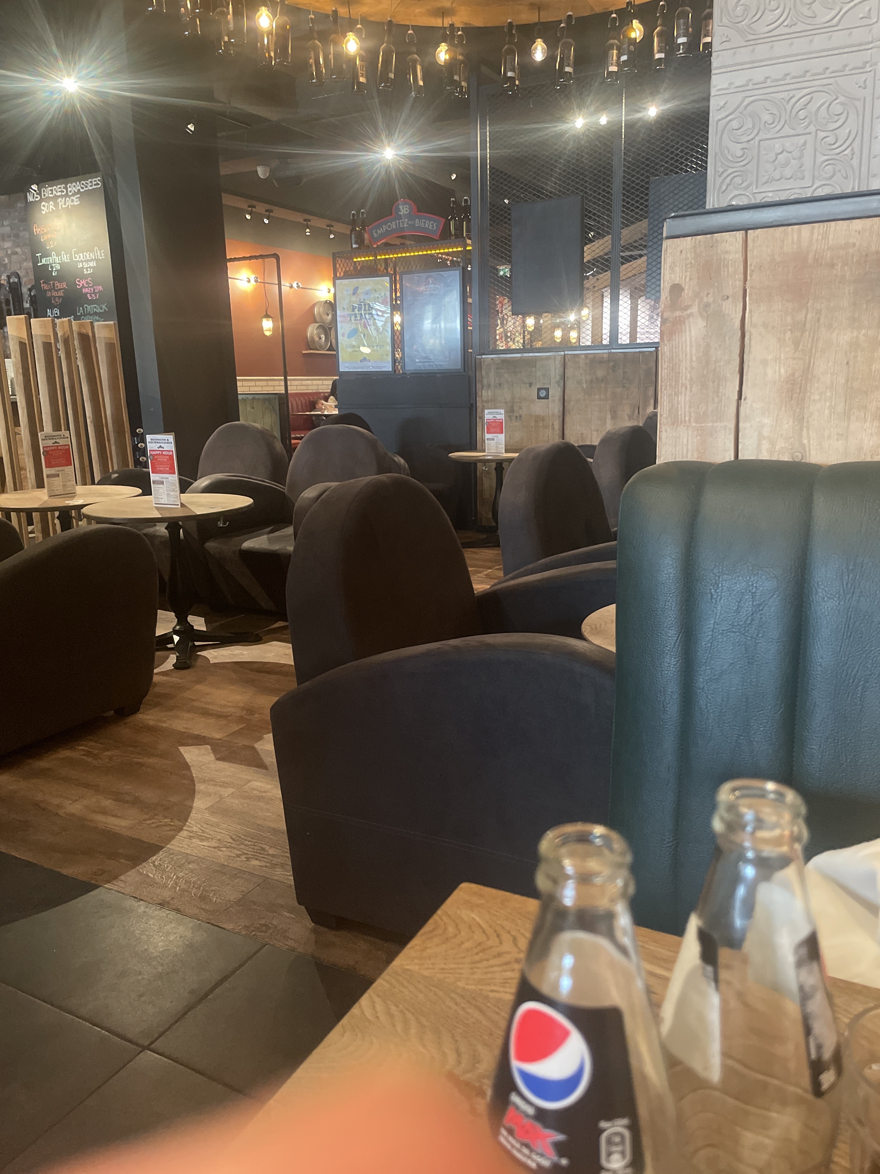 HORRIBLE Un pain de qualité une viande de qualité voici les seuls point positif que je donnerai à ce restaurant. Même en pesant mes mots je ne peux m'empêcher de dire que c'est la pire prestation que j'ai jamais eu dans un restaurant. 35 minutes pour recevoir 4 boissons, 1h40 pour recevoir 3 burgers (qui ont été réchauffer nous a dit le cuistot parce que notre 4e plat, une poutine a été très long à faire cuire) Des serveurs parlants en français plus que douteux. Je cite la serveuse '' c'est nous qu'on fait la bière '' Un exemple parmi tant d'autres. Ajouter à cela un service effectuer par 4 serveurs différents. Dont un des serveurs qui n'arrivais même pas à porter correctement 3 verres une bouteille en verre de Coca-Cola sans que la bouteille ne glisse sur le plateau : évident lorsqu'on pose une bouteille cylindrique sur un plateau. Un pot de ketchup Heinz, sur lequel lors de son ouverture nous avons pu retrouver de magnifiques résidu de ketchup datant de moins un jour. Bien évidemment on me répondra que le restaurant a fait un geste commercial en nous offrant une boisson à chacun mais au prix de la prestation à savoir 21 € je trouve ça inadmissible. Même au vu du geste commercial qui il me semble était indispensable. Bien évidemment tout ceci a déjà été reporté au gérant qui m'a confirmer que c'était l'une des meilleures ouverture de la chaîne de restaurant Les trois brasseurs. Je peux comprendre que au vu de la situation sanitaire actuelle des formations aient été insuffisante. Mais ceci n'explique pas tout. PS : n'ayez pas trop faim car même les quantités sont incroyablement ridicule.