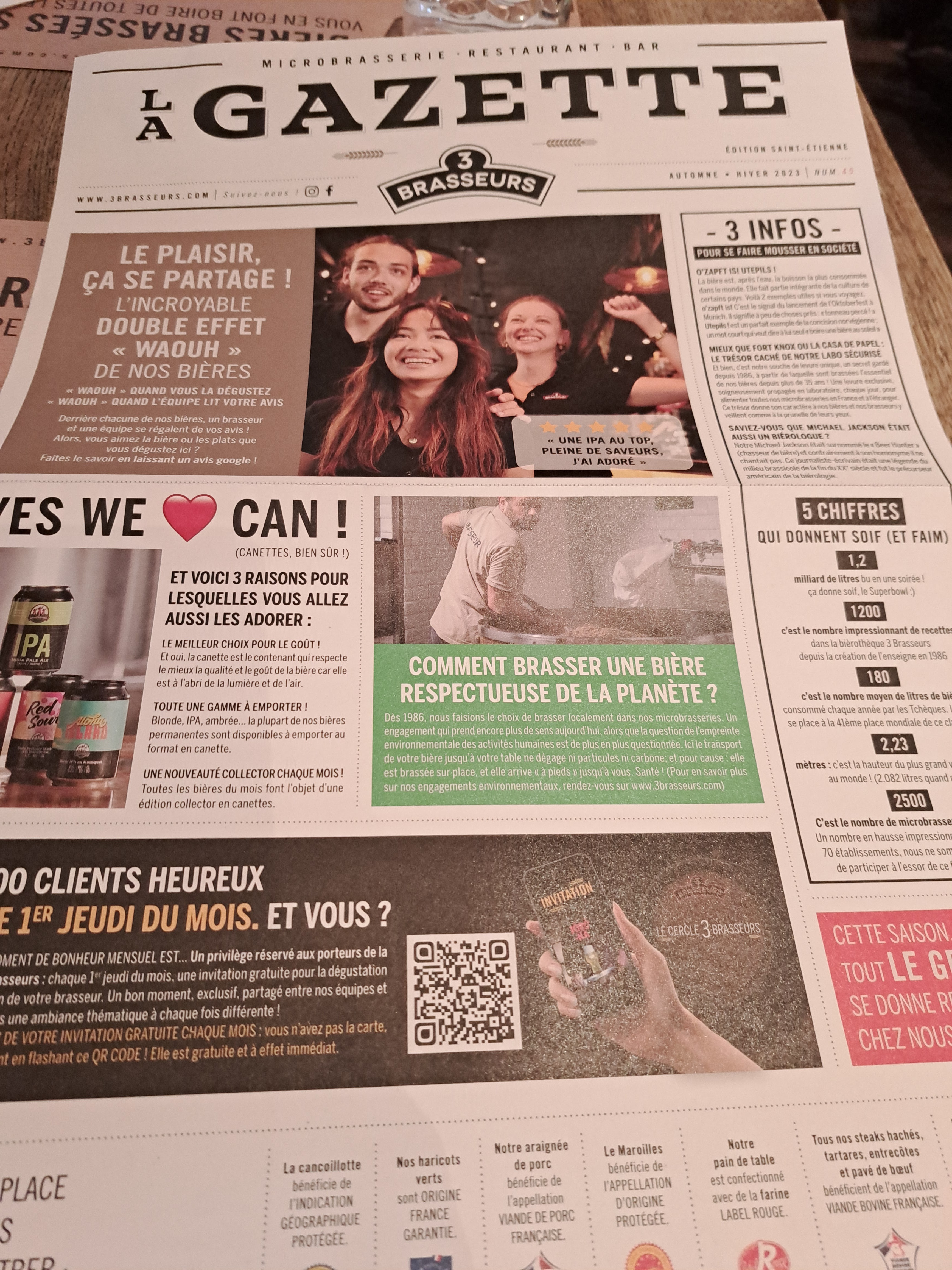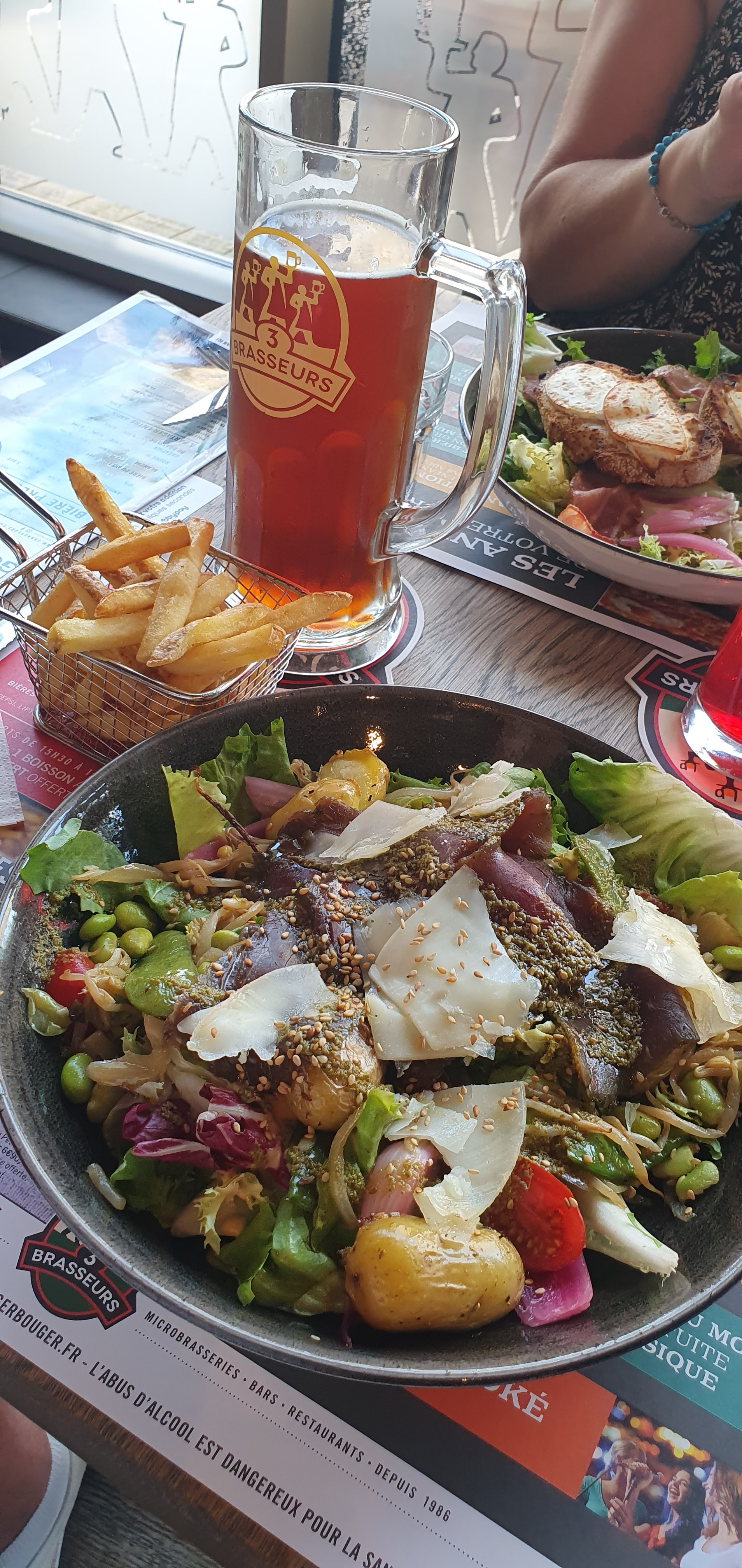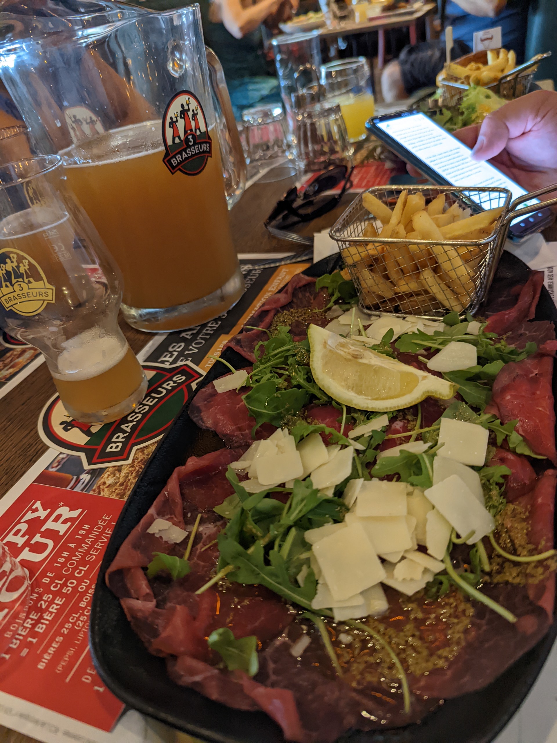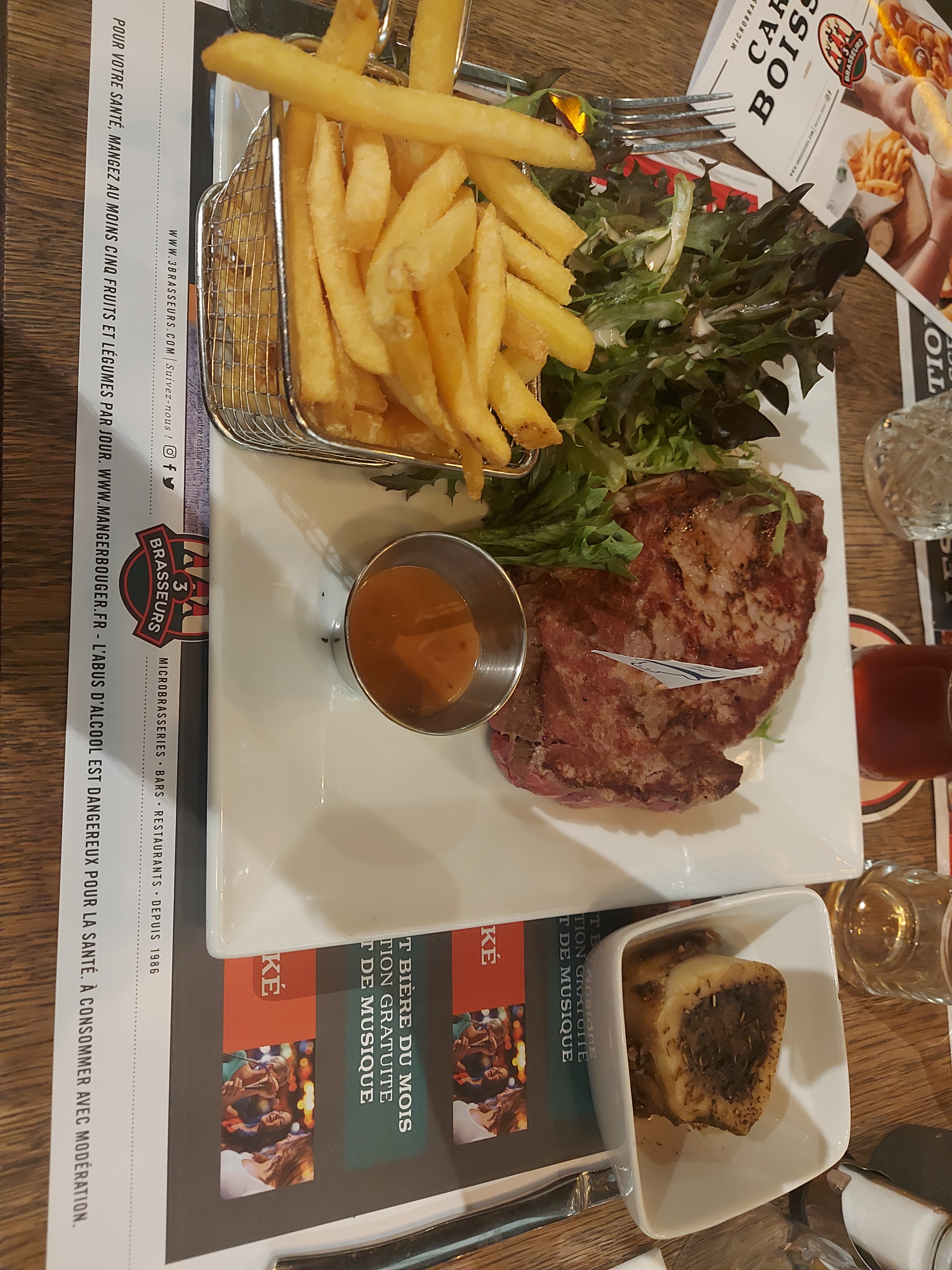 HORRIBLE Un pain de qualité une viande de qualité voici les seuls point positif que je donnerai à ce restaurant. Même en pesant mes mots je ne peux m'empêcher de dire que c'est la pire prestation que j'ai jamais eu dans un restaurant. 35 minutes pour recevoir 4 boissons, 1h40 pour recevoir 3 burgers (qui ont été réchauffer nous a dit le cuistot parce que notre 4e plat, une poutine a été très long à faire cuire) Des serveurs parlants en français plus que douteux. Je cite la serveuse '' c'est nous qu'on fait la bière '' Un exemple parmi tant d'autres. Ajouter à cela un service effectuer par 4 serveurs différents. Dont un des serveurs qui n'arrivais même pas à porter correctement 3 verres une bouteille en verre de Coca-Cola sans que la bouteille ne glisse sur le plateau : évident lorsqu'on pose une bouteille cylindrique sur un plateau. Un pot de ketchup Heinz, sur lequel lors de son ouverture nous avons pu retrouver de magnifiques résidu de ketchup datant de moins un jour. Bien évidemment on me répondra que le restaurant a fait un geste commercial en nous offrant une boisson à chacun mais au prix de la prestation à savoir 21 € je trouve ça inadmissible. Même au vu du geste commercial qui il me semble était indispensable. Bien évidemment tout ceci a déjà été reporté au gérant qui m'a confirmer que c'était l'une des meilleures ouverture de la chaîne de restaurant Les trois brasseurs. Je peux comprendre que au vu de la situation sanitaire actuelle des formations aient été insuffisante. Mais ceci n'explique pas tout. PS : n'ayez pas trop faim car même les quantités sont incroyablement ridicule.