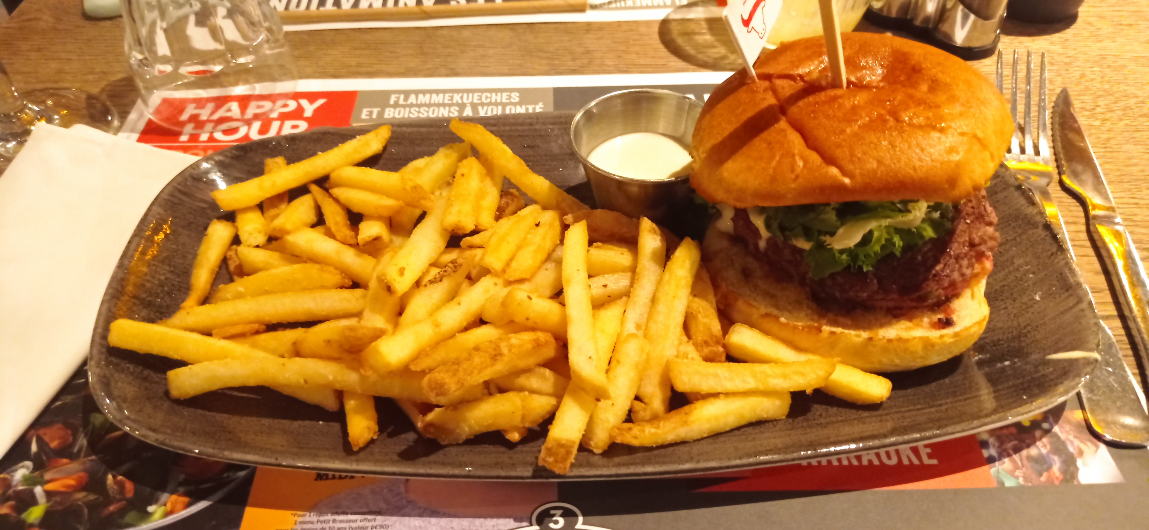Arrivé à table le serveur vient nous voir ni bonjour ni rien. Le service est très long pour prendre la commande, pour servir les plat. Nous avons commandé des burgers rien d'extraordinaire petit burger par la taille. Plus bon que beau.